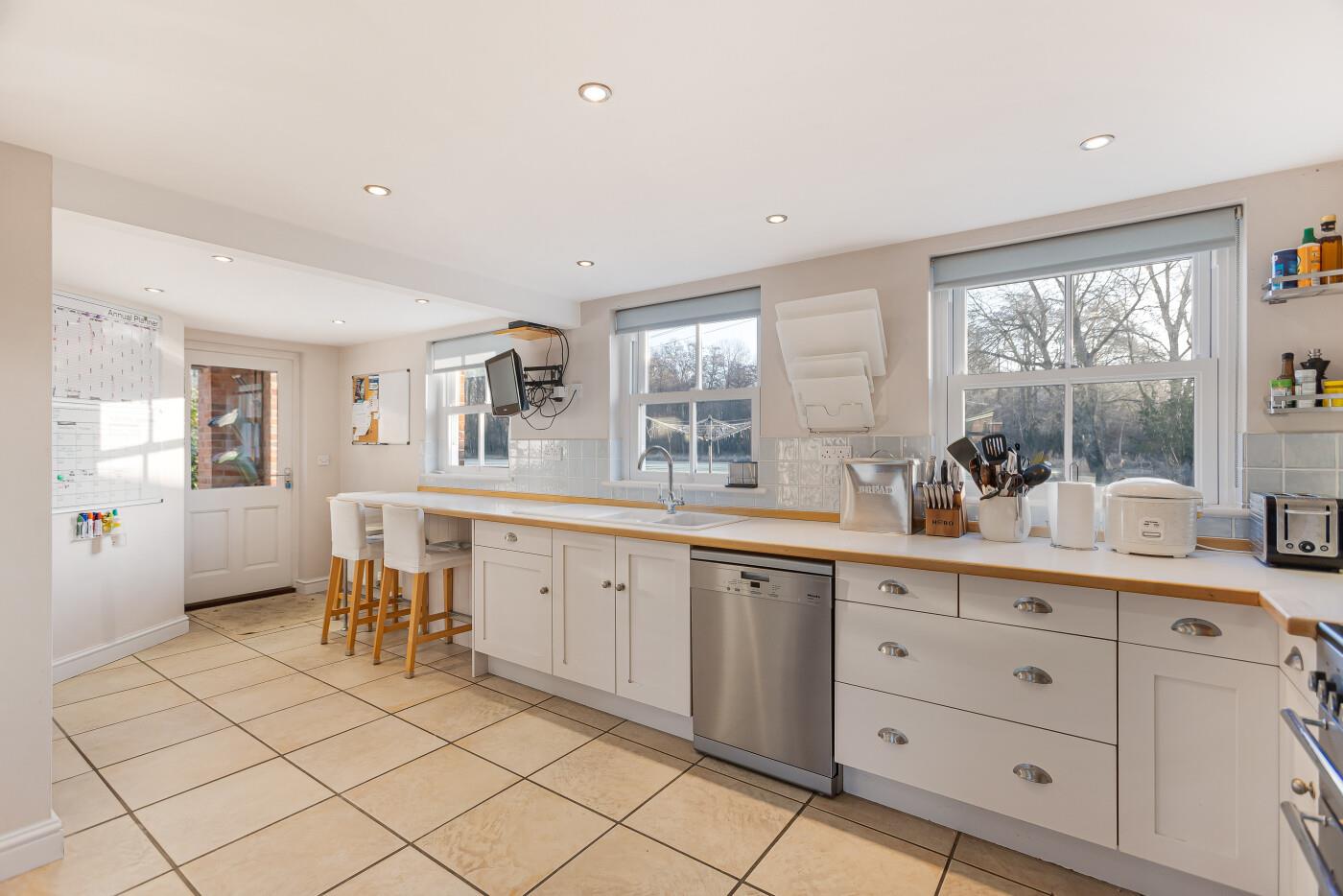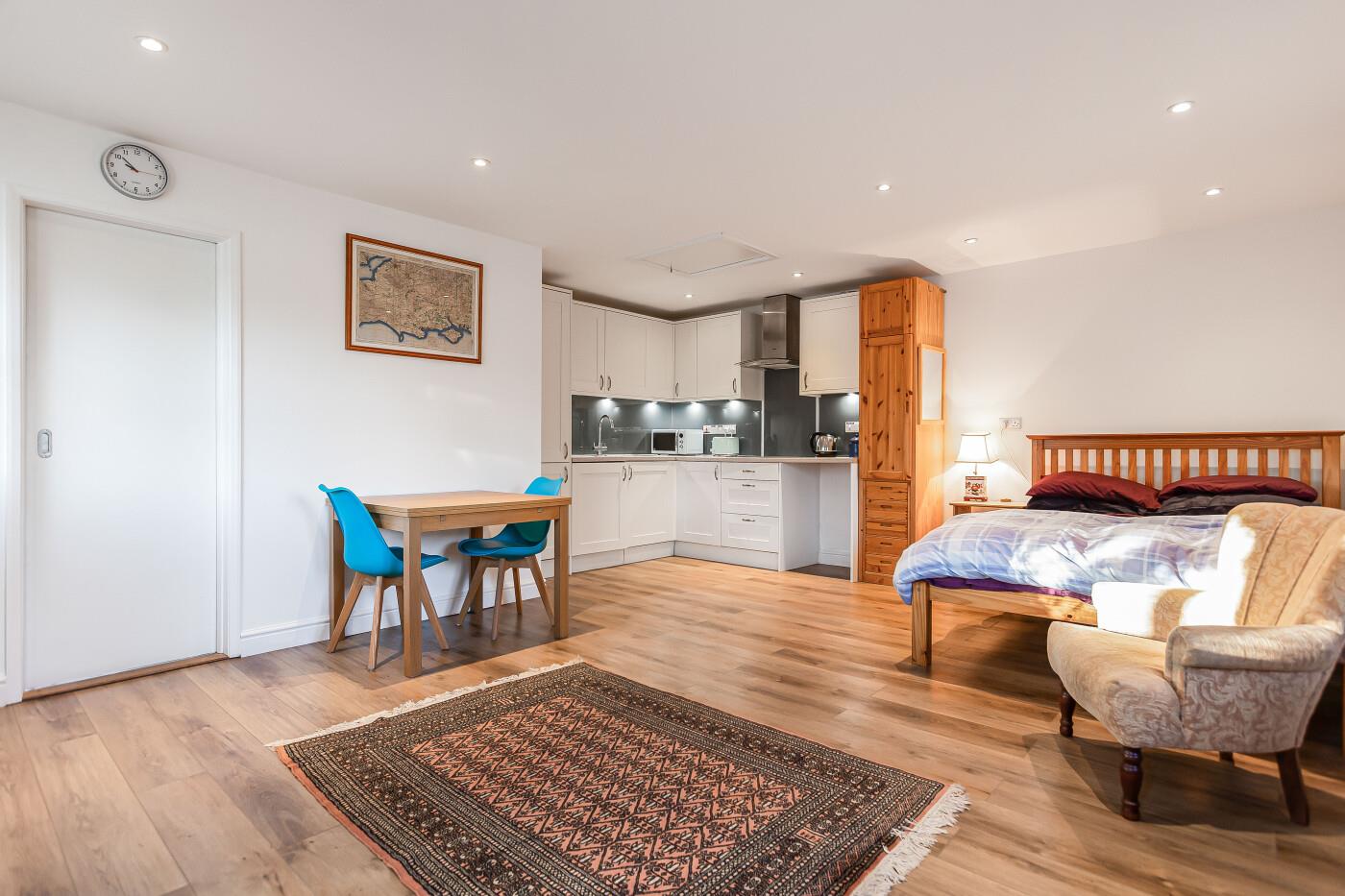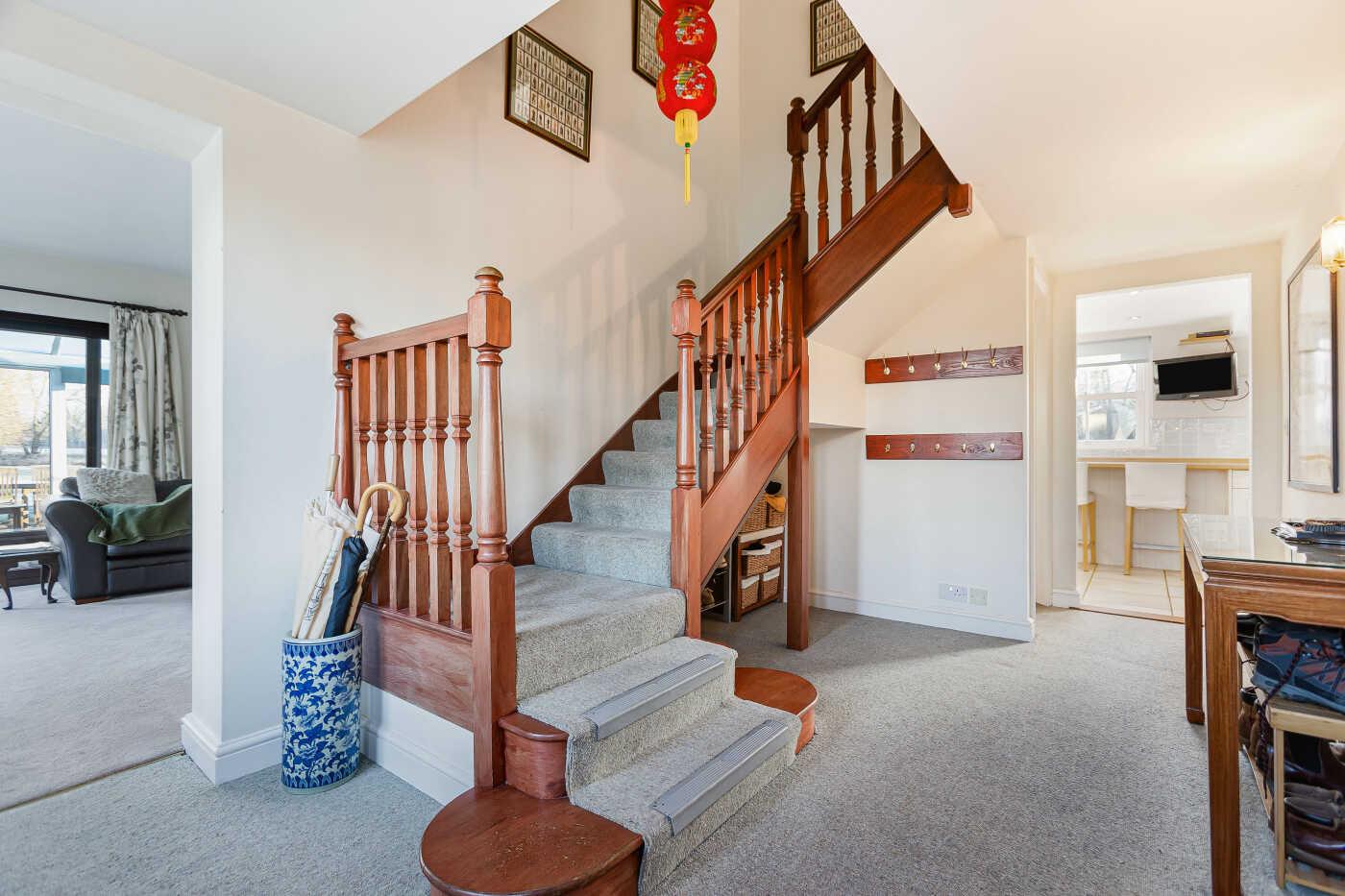 The principal house provides just over 2,600 sq ft of light and well-arranged living space. The accommodation flows naturally, with the conservatory taking full advantage of the wonderful outlook across the gardens. Upstairs, the principal bedroom is a particular highlight, featuring a vaulted ceiling that enhances both volume and character. There are five bedrooms and three bathrooms in total, offering excellent space for family, guests or visiting friends.