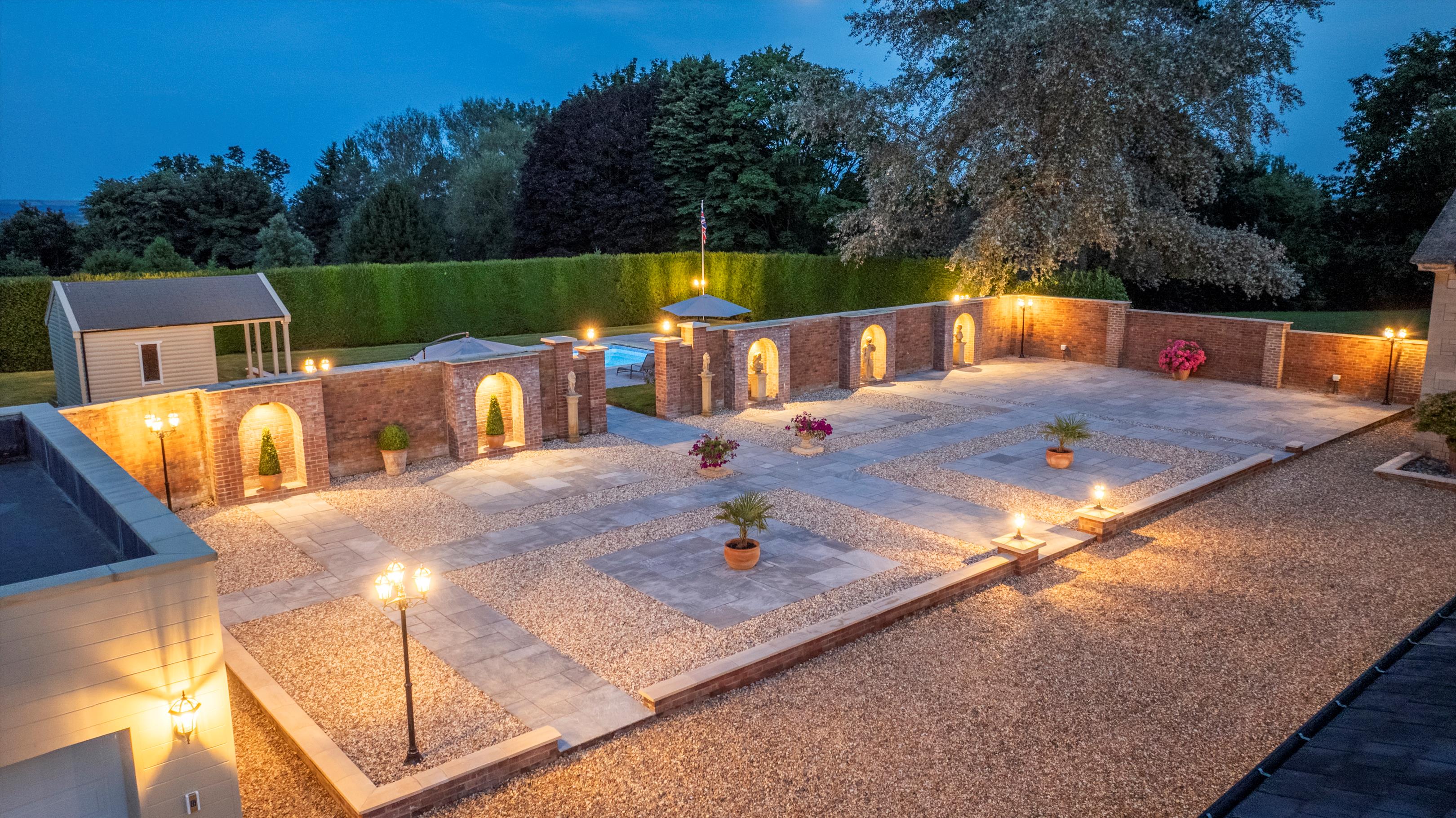 The front lawn is flanked by large cedar trees and a fountain in the middle. A Ha-Ha separates the lawn from the parkland and to the southwest of the house is a croquet lawn. There is a large outside entertaining area which leads to the swimming pool and new pool house. Beyond the pool is a hard tennis court.