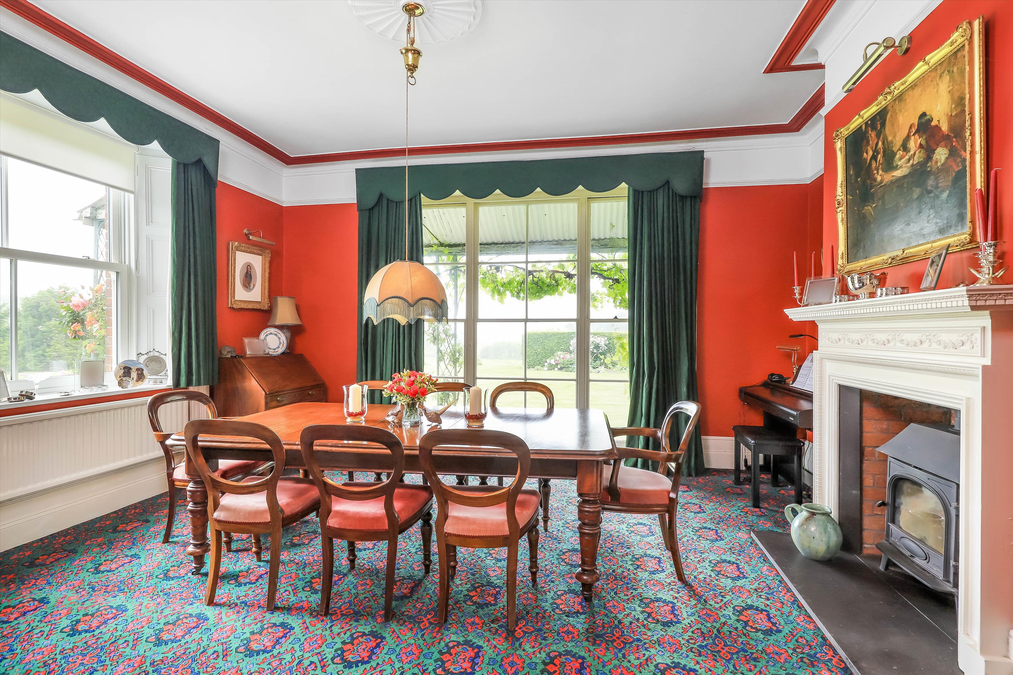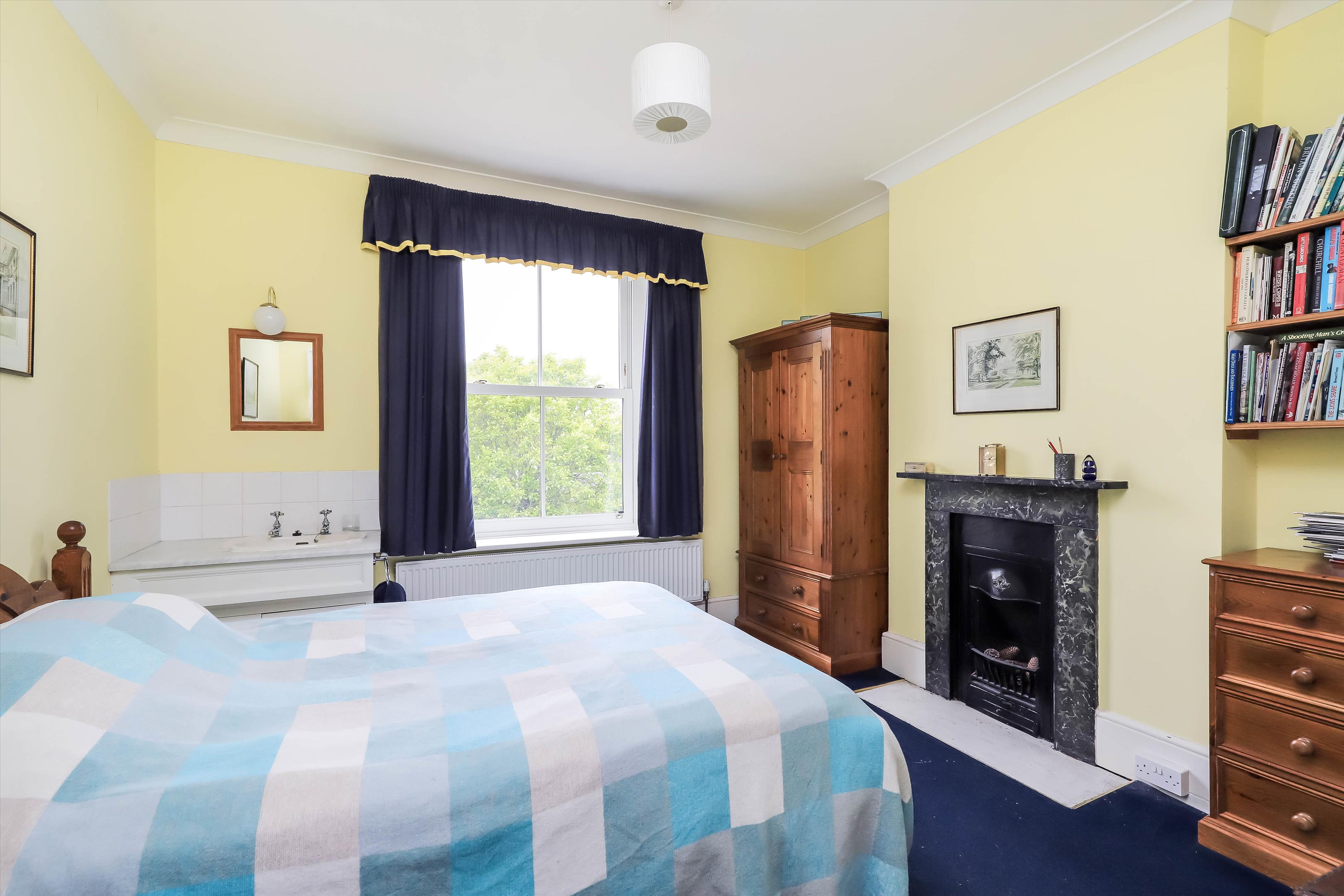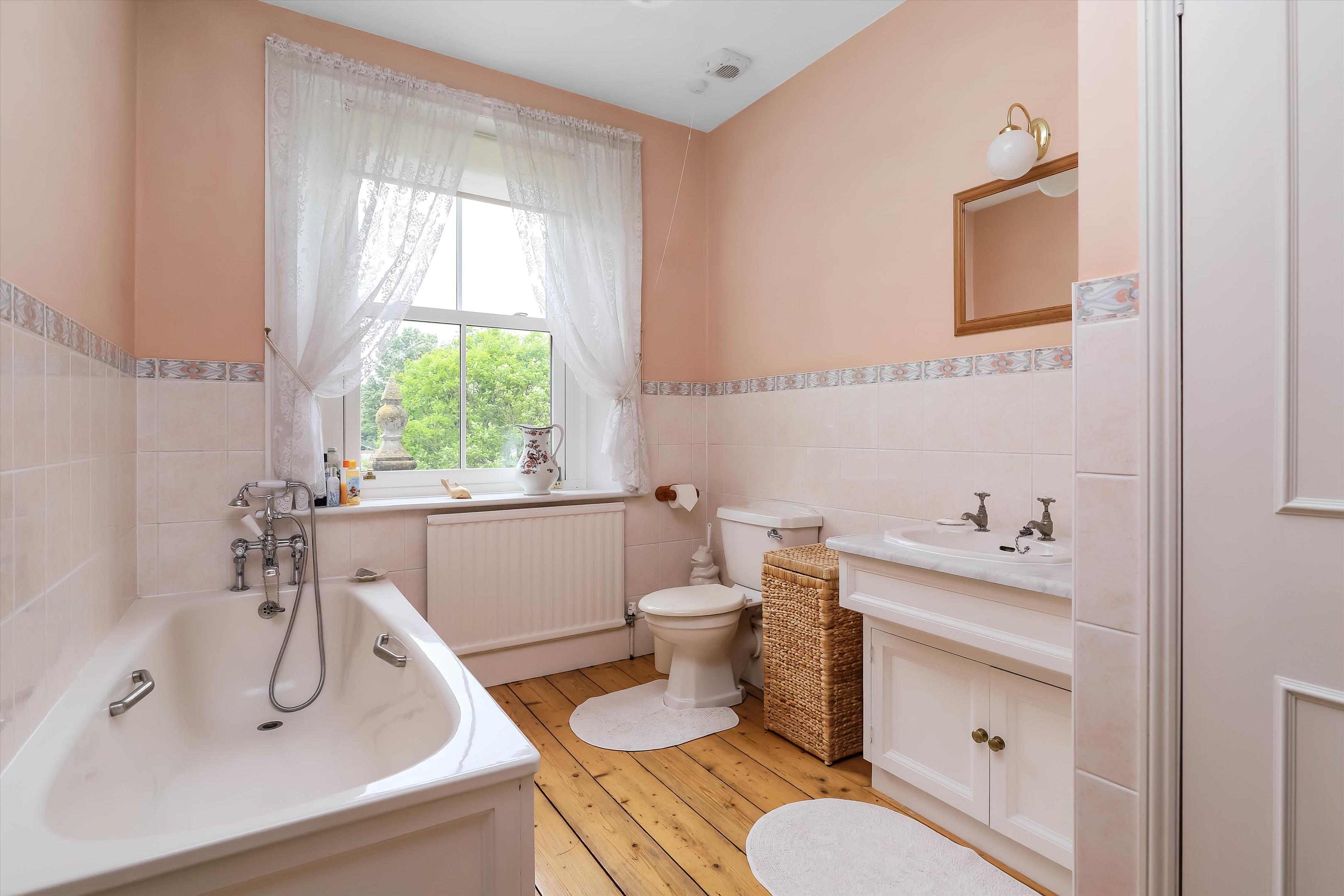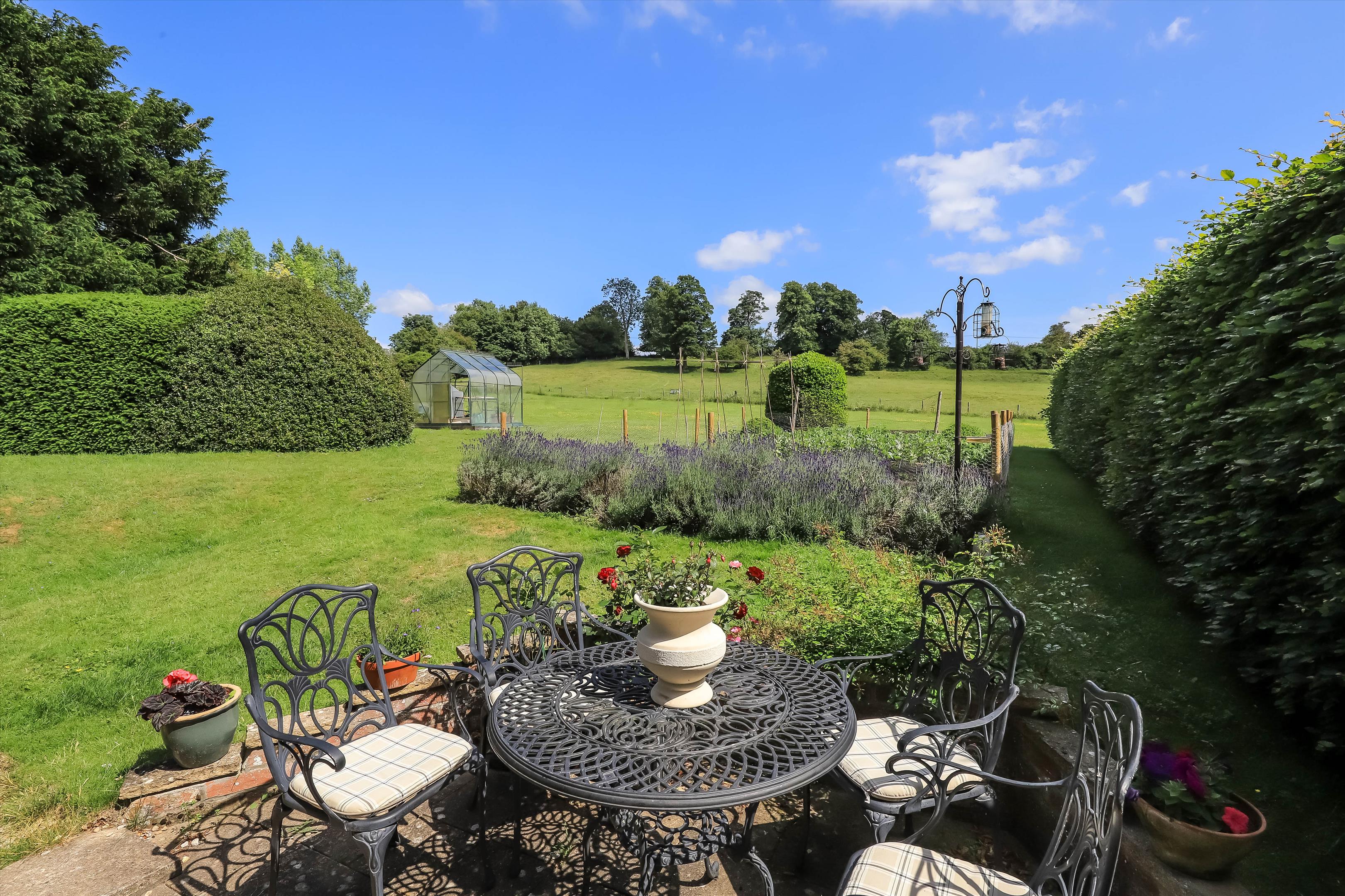 The spacious entrance hall with stairs to both the first floor and cellar leads to the double aspect formal drawing room and dining room, both with an original fireplace and floor-to-ceiling window benefiting from natural light, overlooking the gardens and beyond views. The entrance hall also gives access to the study and shower room, as well as the sitting room with a feature fireplace with log burner, which leads into the country style, double aspect kitchen/breakfast room with centre island, double doors to the garden and a door into the utility room. The utility room gives access to the courtyard, with doors into the boiler room, kennel and cloakroom as well as out to the garden.
