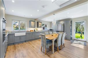 This is a spacious and bright room with a Clearview woodburning stove and a well-equipped kitchen with fitted wall and base units, integral appliances and a double Belfast sink.