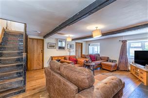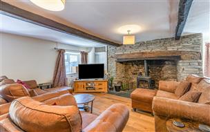 Lounge (5.76m x 2.00m) which features an impressive large inglenook stone fireplace which provides a stunning focal point within the room. The lounge is complete with oak flooring, exposed beams, windows to the front and side elevations and a radiator.