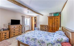 Double Bedroom (4.77m x 3.70m) with exposed beams, built in storage, windows to the front elevation, carpet flooring and a radiator.