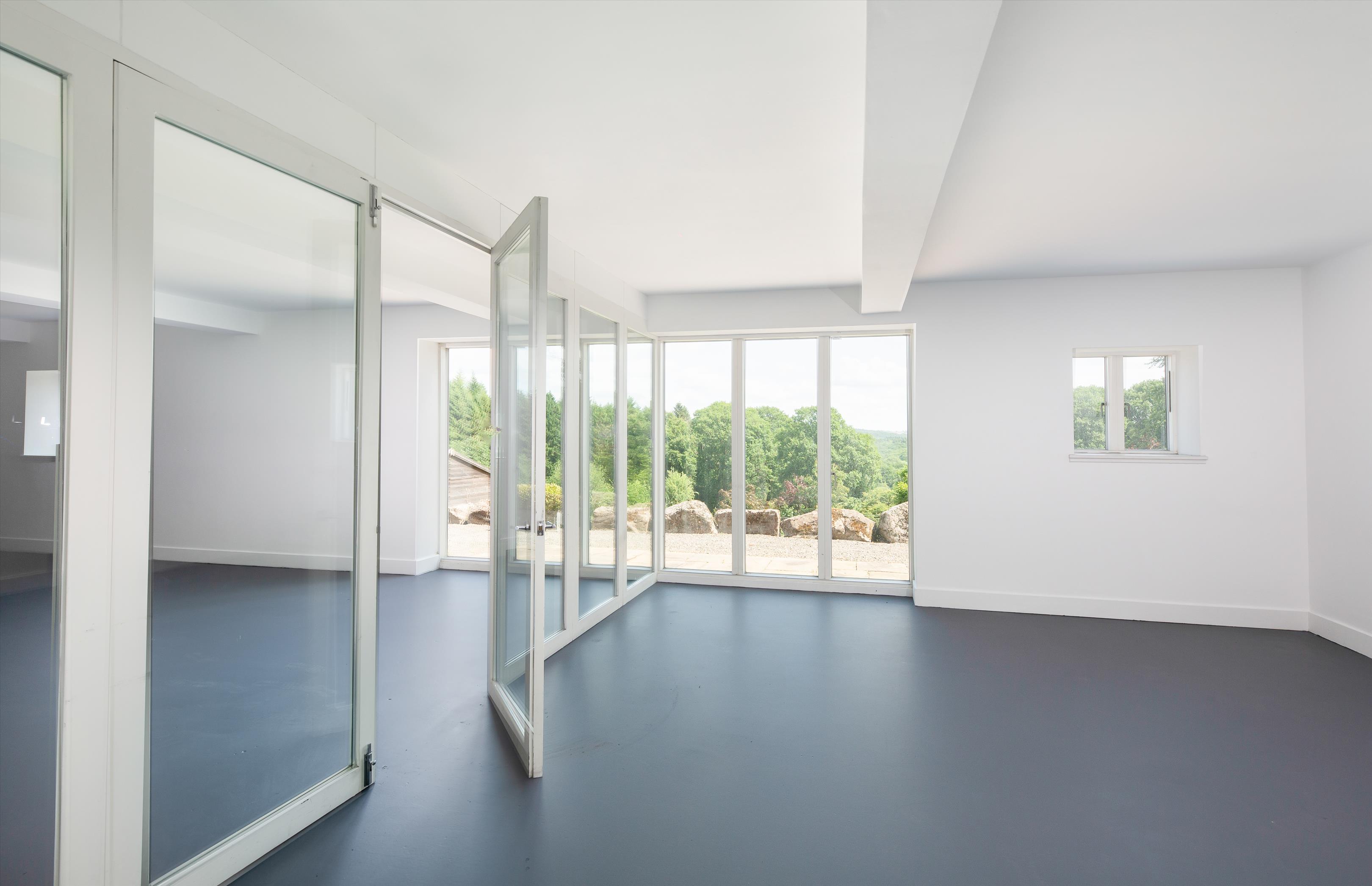 Percus Barn presents a unique refurbishment opportunity, set behind electric gates and accessed via a sweeping drive. This two-storey stone barn features a double-height glass front elevation and is currently configured as office and open-plan showroom space. Planning approval granted in December 2024 (DM/2024/01023) allows conversion into a five bedroom, four bathroom residence with a spacious open-plan kitchen, dining, and living area, which can be divided by tri-fold and bi-fold screens or doors. The property includes a guest cloakroom, utility room, boot room, and an impressive atrium with an existing staircase and balcony. Enhanced fenestration and a Juliet balcony service the principal bedroom suite and study. A second smaller barn with a separate cloakroom offers flexibility as a study, guest suite, or garage. Additionally, there is potential to add another large barn or showroom.