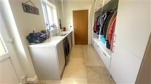 Linking to jack and Jill Shower room. Coat hanging space with storage units surround, tiled flooring and stainless steal sink and drainer. Additional work top space with units beneath, plumbing for white goods and double glazed window to rear. Door to rear garden area.