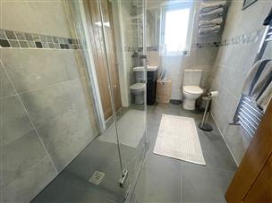 Well-appointed Jack & Jill shower room. Grey ceramic tiled flooring, fully tiled walls. Walk-in shower with glass screen. WC, vanity unit with inset wash hand basin and storage beneath. Frosted double-glazed window to the rear and heated towel rail.