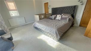 Coved ceiling and a radiator and carpet flooring. Double glazed triple-aspect to the front, along with an additional smaller side window, providing plenty of natural light. Stylish hanging bedside lights.