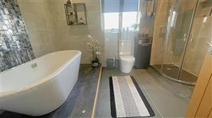 Split level, stylish family bathroom Grey ceramic tiled flooring and fully tiled walls. Walk-in shower with a glass screen, WC, and a double vanity unit with wash hand basin, storage beneath and large mirror light above. The upper section showcases a freestanding deep oval bath, heated towel rail and double glazed window to the rear.