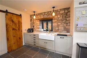 Fitted base units with built in fridge, dishwasher, double Belfast sink, Esse stove (electric and solid fuel). Free standing island with powerpoints. Flagstone floor, windows and patio doors to front. Velux window and exposed stone wall. Sliding door leading on to...