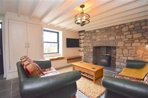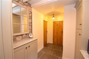 Wood burner, exposed stone walls, flagstone flooring. Window, door to front and cupboard under the stairs. Stairs to first floor.