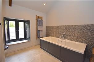 Freestanding bath, wash basin and vanity unit, WC, tiled floor, radiator, exposed timbers.