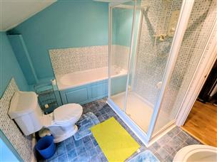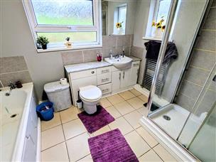 Comprising fully tiled shower cubicle, WC, vanity unit with basin, heated towel rail, tiled floor, built in airing cupboard.