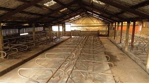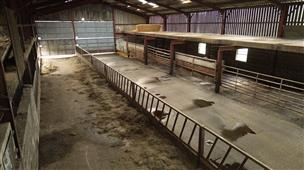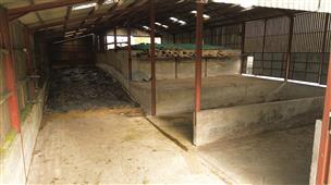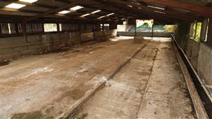 120' 0" x 45' 0" (36.58m x 13.72m) Steel framed with a fibre cement roof. Formerly loose housing with a feed passage and troughs.