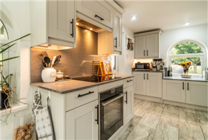 Bespoke Kitchen – Dove grey Shaker cabinetry, quartz worktops, Lusso Italian boiling/filtered tap, and premium AEG/Bosch appliances