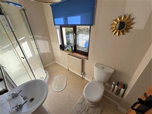 Having a modern suite comprising of a corner glazed shower cubicle with Mira shower, wash hand basin, low level flush w.c., radiator.