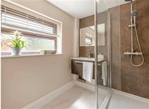 A fully refurbished contemporary style suite with a walk-in shower offering rainfall and conventional shower, floating vanity unit with a ceramic wash hand basin, low level flush w.c., chrome heated towel rail, extractor fan.