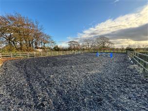 20m x 40m (65' 7" x 131' 3"). A fantastic outdoor riding school being enclosed with sand and rubber surface. Suiting all Equstrian activities.