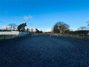 Of timber construction on a concrete base with adequate drainage in place. There are ten light, well-ventilated, rubber-matted stables in total. The stables lie in close proximity to the manege, the grazing and also the farmhouse. It benefits from electricity and water connection. The yard is enclosed by post and rail fencing with two 5-bar gates providing access. It benefits from electricity and ample internal and external lighting.