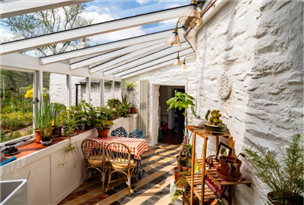 Beyond the kitchen is a beautifully light garden room, formerly referred to as the “glasshouse walkway” — now a delightful multi-purpose space with a glazed roof and windows, quarry-tiled floors, butler sink, porthole side window, and cloakroom with WC and vanity basin. This room offers access to both garden areas and connects to an adjacent store with views down the country lane.