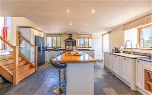 With a Welsh slate floor, wall and base units, travertine work top, gas hob, electric oven with extractor above and sink. The kitchen features a timber island, with hot water tap and sink, breakfast stools and integrated wine fridge. A door leads to the side elevation, with windows to the front and side elevations.