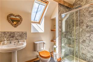 Comprising bath, sink, toilet, shower, heated towel rail and built in cupboard. With a tiled floor and Velux roof window.