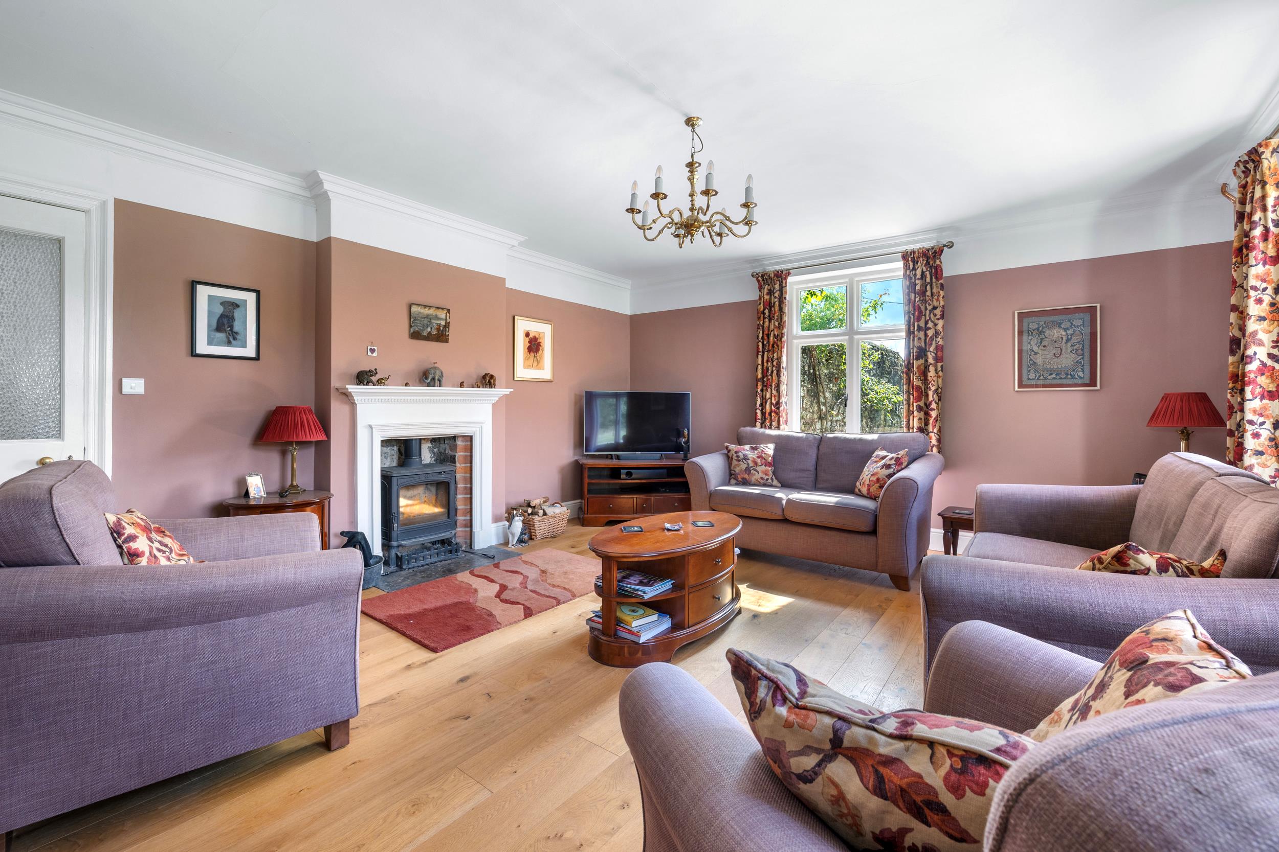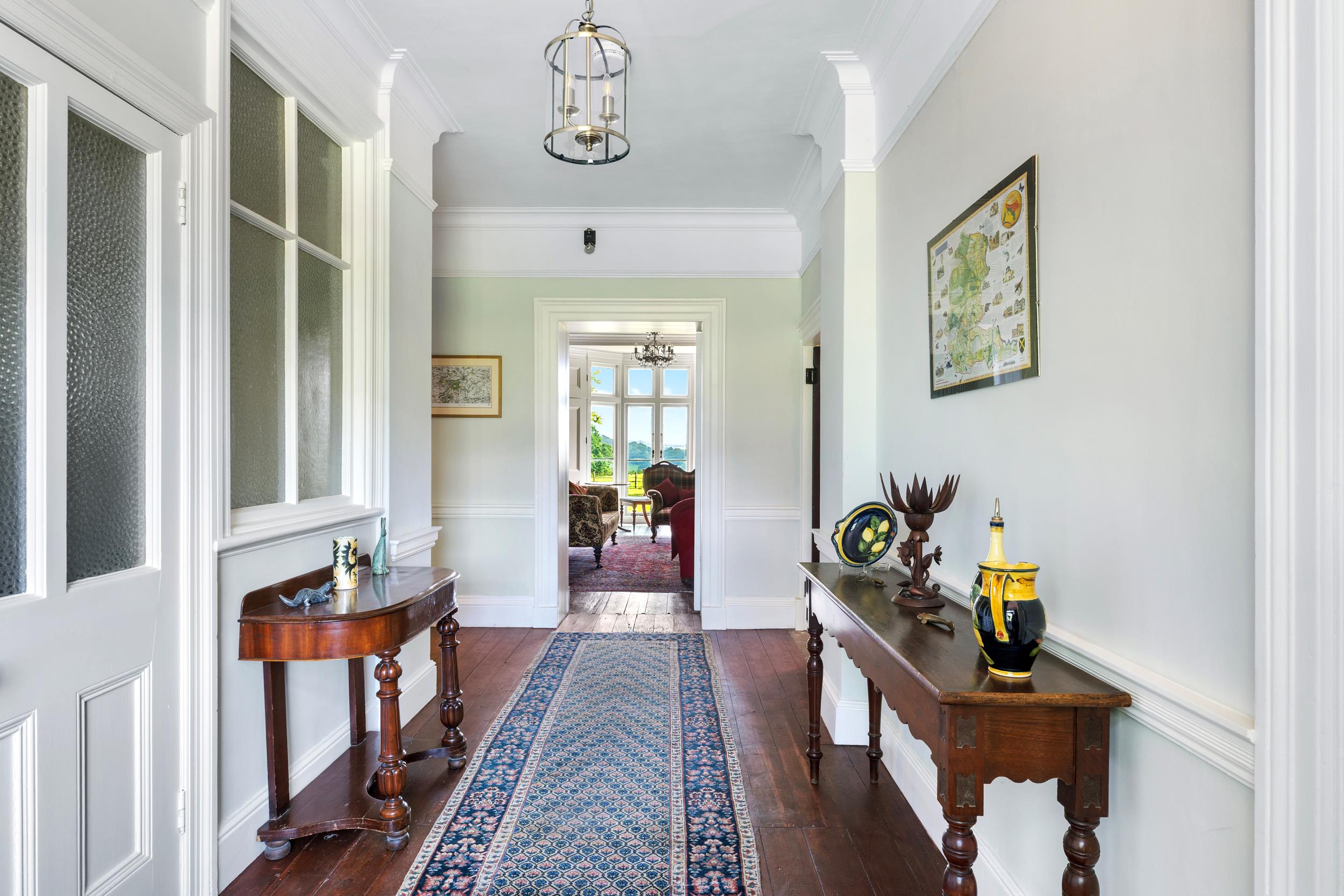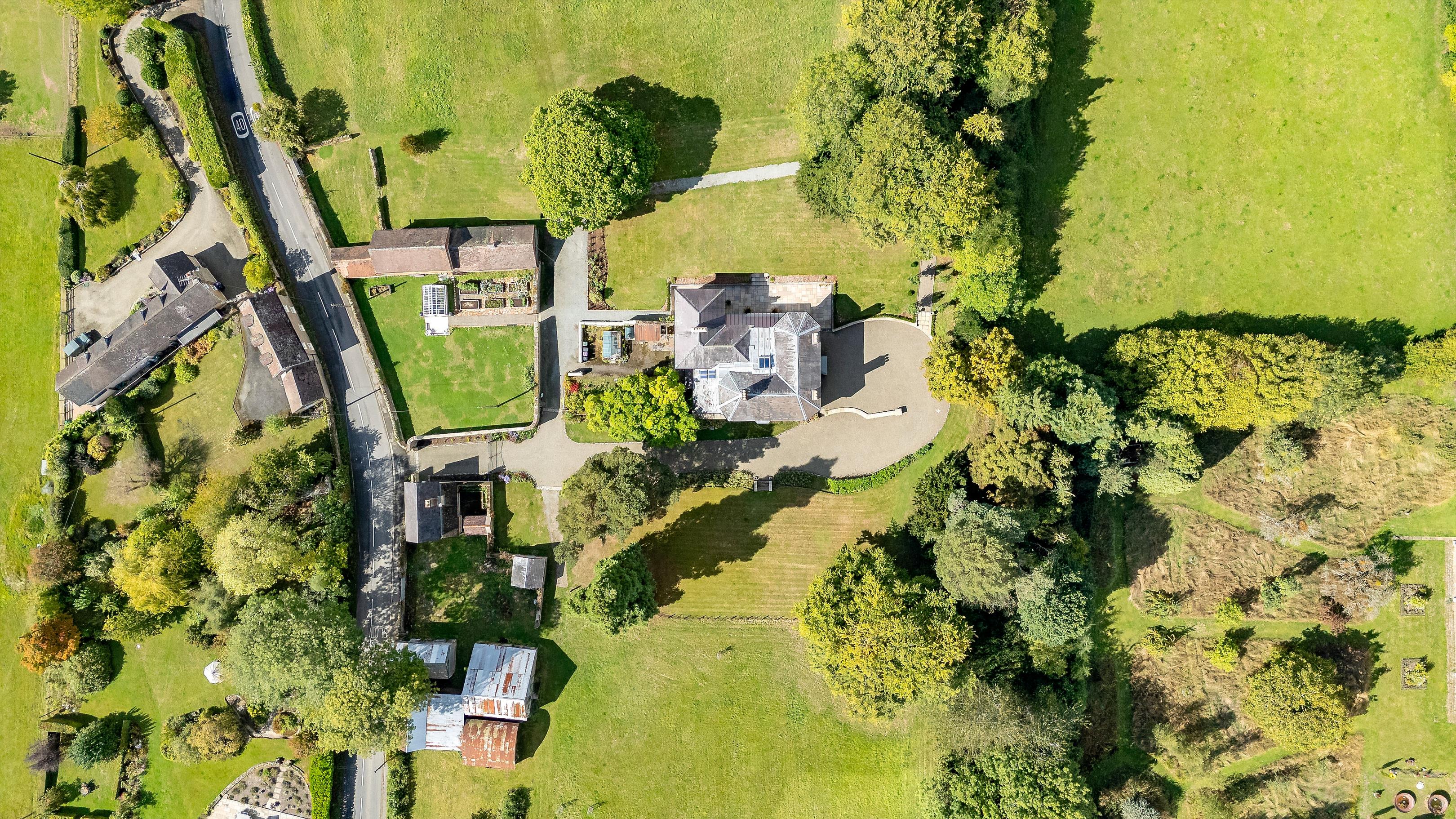 A gravelled driveway with iron gates, set back from the road, leads to a turning circle at the front door and continues to the side of the house, providing access to the outbuildings. The gardens have been beautifully restored, with formal lawns running up to the fields and a walled vegetable garden housing a restored Victorian greenhouse. Paddocks to the front and rear, along with an orchard, create enclosed grounds extending to about 8 acres.