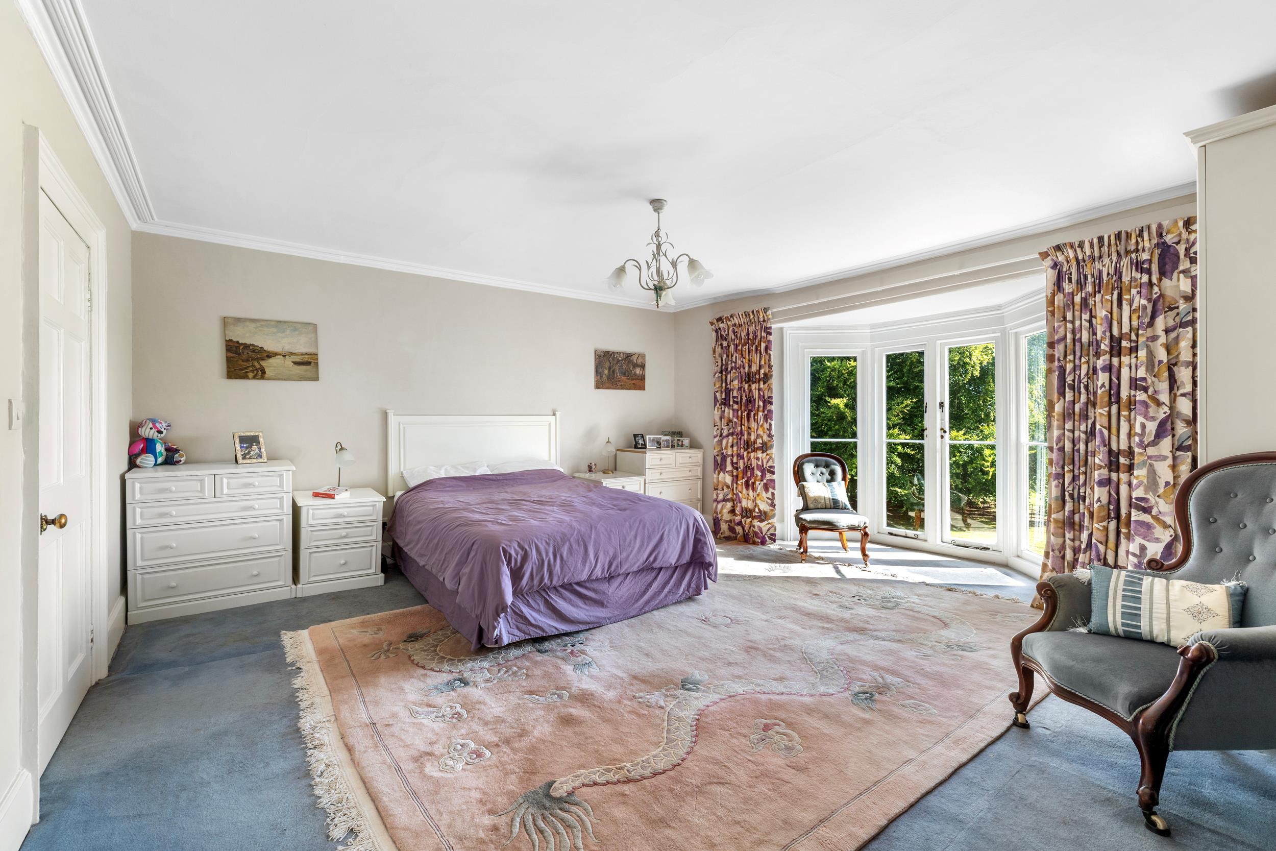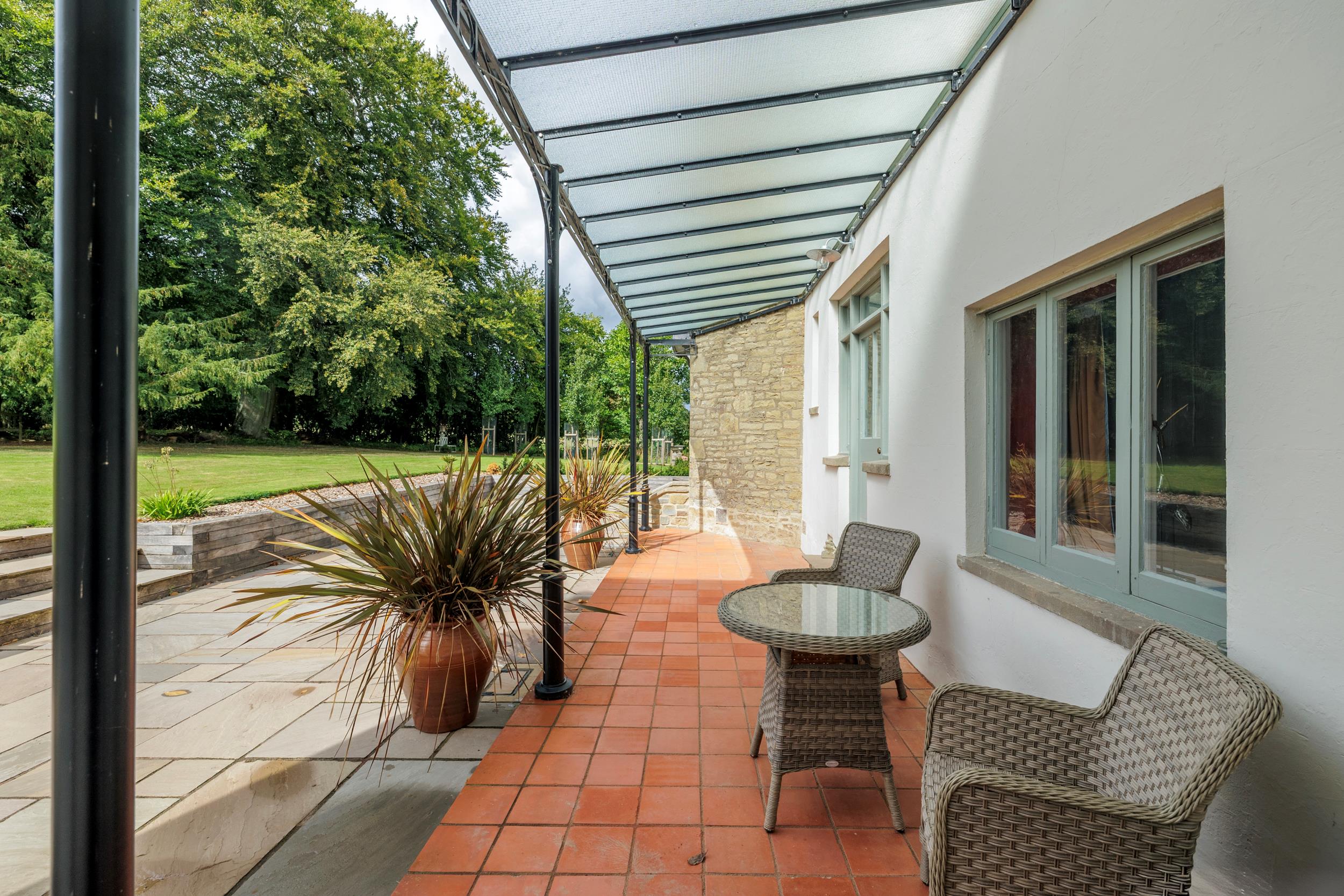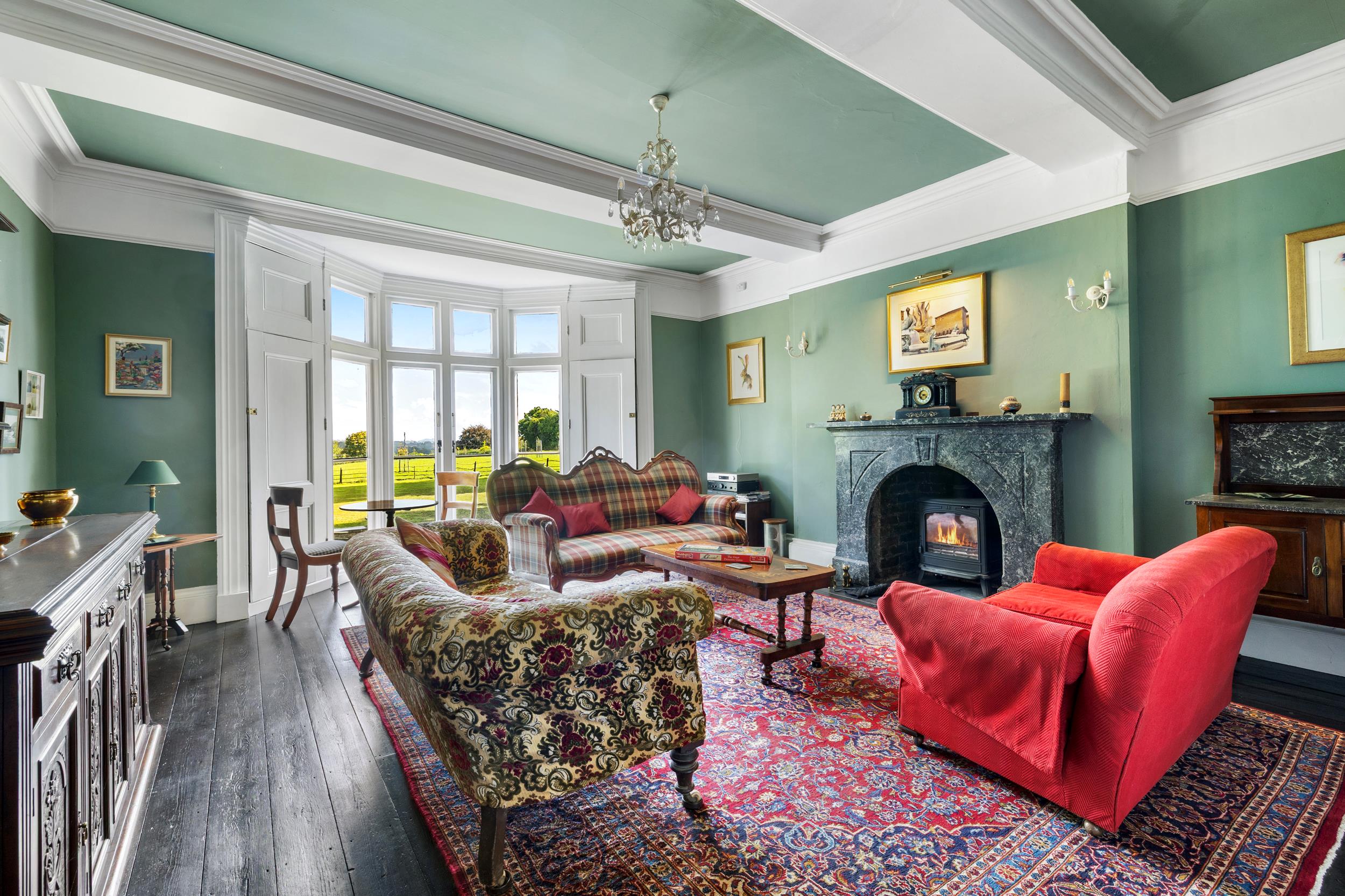 A gravelled driveway with iron gates, set back from the road, leads to a turning circle at the front door and continues to the side of the house, providing access to the outbuildings. The gardens have been beautifully restored, with formal lawns running up to the fields and a walled vegetable garden housing a restored Victorian greenhouse. Paddocks to the front and rear, along with an orchard, create enclosed grounds extending to about 8 acres.