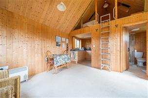THE PINES LODGE A 'Kingsland' timber building erected in 2010 as an agricultural mess room/store has a fully pine clad living room with an opening through to a kitchen area with wooden fitted units incorporating a stainless steel sink/drainer, an integral electric hob, and space for an undercounter fridge. The shower room has a Triton T80 electric shower in a large cubicle, a pedestal basin, wc and heated towel rail. A ladder from the living room gives access to a spacious mezzanine sleeping platform. The attached garage/store/workshop has power and light.