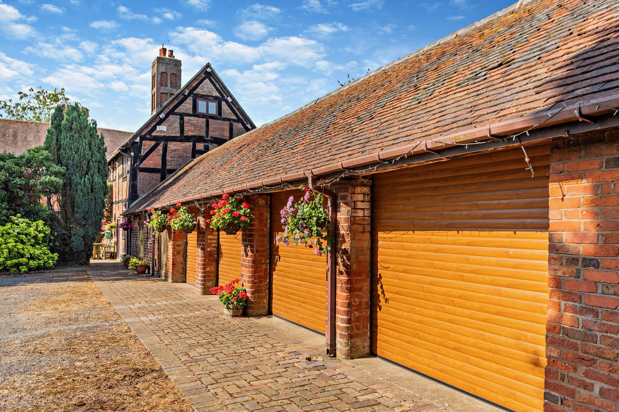 Approached directly from Breach Oak Lane the gated private drive leads to a large parking area in front of the separate four-bay garage with four electric roller doors.