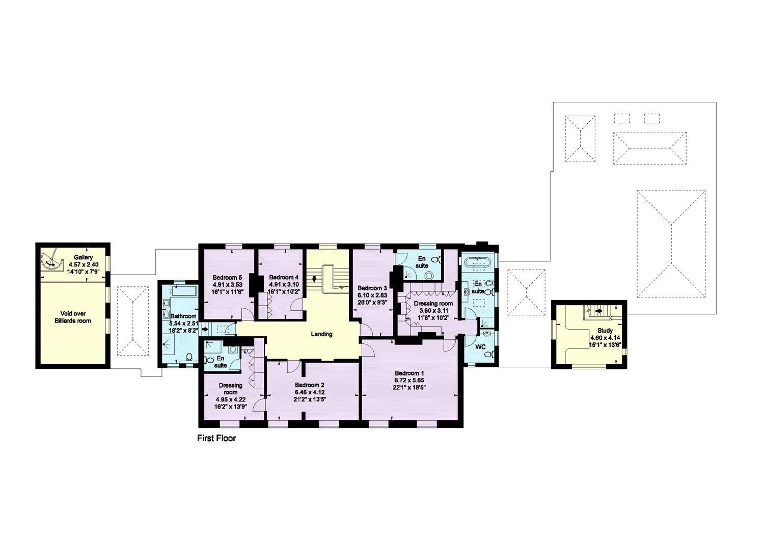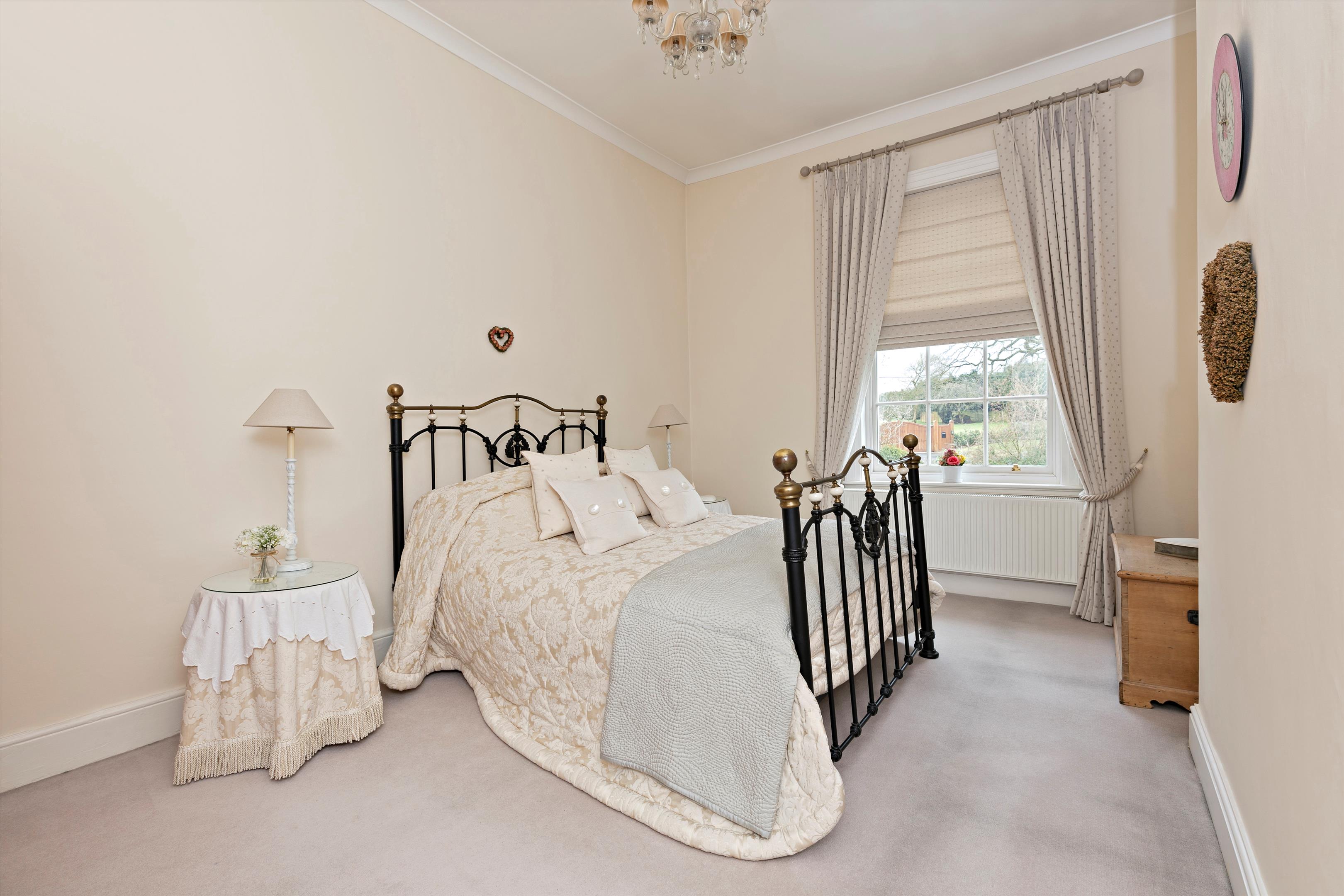 The first floor offers luxurious bedroom accommodation. The principal suite enjoys breathtaking views over the gardens and surrounding countryside, enhanced by a spacious dressing room. Two further well-appointed bedroom suites provide generous double bedrooms. One features a recently refurbished family bathroom.
