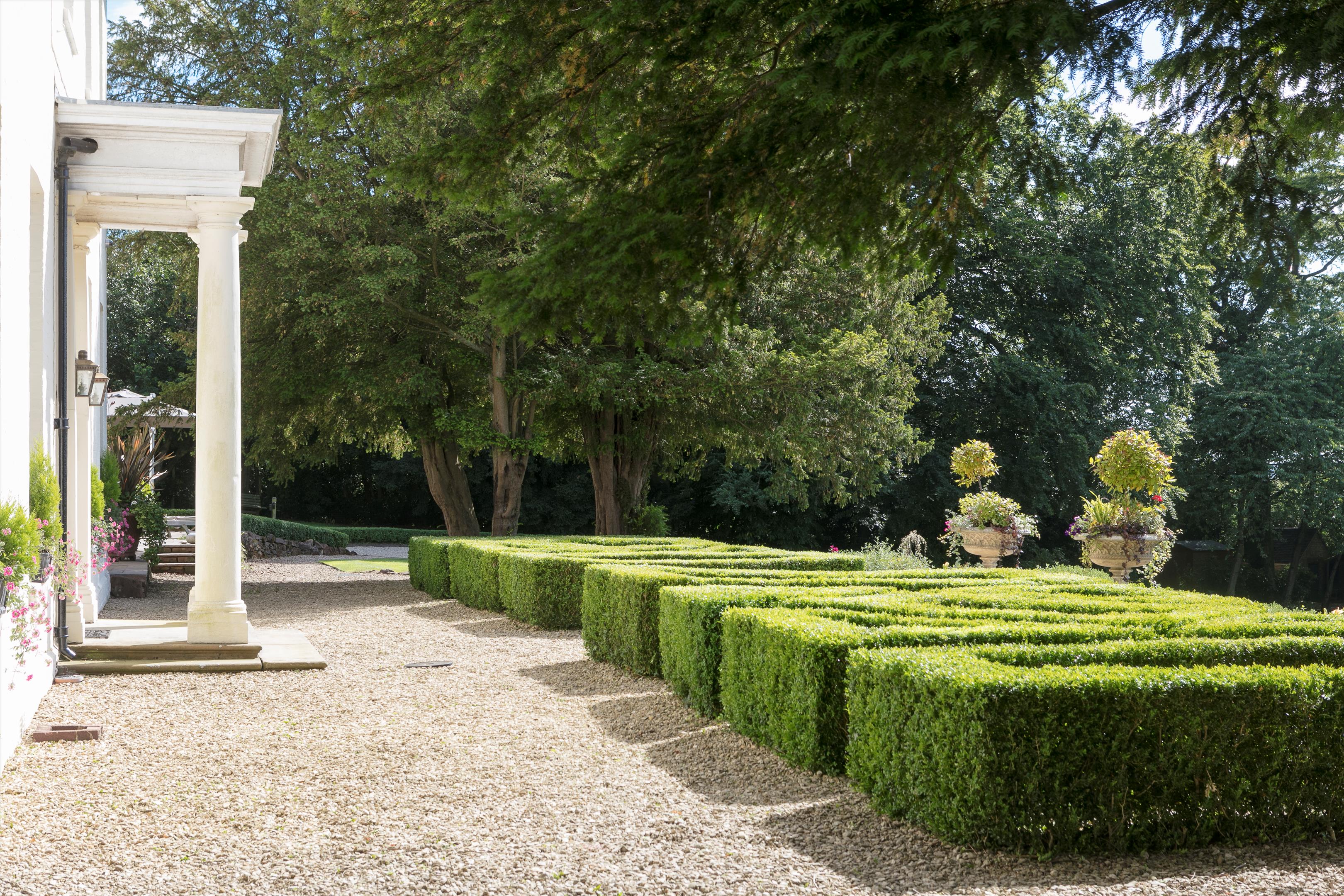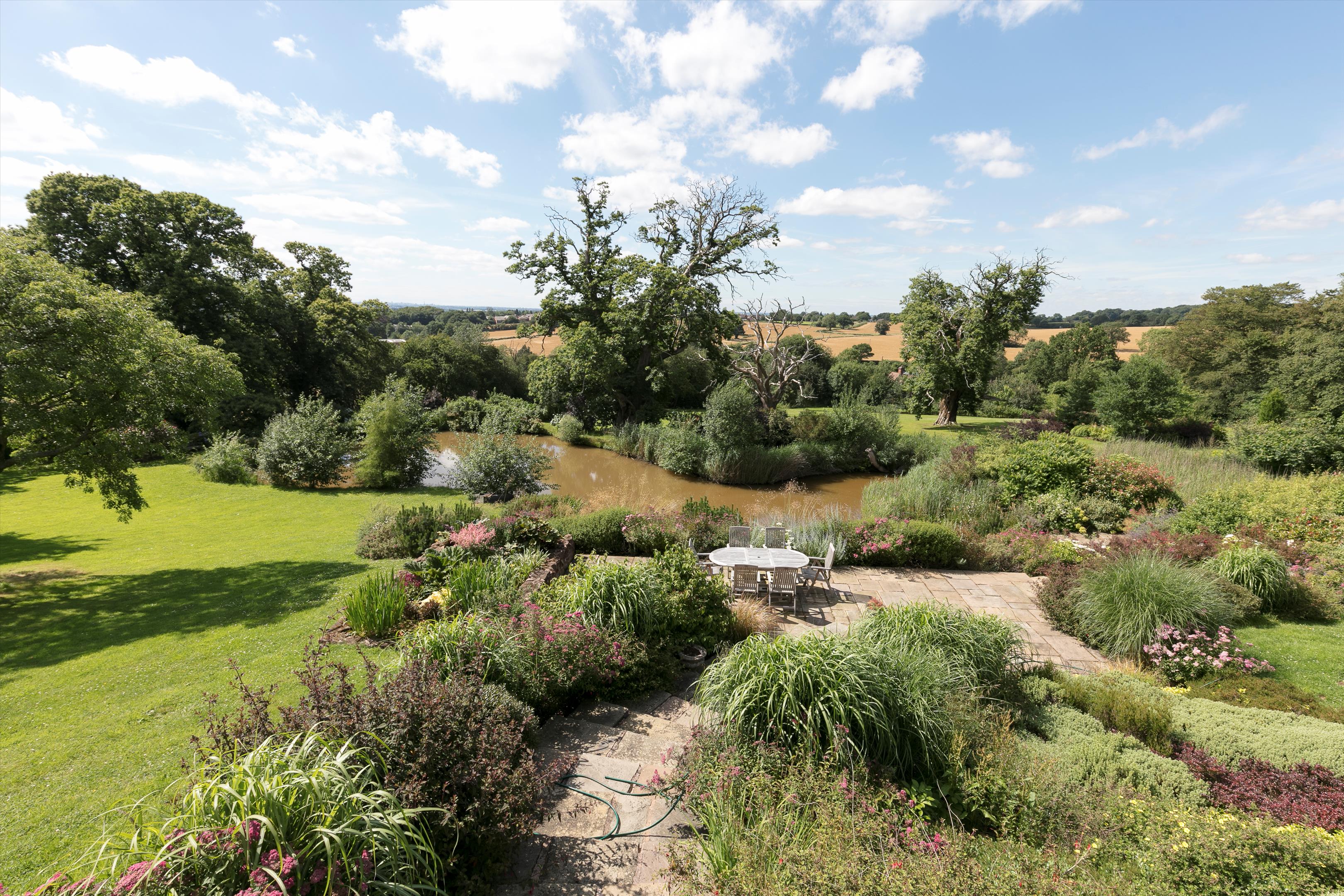 A private track forks left from the main drive, leading to a well-positioned garage and additional parking area, subtly tucked away for convenience and privacy. The gardens and grounds are beautifully maintained, offering a seamless blend of formal landscaping and natural charm. Manicured borders and traditional box hedging frame stone terraces and expansive flat lawns, creating an elegant outdoor setting. Steps descend to a sheltered patio, which overlooks the tranquil lake and surrounding countryside. A variety of mature trees punctuate the grounds.