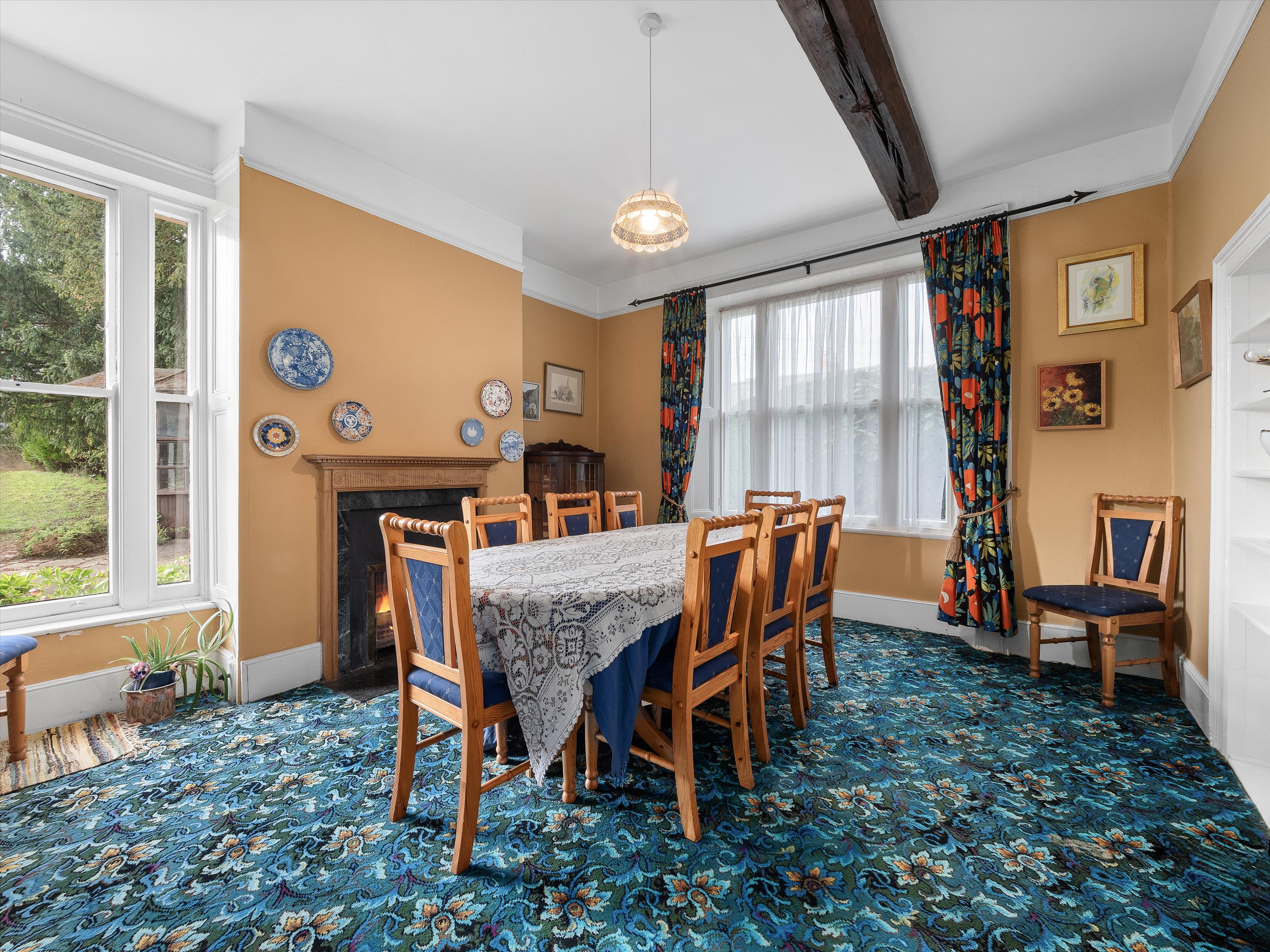 Inside, a welcoming reception hall leads to generous and well-arranged ground-floor rooms, including a spacious drawing room with an attractive fireplace and double doors to the gardens, a formal dining room ideal for entertaining, and a cosy sitting room-each featuring original fireplaces. A kitchen, separate breakfast room and useful cloakrooms ensure excellent flexibility for family living.