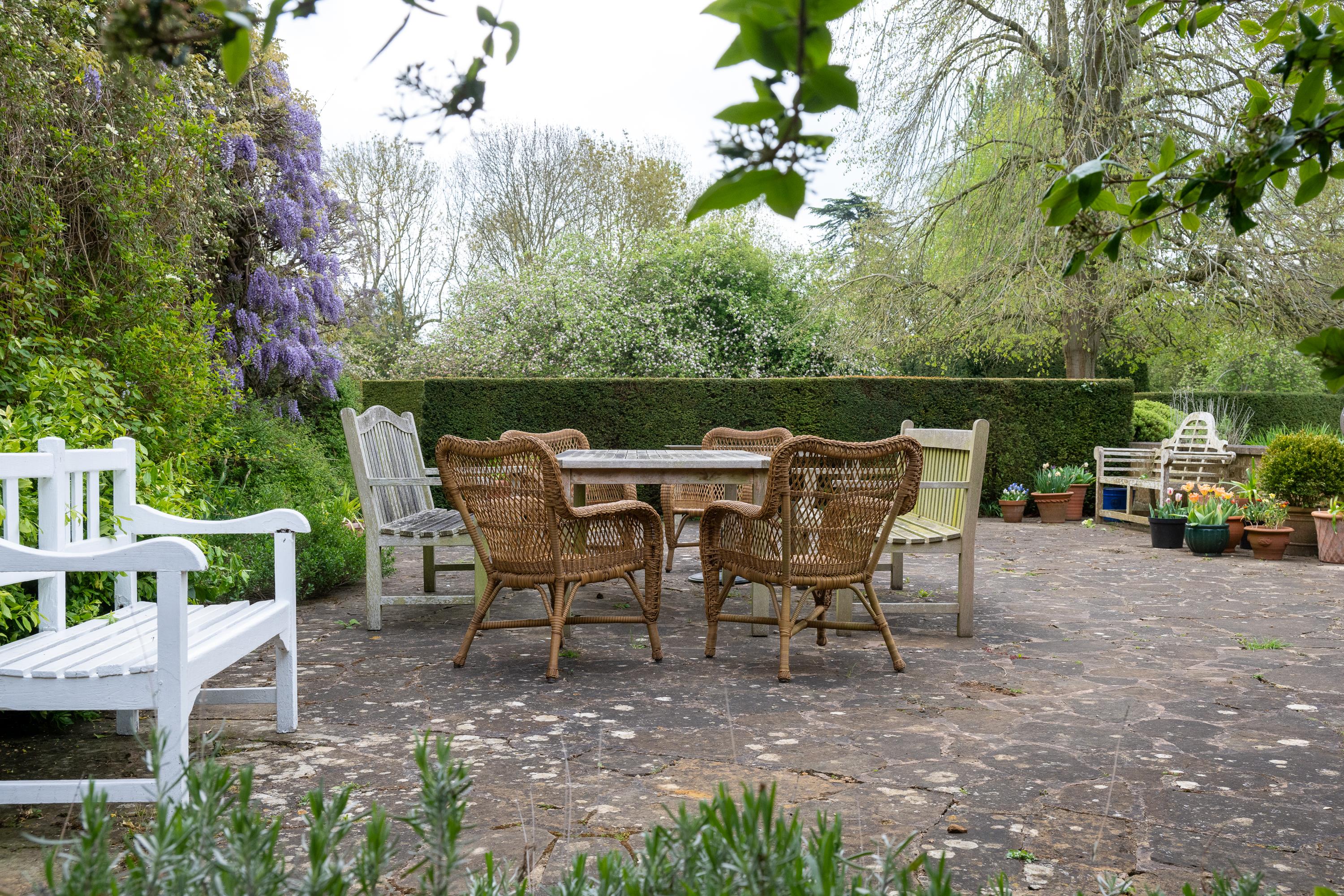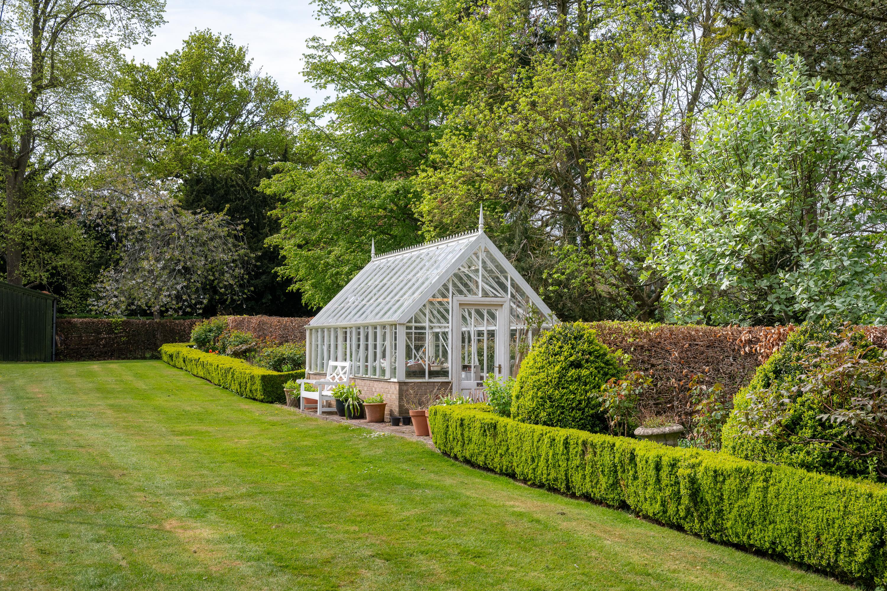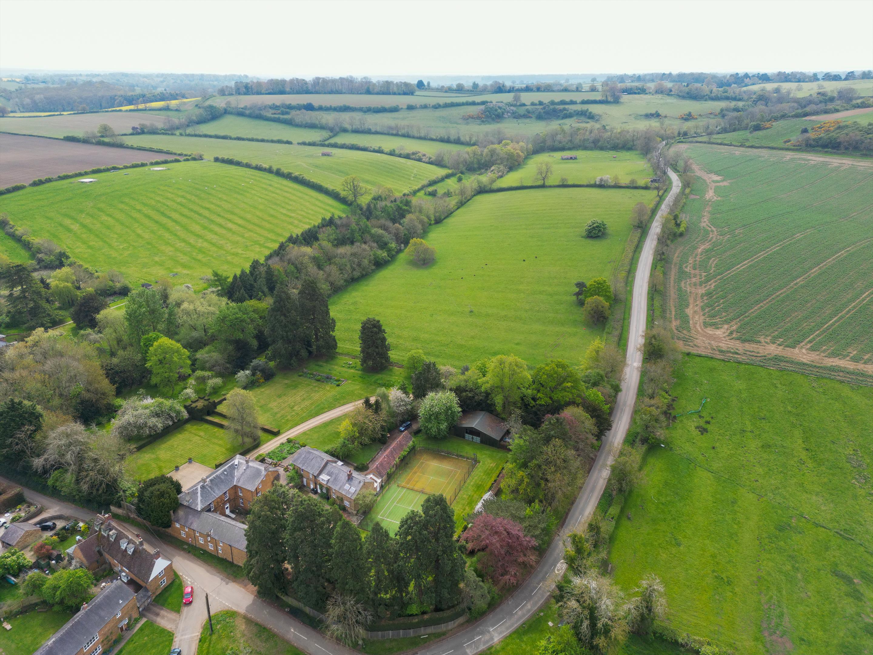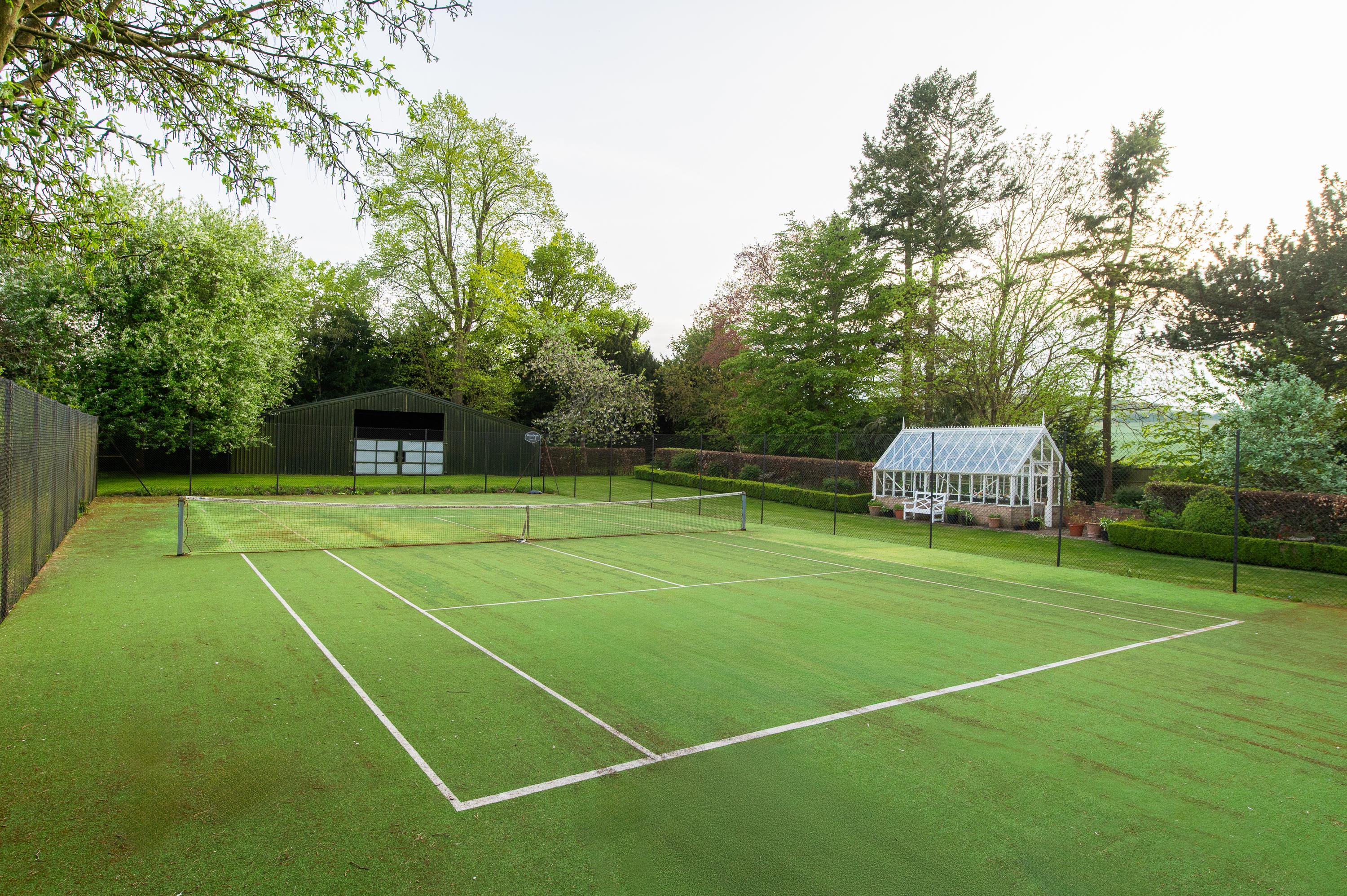 Behind the house is a large gravelled courtyard accessed off The Slade through double-close boarded wooden gates. There is an all-weather tennis court, greenhouse and vegetable garden, and useful enclosed steel frame garden storage building.