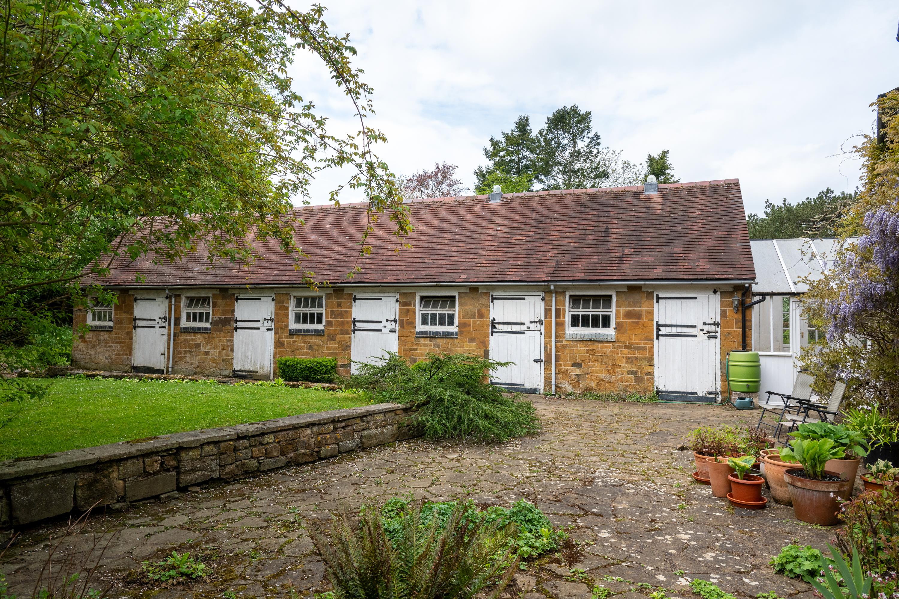 Attached to the cottage are a range of 5 traditional stone-built stables. The gardens are delightful, private and mature. The main drive is accessed through a gravel drive, with a spur-off leading to the parking area for the cottage and stableyard, with mature trees and shrubs providing a tree screen to the lane and along the drive, which leads to a large gravel parking area in front of the house. The gardens are lawned, with a wide south-facing patio, with yew hedges and topiary children's crenellated castle, summerhouse, herbaceous borders, mature trees including fine specimen Wellingtonia and shrubs, with an orchard beyond leading to a boundary stream.