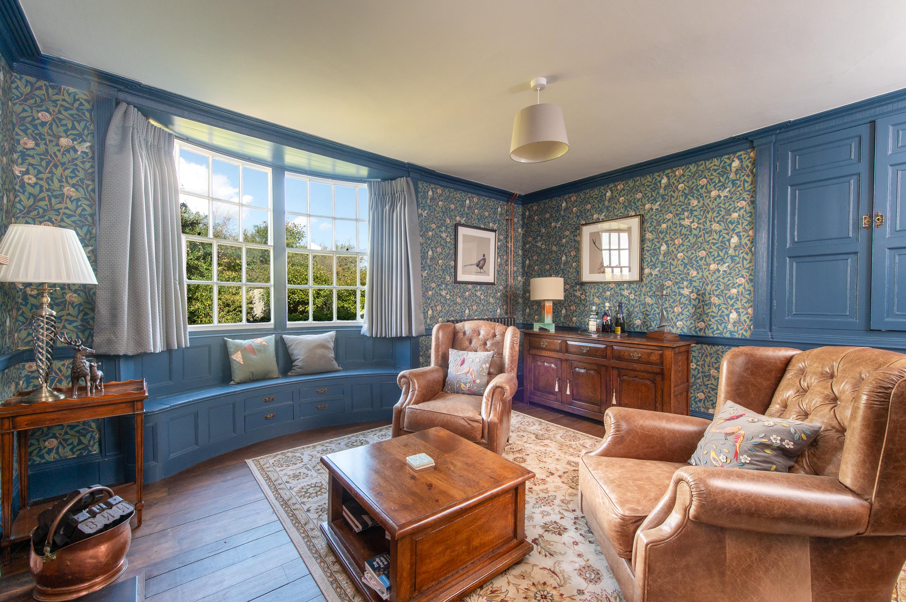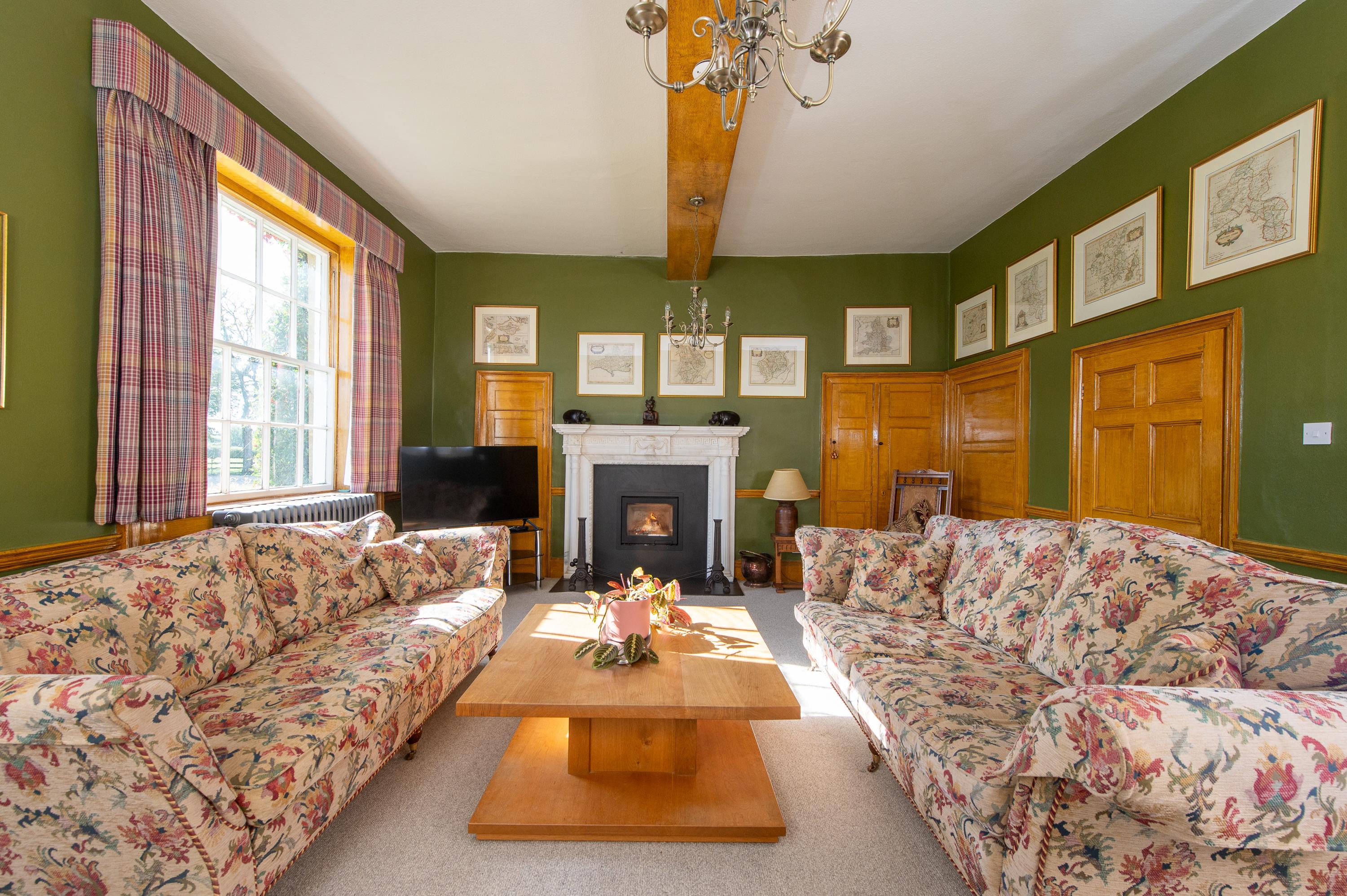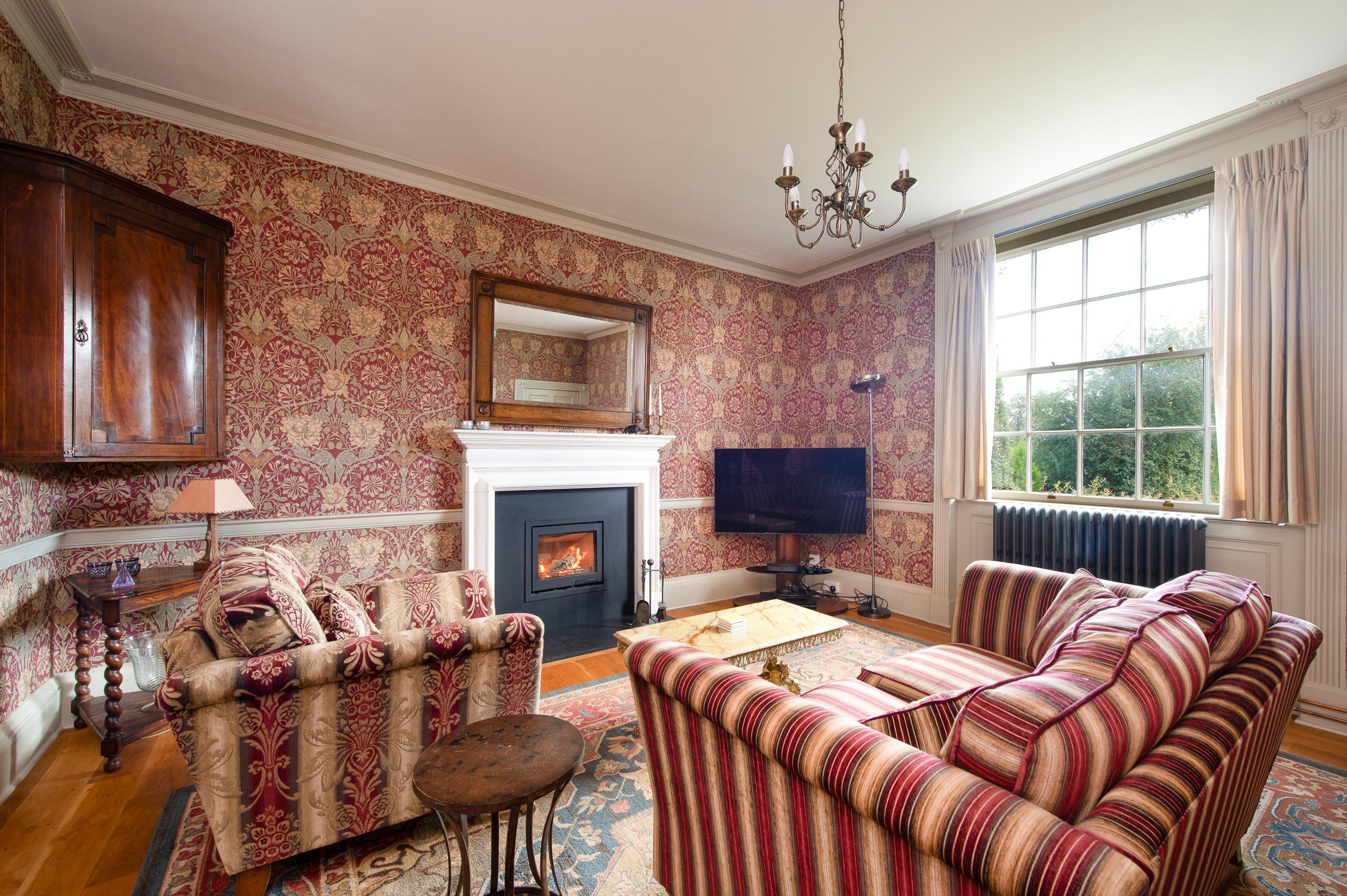 The drawing room has a fine marble fireplace surround, there is a woodburner in the dining room and attractive sitting room fireplace with carved pine surround and curved bay window with window seat. Family room with enclosed fire with marble surround.