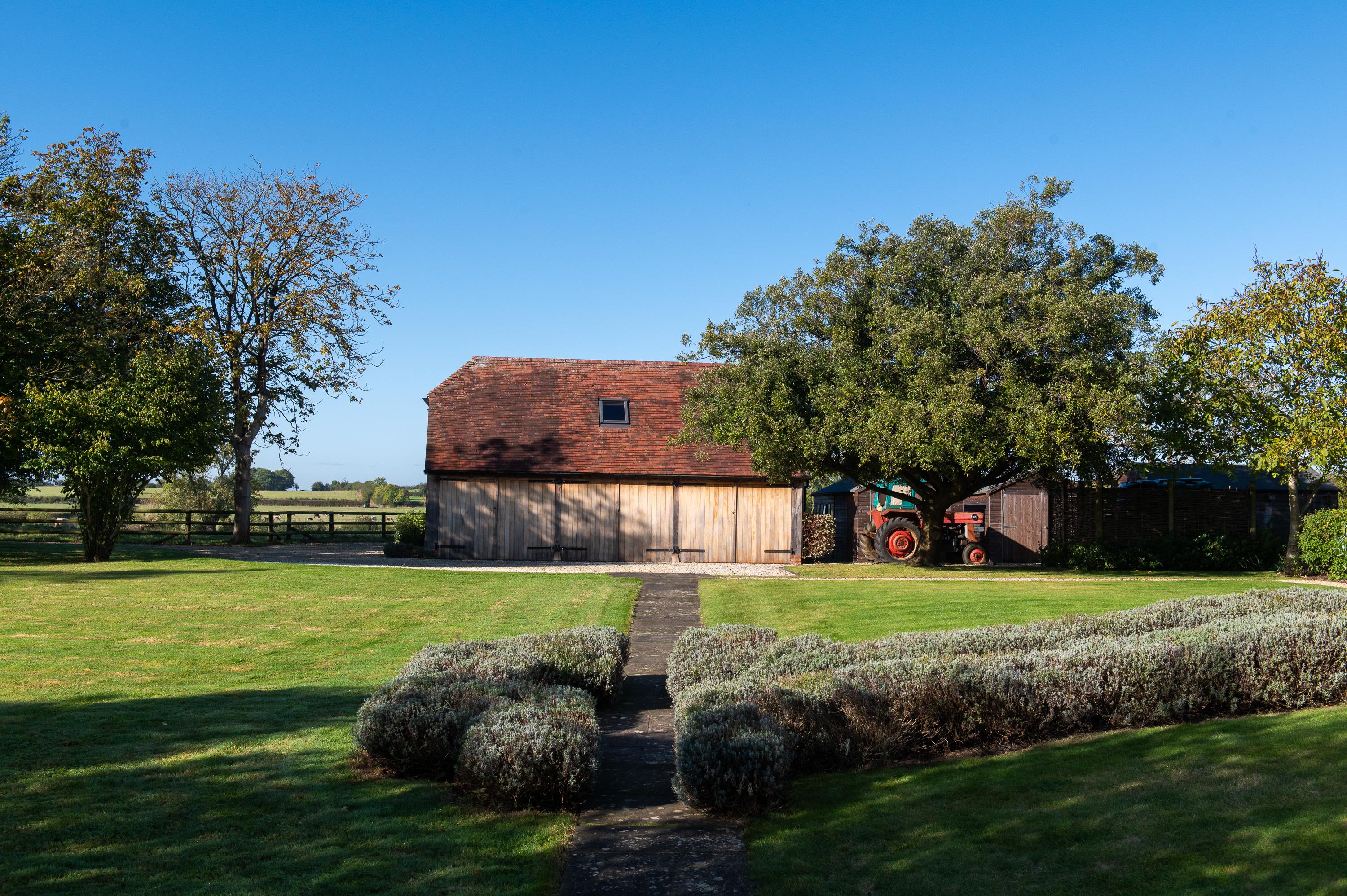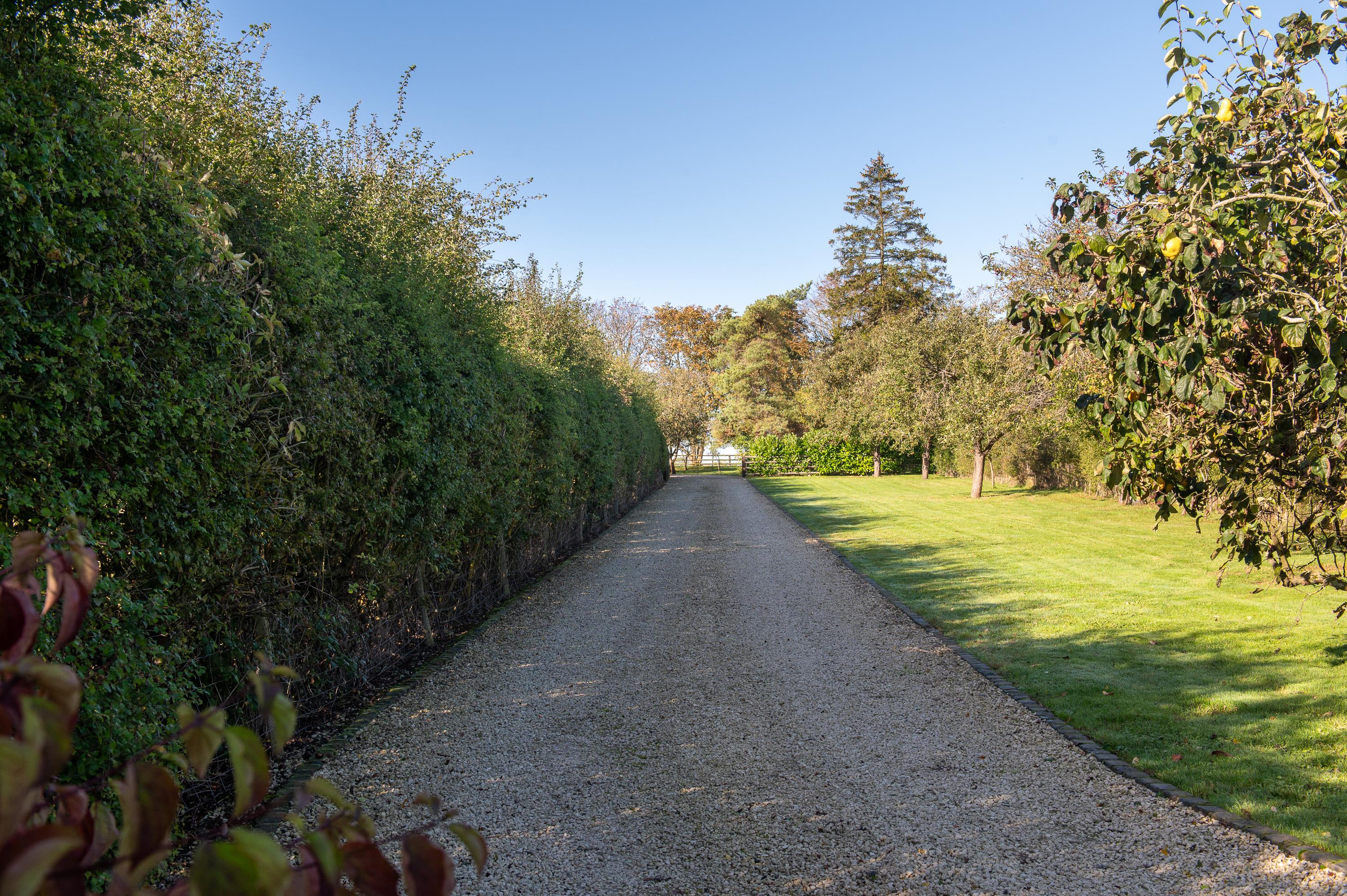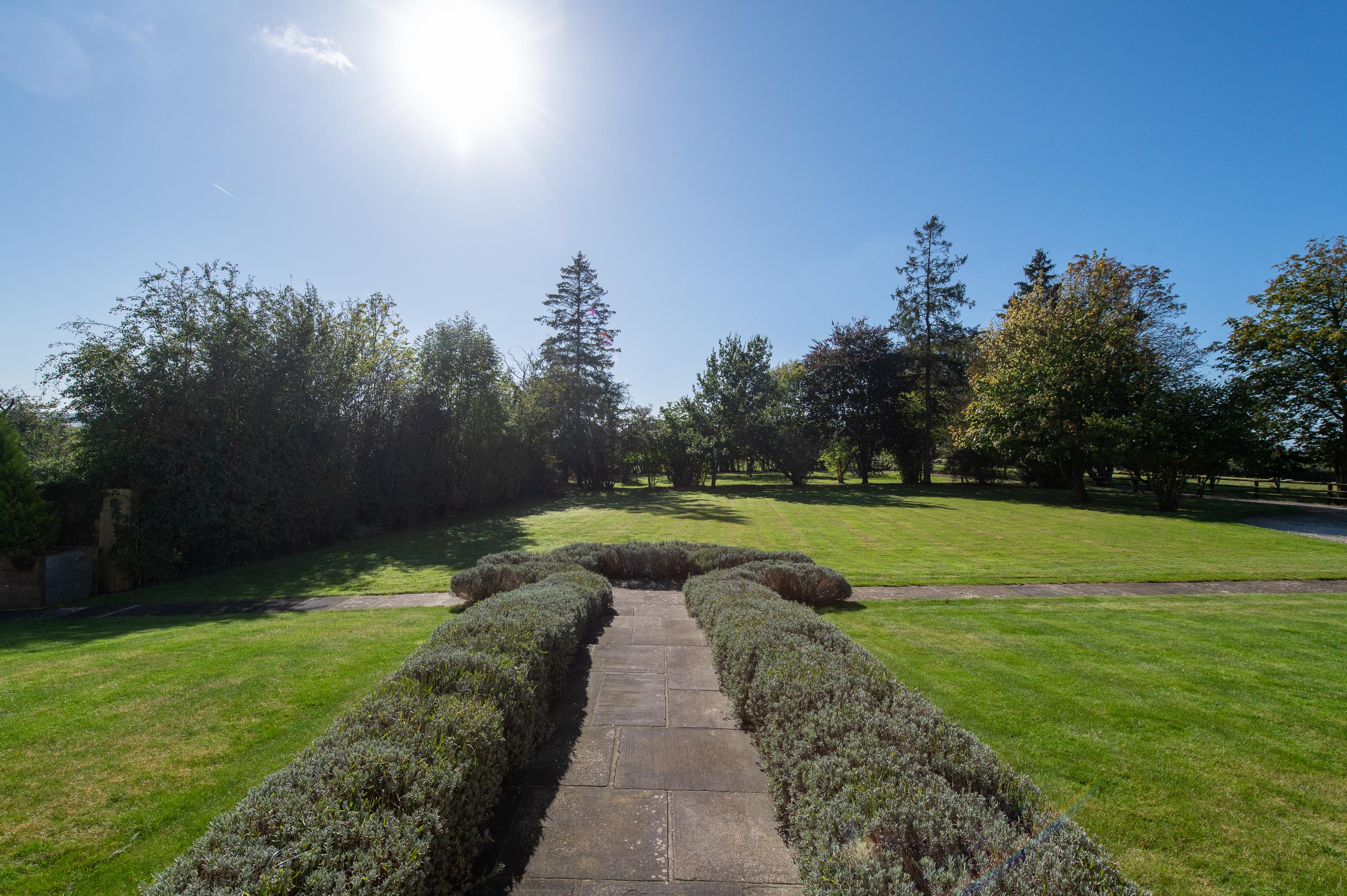Manor Farm is approached from a quiet country lane through a traditional 5 bar gate, down a long sweeping drive to a gravelled parking area to the south side of the house, with a lavender-lined flagstone path to the front door. The gardens are sheltered and lawned with mature trees and shrubs, including evergreen oak, chestnut, birch, spruce and fruit trees. Brick-paved and gravelled seating and outdoor dining areas.