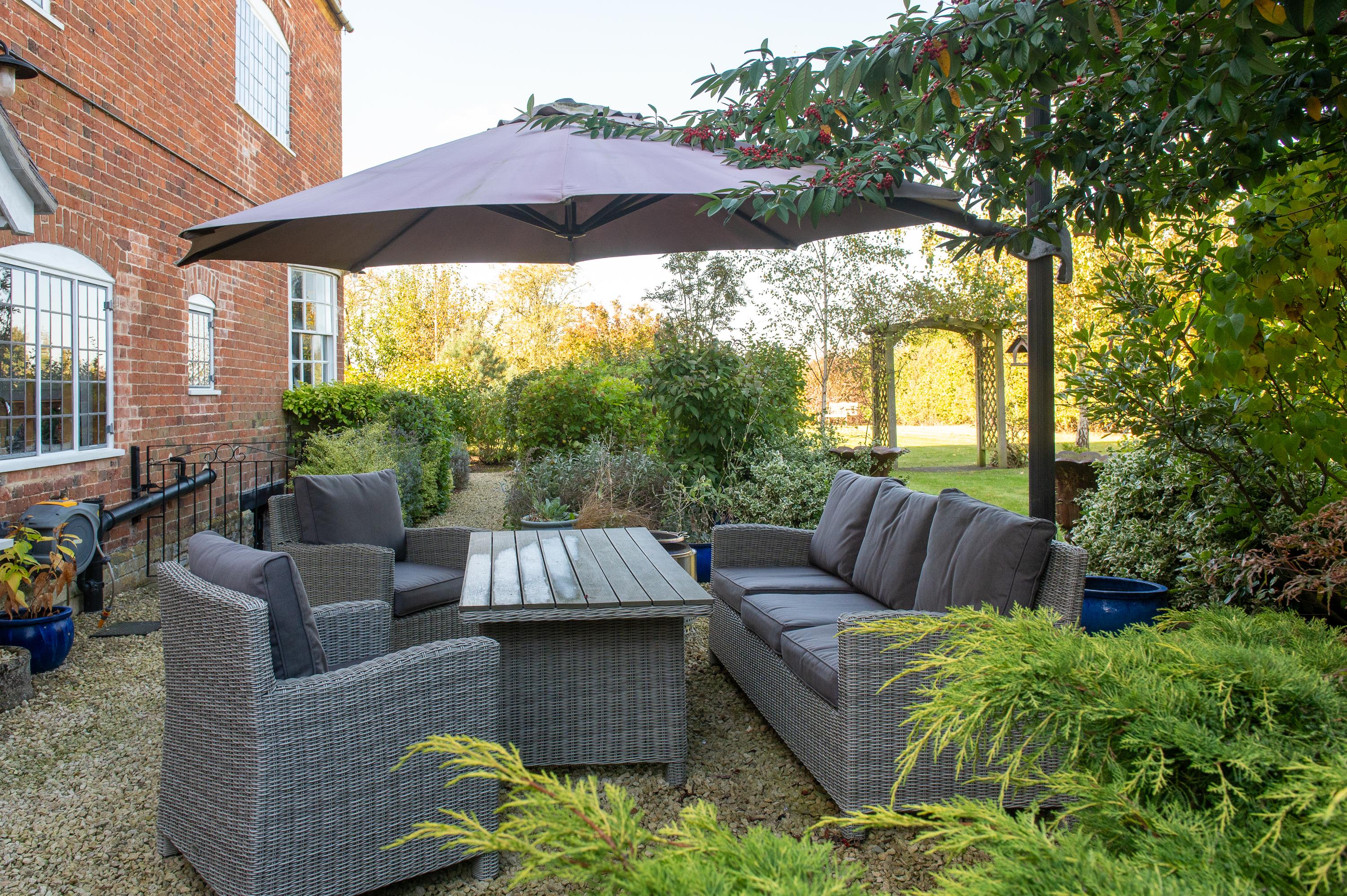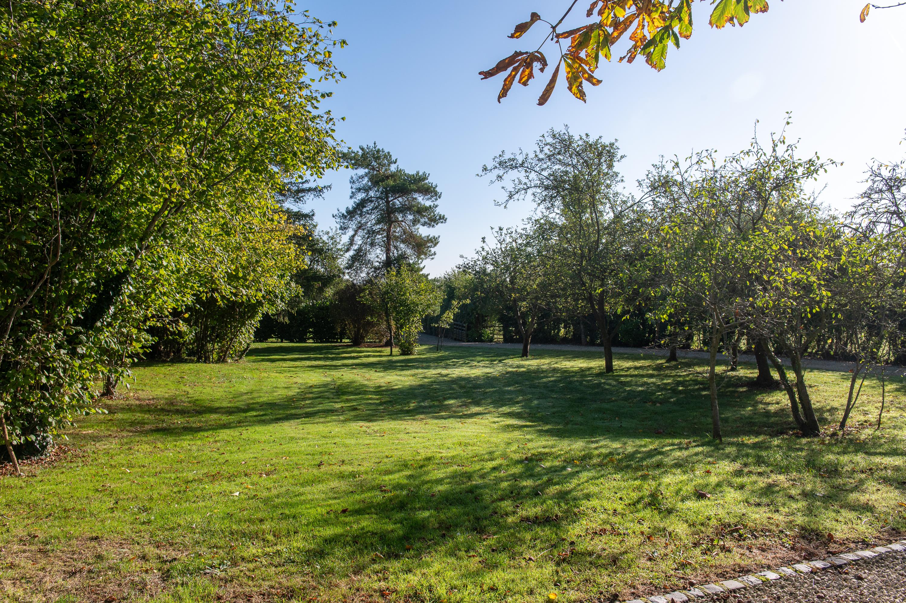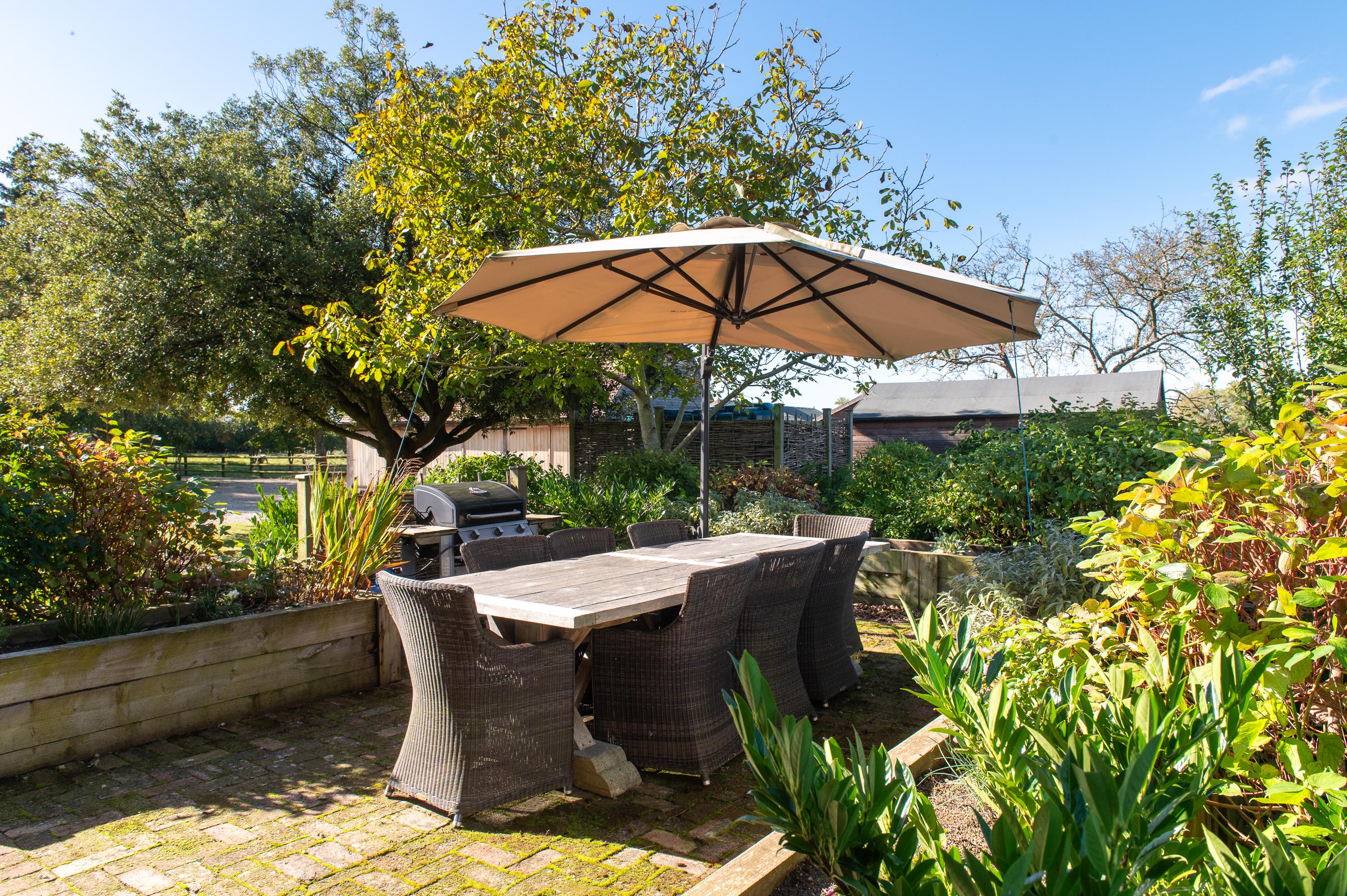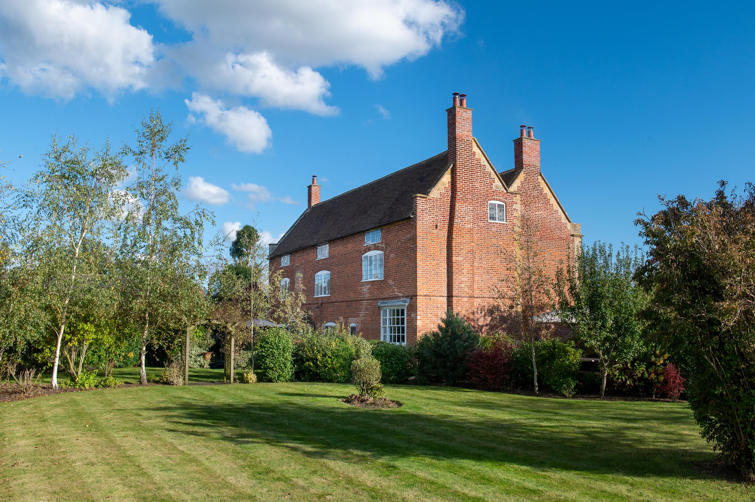 Manor Farm is approached from a quiet country lane through a traditional 5 bar gate, down a long sweeping drive to a gravelled parking area to the south side of the house, with a lavender-lined flagstone path to the front door. The gardens are sheltered and lawned with mature trees and shrubs, including evergreen oak, chestnut, birch, spruce and fruit trees. Brick-paved and gravelled seating and outdoor dining areas.