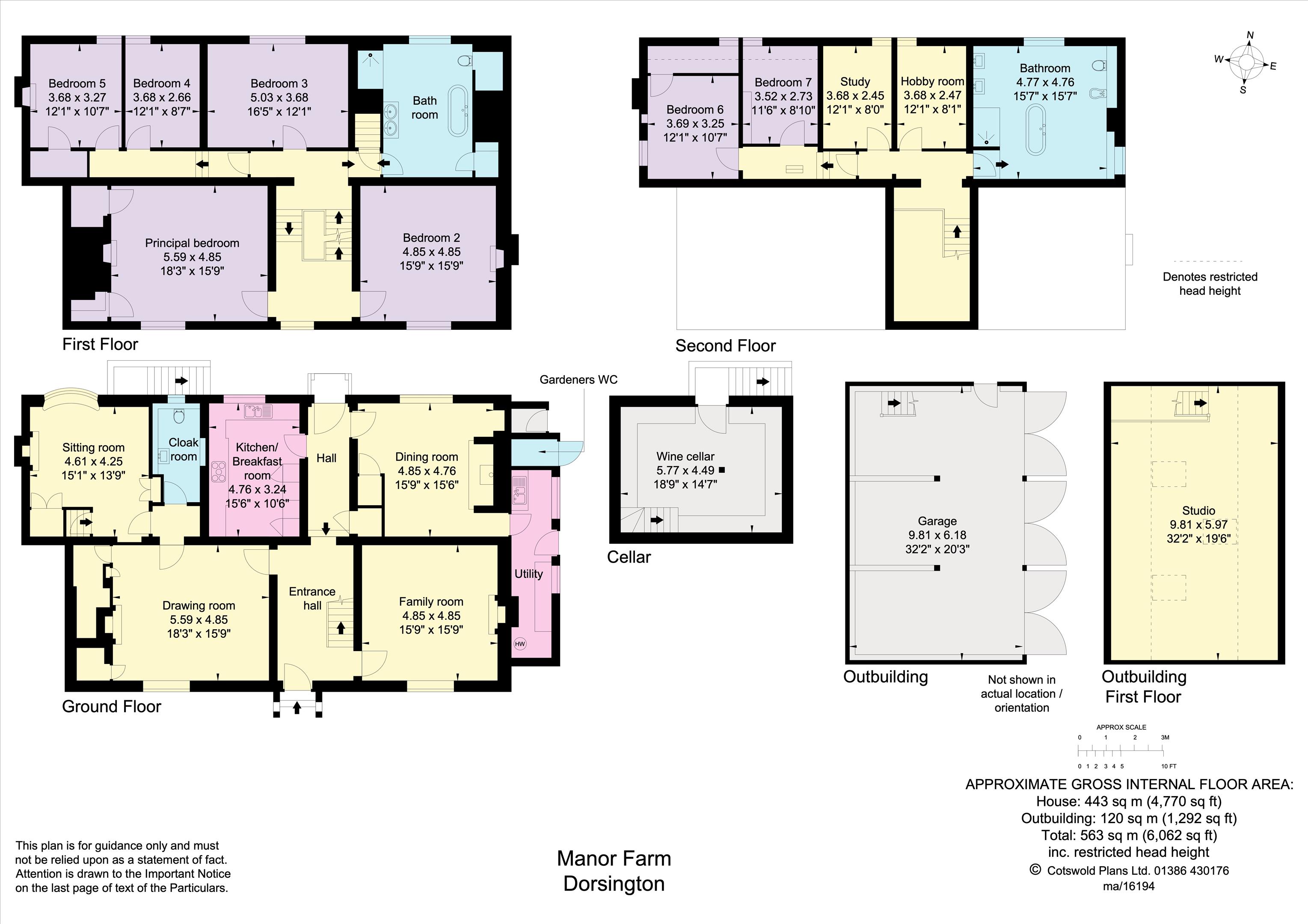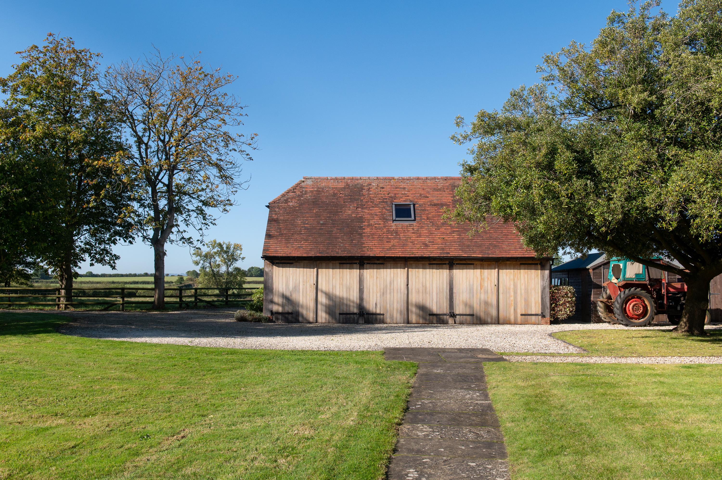 There is an oak-frame triple garage/workshop under a tile roof, with three pairs of double wooden doors, with an internal staircase to a studio room above with three roof lights.