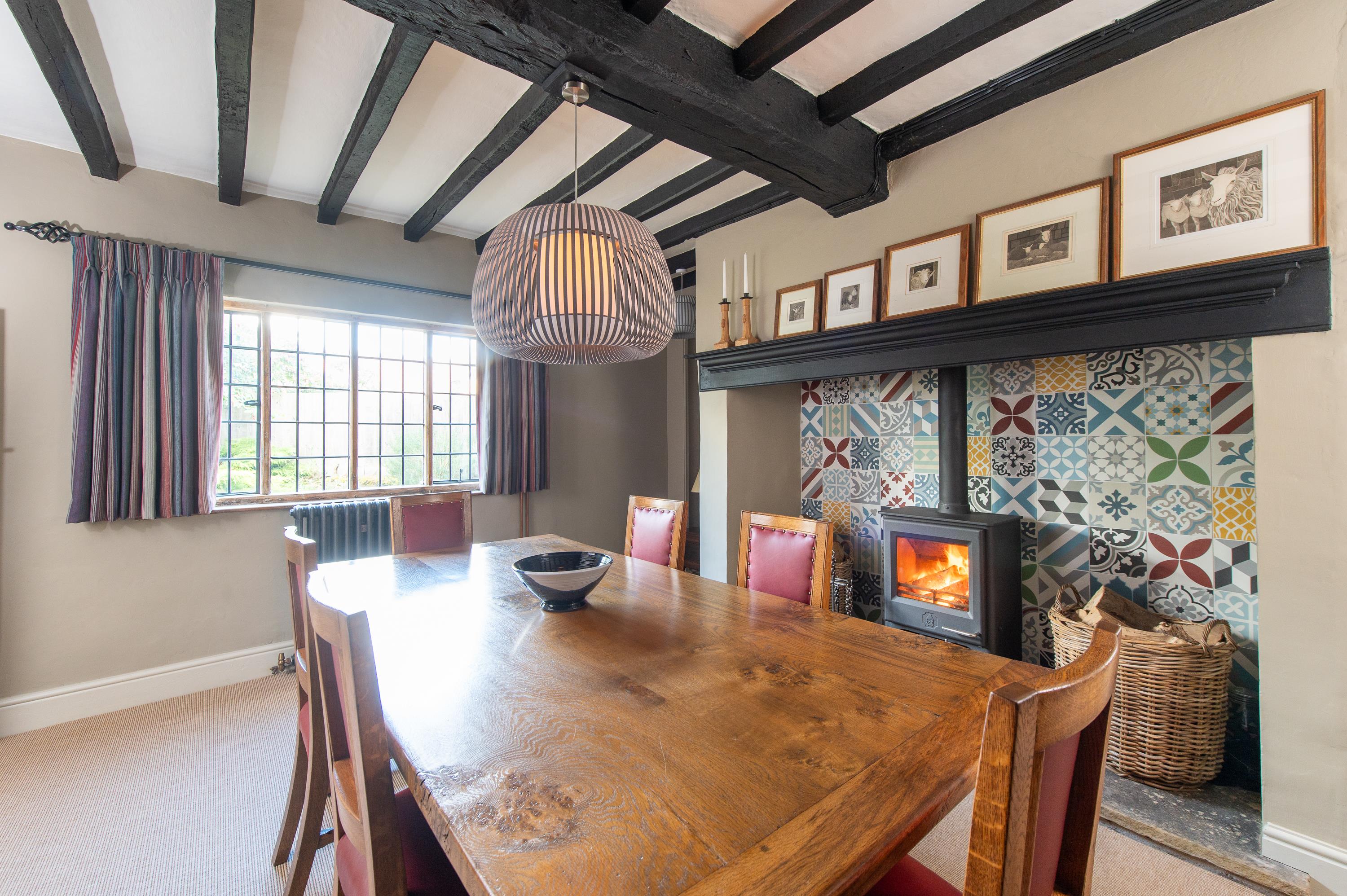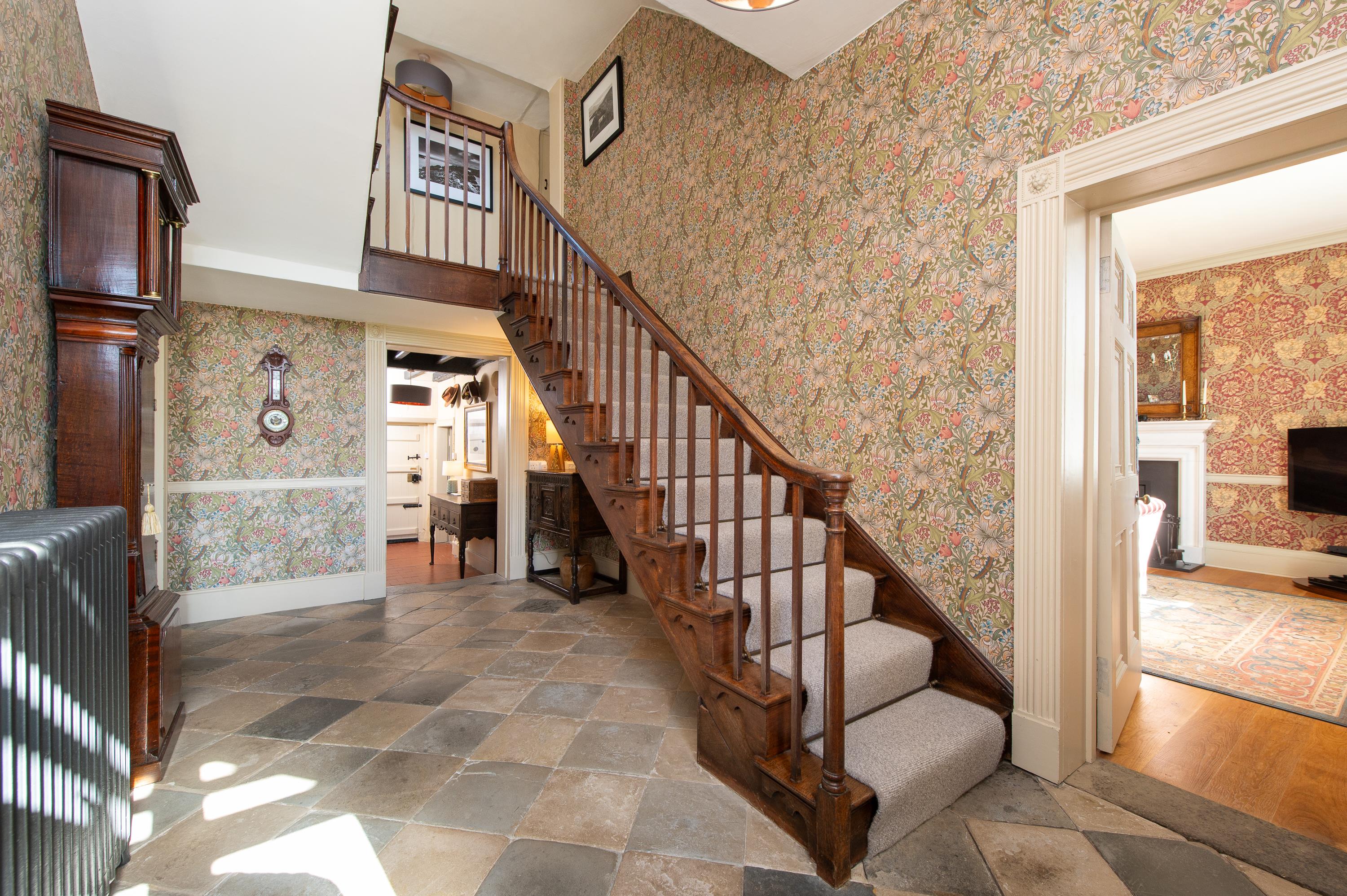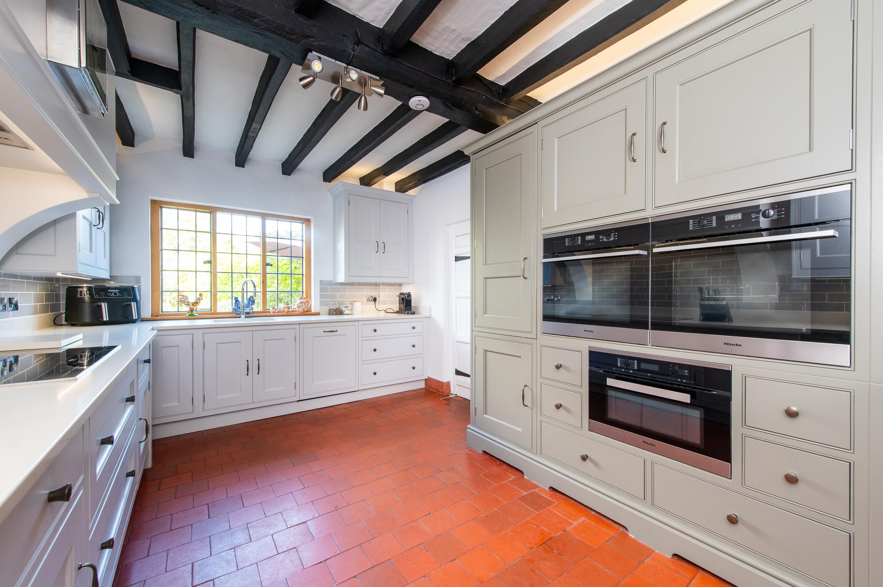 The fitted kitchen has painted units with integrated appliances, Corian worktops and induction hob with extractor over, ovens and microwave, quarry tile floor. Utility room with plumbing and door to outside. Traditional panelled doors with fluted carved architraves and dado rails, traditional cast iron radiators and new copper pipework, exposed ceiling timbers and polished boarded floors. There are a number of hardwood leaded windows and traditional cast iron fireplaces to some bedrooms. Cellar with sump pump.