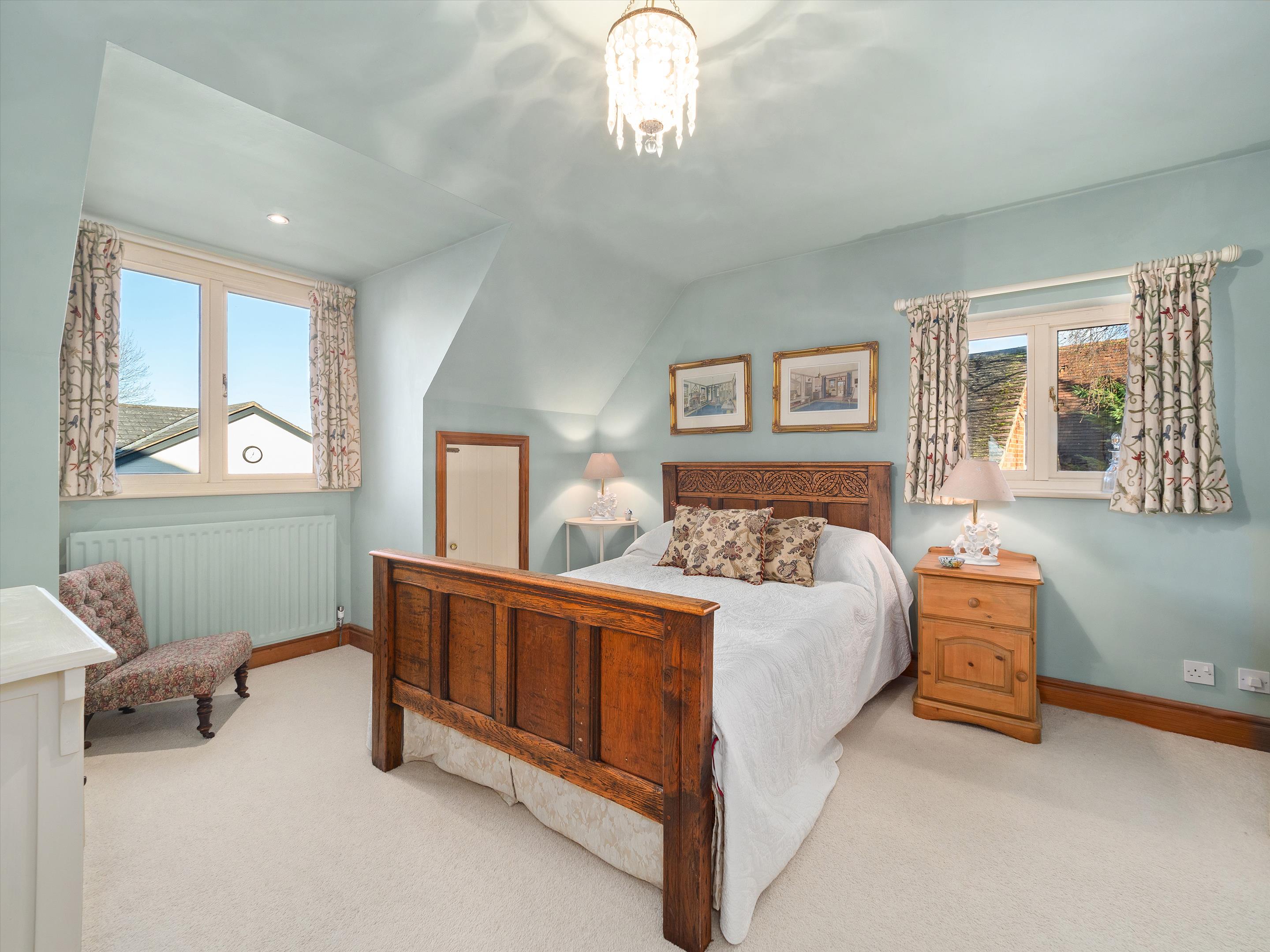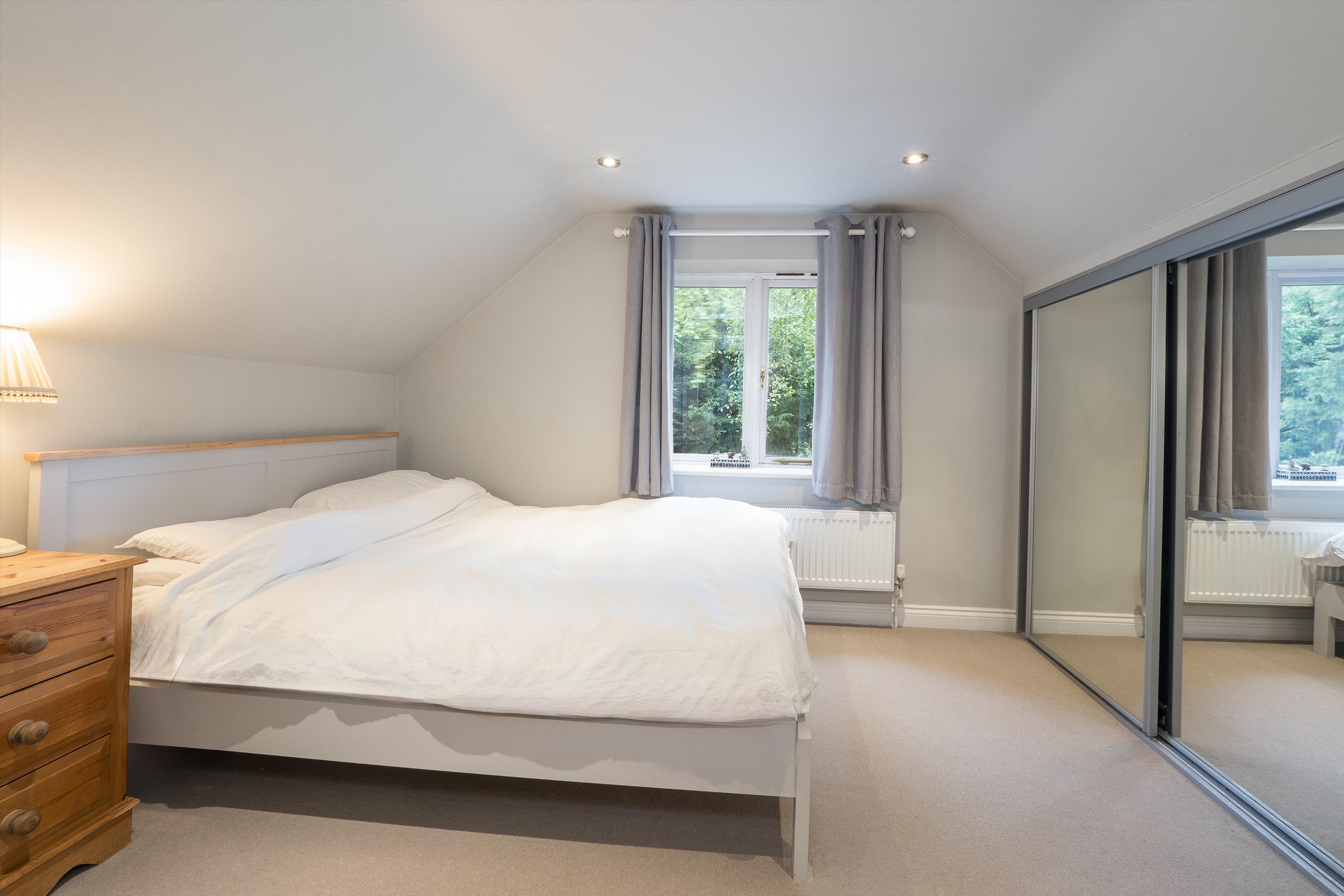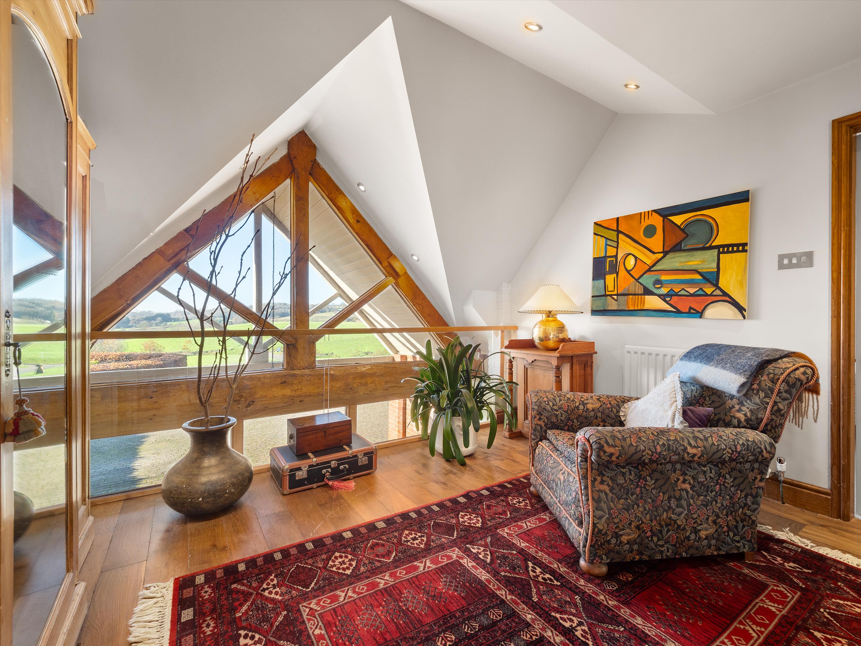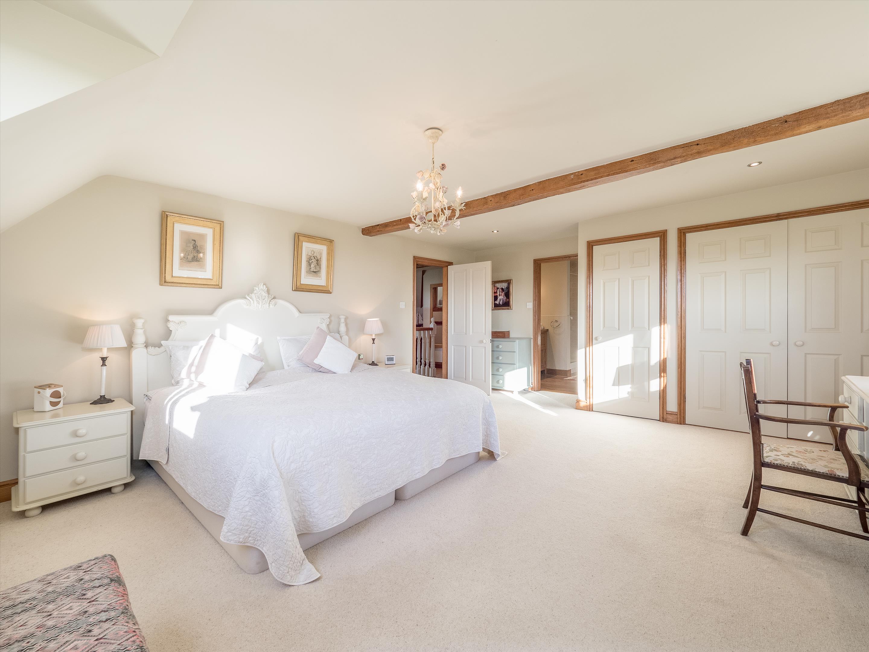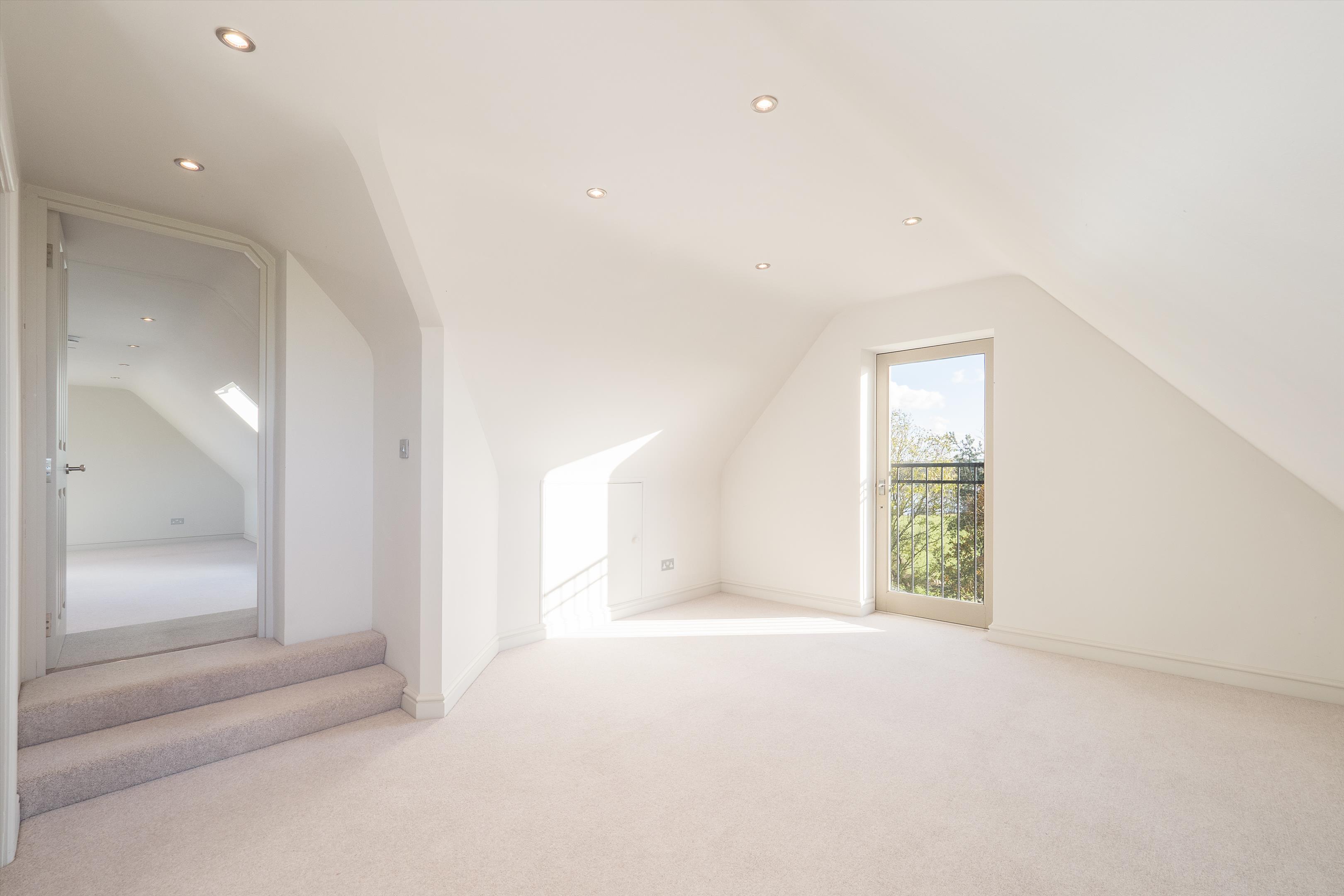 The first floor features an oak-floored landing with an apex window leading to a principal bedroom suite with dual aspects and an en suite bathroom. There are three additional generously sized bedrooms and two bathrooms (one of which is en suite). The second floor features a central living area, two further bedrooms, and a shower room.