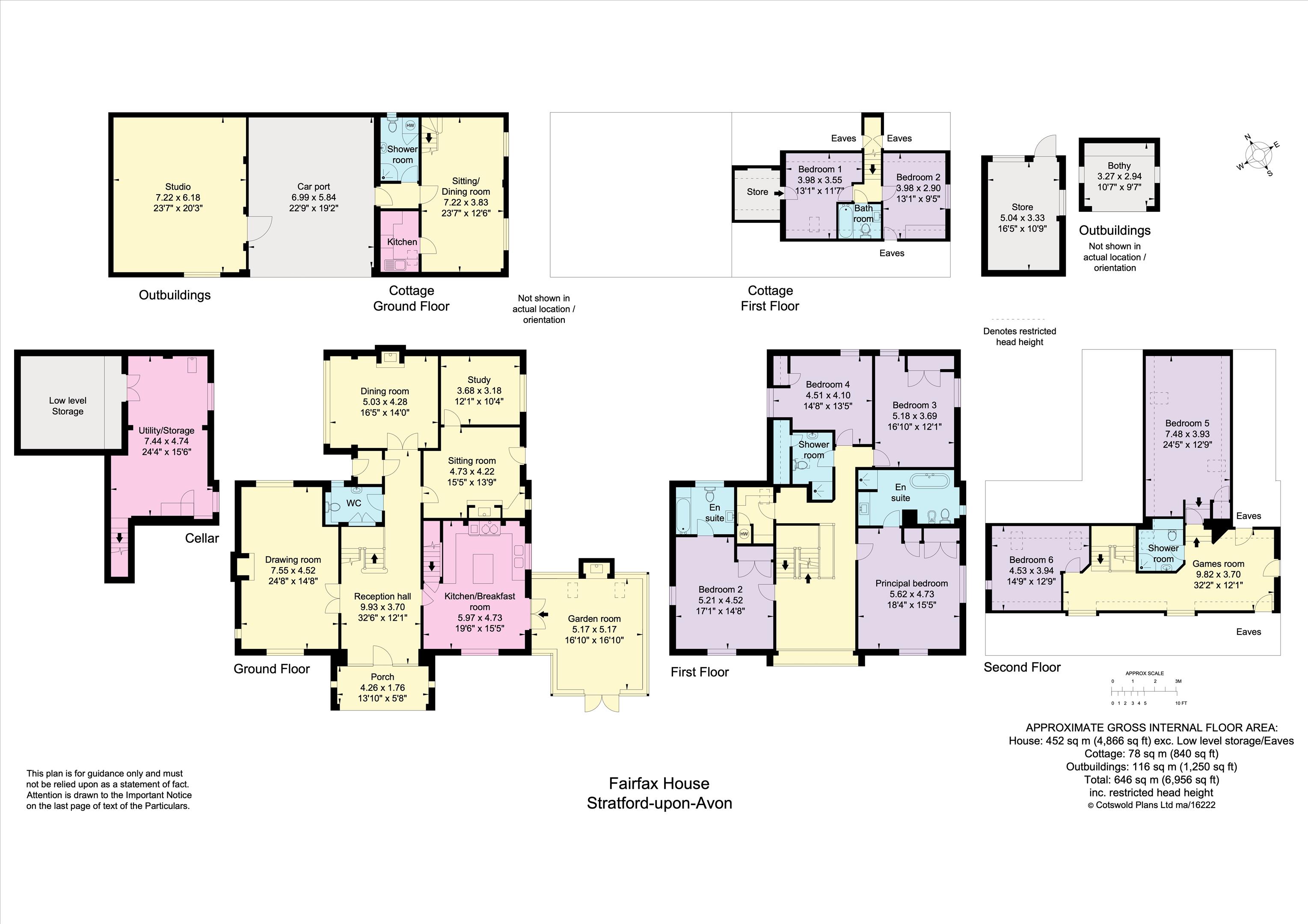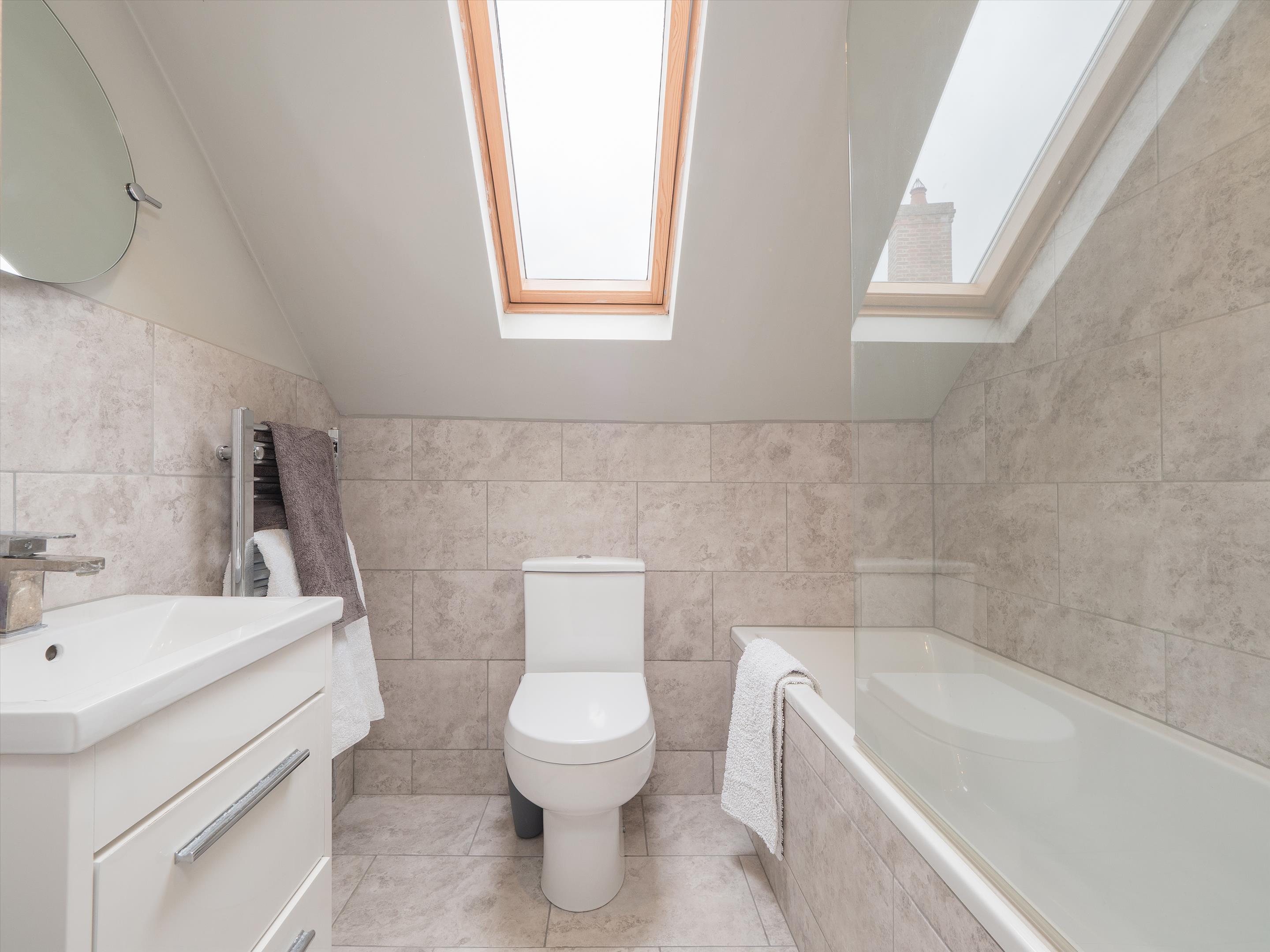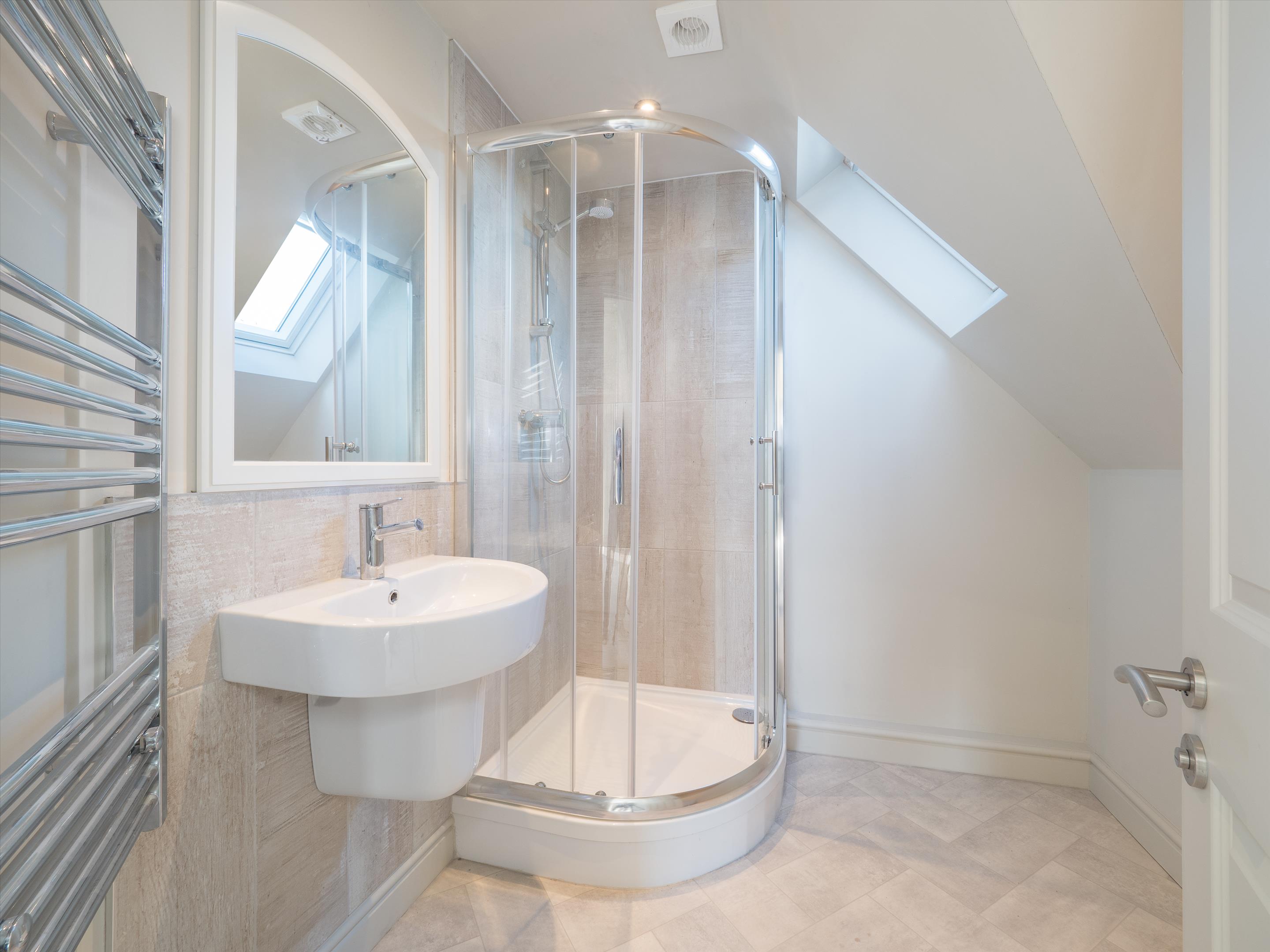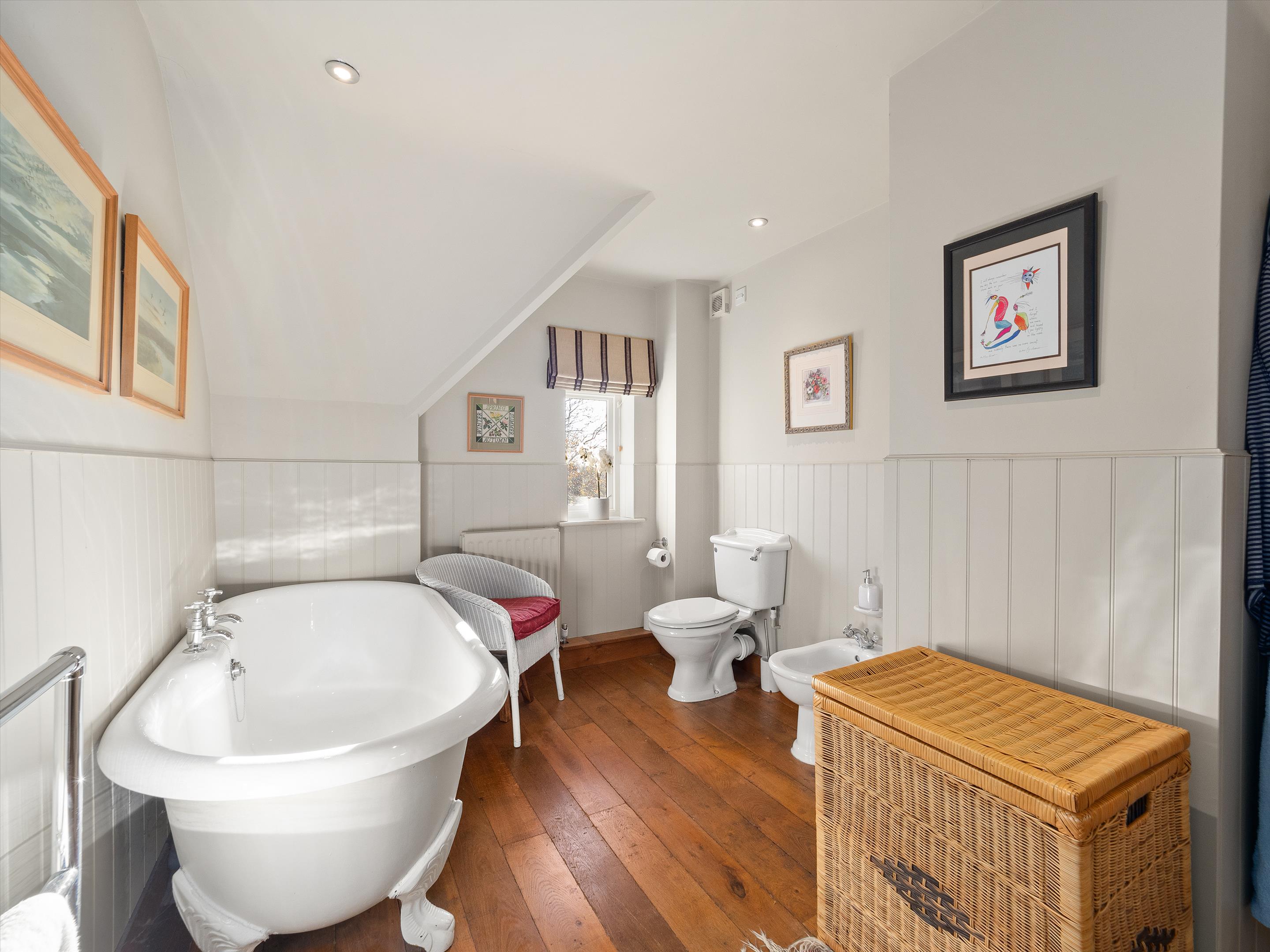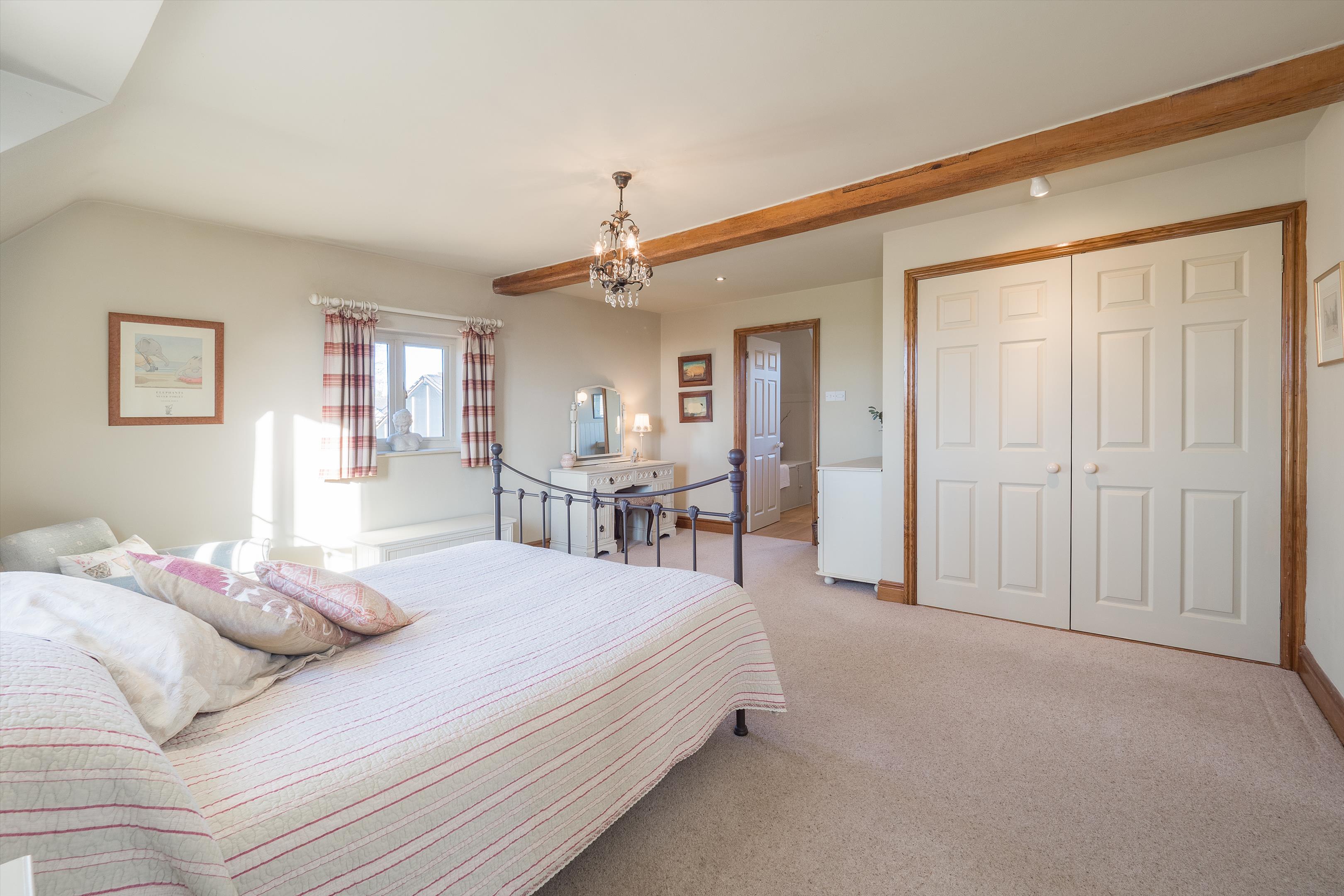 The first floor features an oak-floored landing with an apex window leading to a principal bedroom suite with dual aspects and an en suite bathroom. There are three additional generously sized bedrooms and two bathrooms (one of which is en suite). The second floor features a central living area, two further bedrooms, and a shower room.
