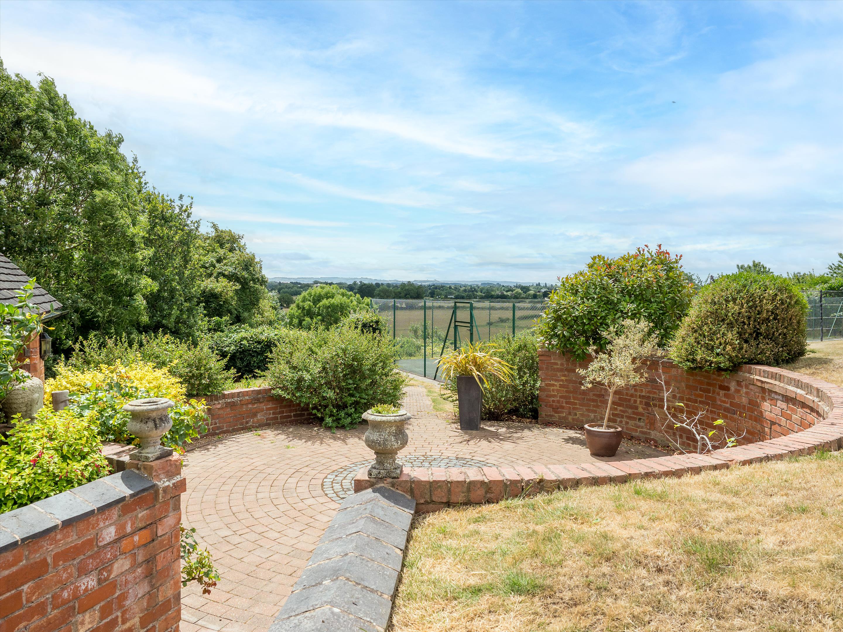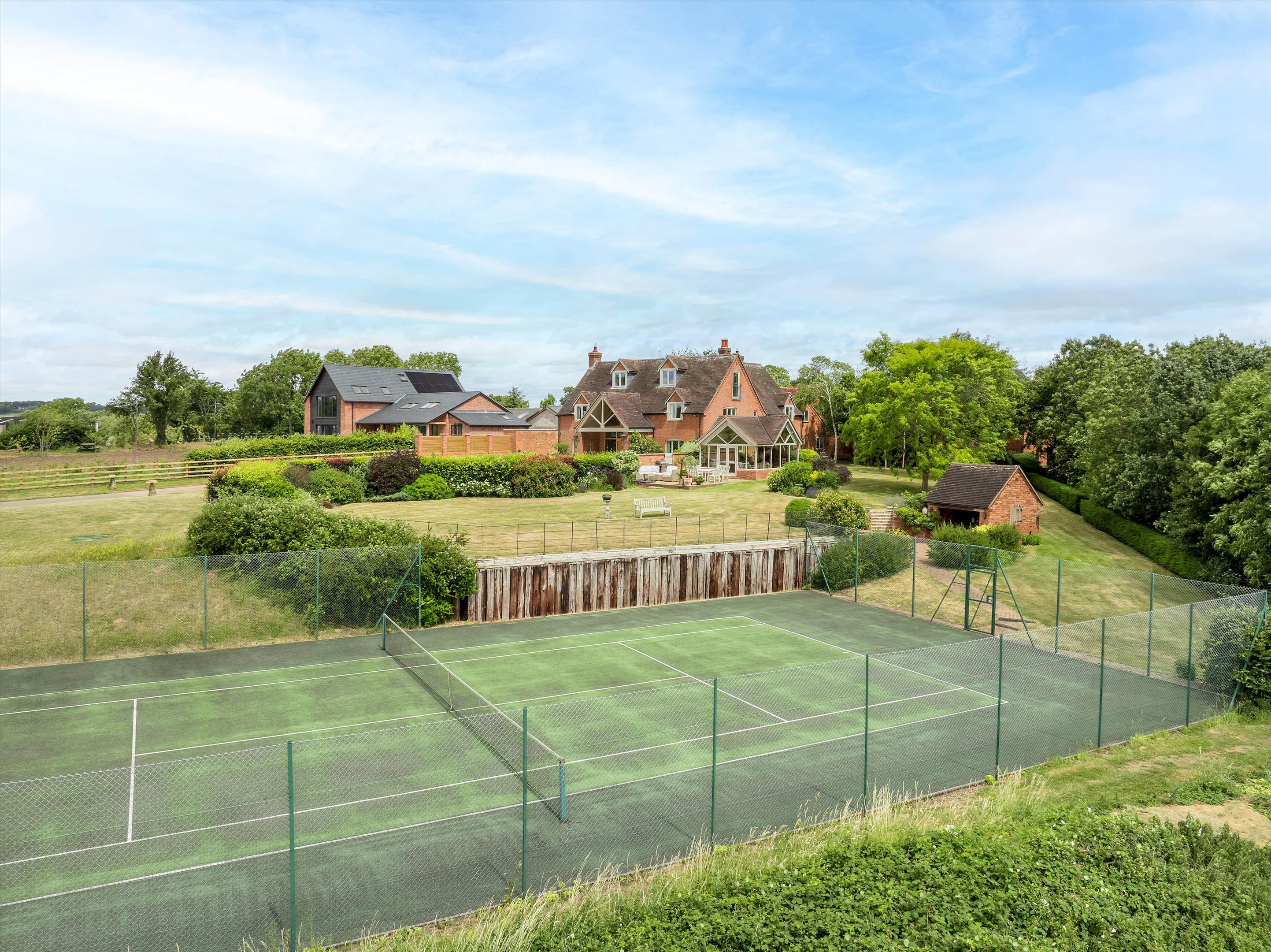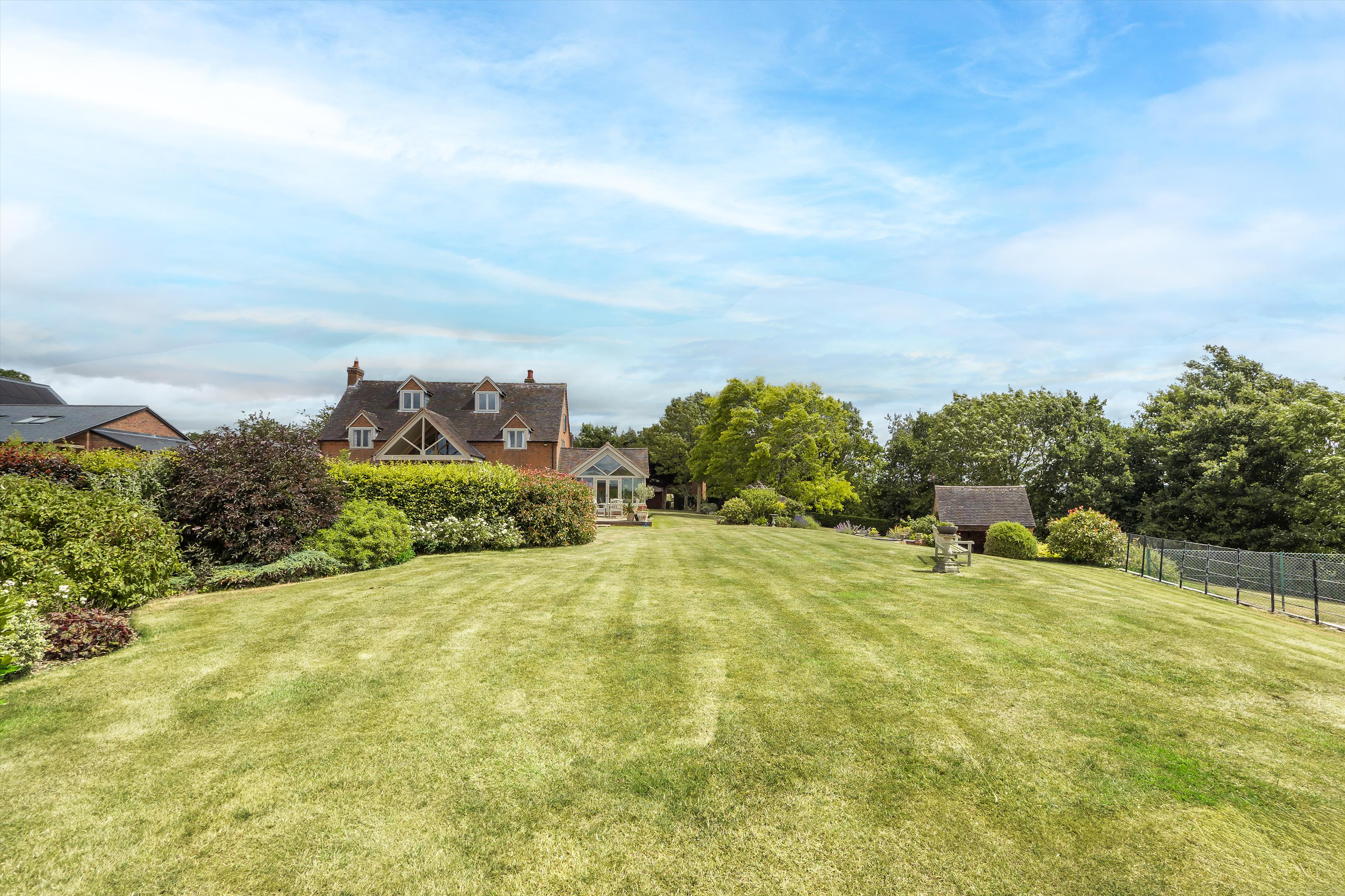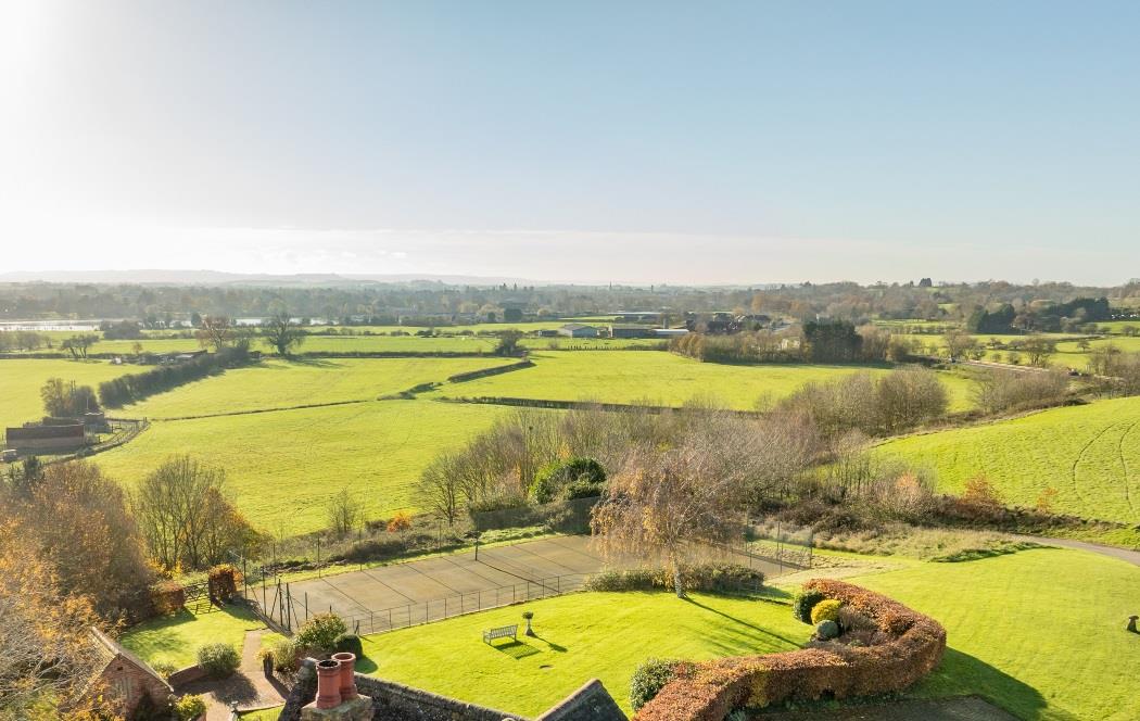 The beautiful formal gardens have a variety of mature trees, herbaceous borders, and large, predominantly lawned areas. A charming bothy with a circular terrace overlooks the tennis court, providing a perfect vantage point for spectators while offering enviable views over Stratford-upon-Avon and the picturesque Cotswolds in the distance.
