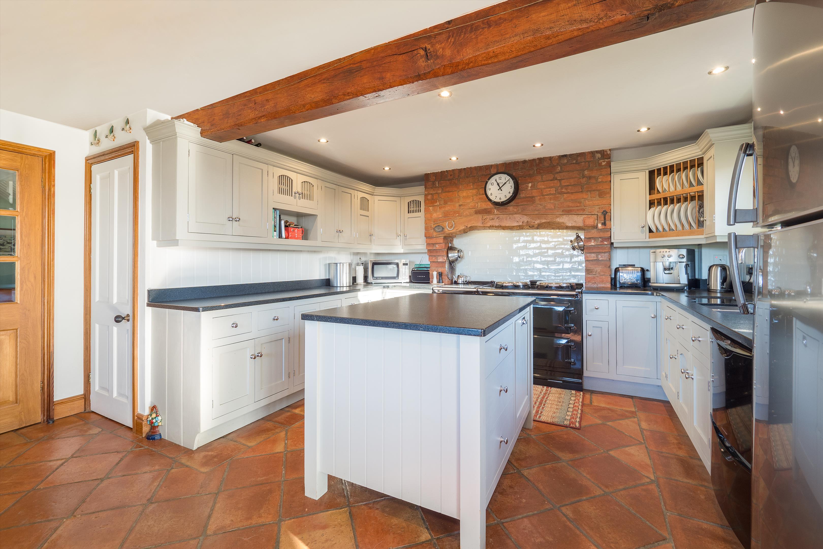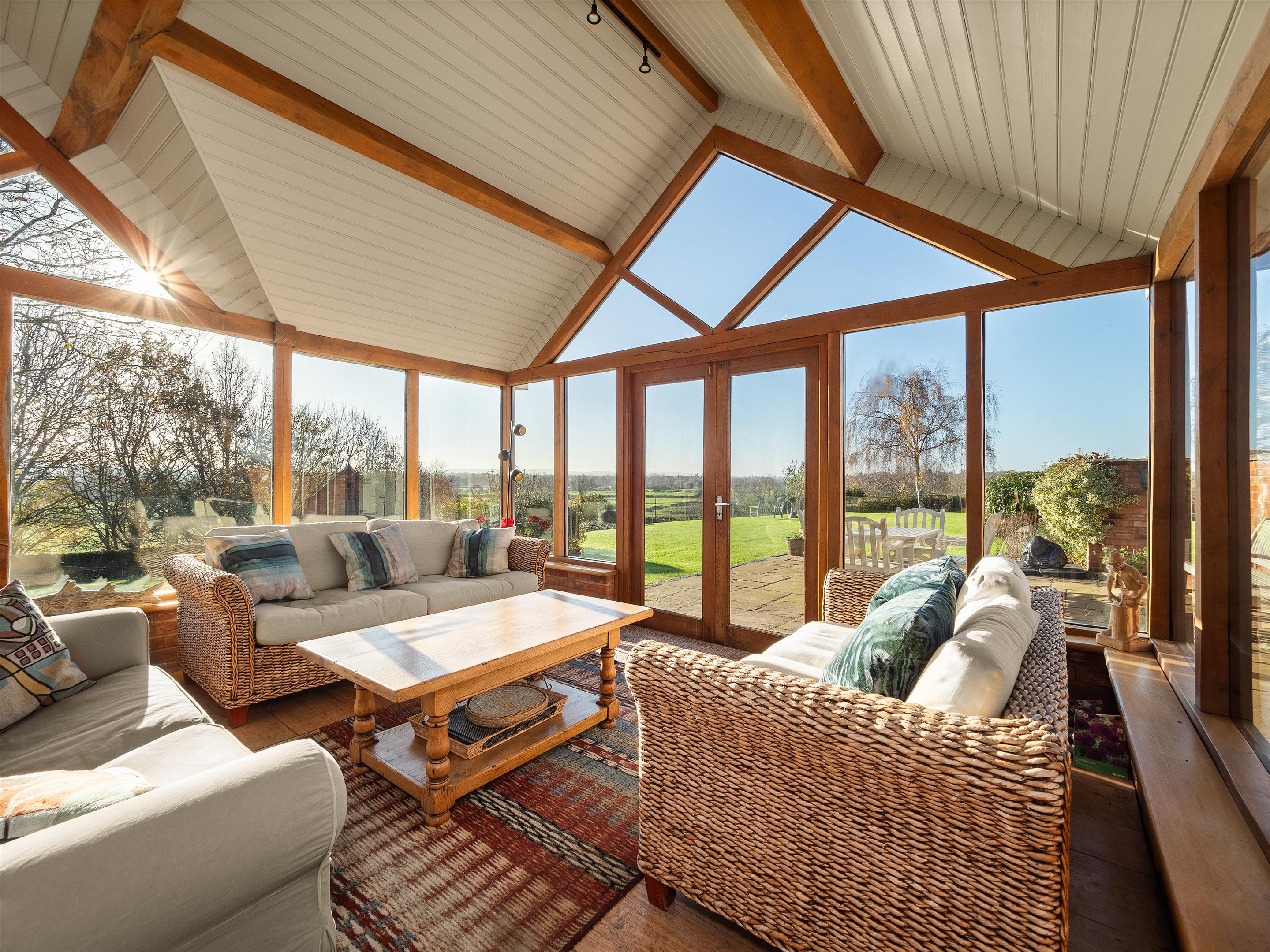 The kitchen breakfast room is the heart of the home, designed for family living with a range of painted oak units, a central island, and a matte granite worktop. An electric AGA adds character to the space, with plenty of room for a large dining table. Double doors lead to a delightful garden room, where you can relax and enjoy the breathtaking views.