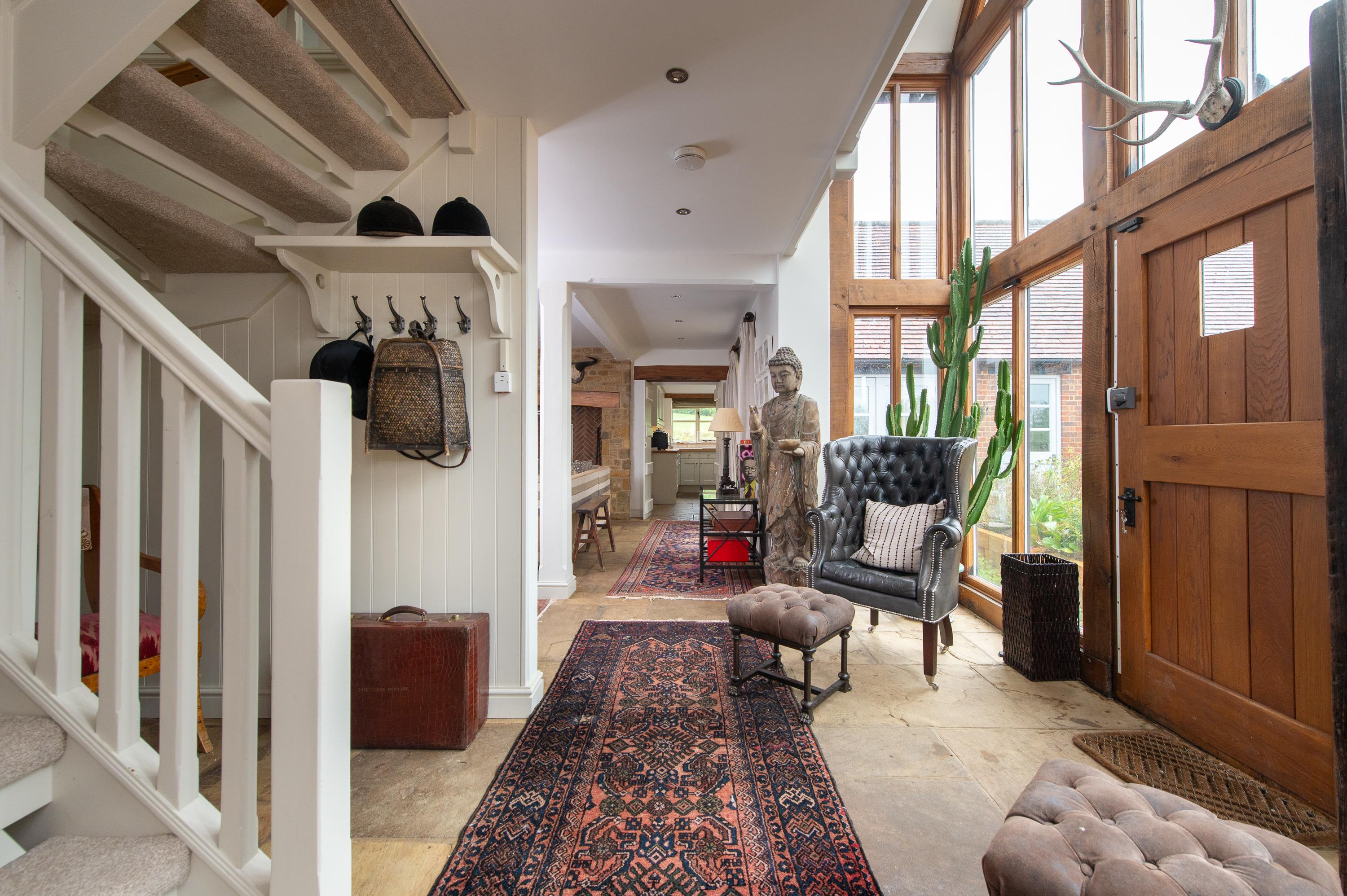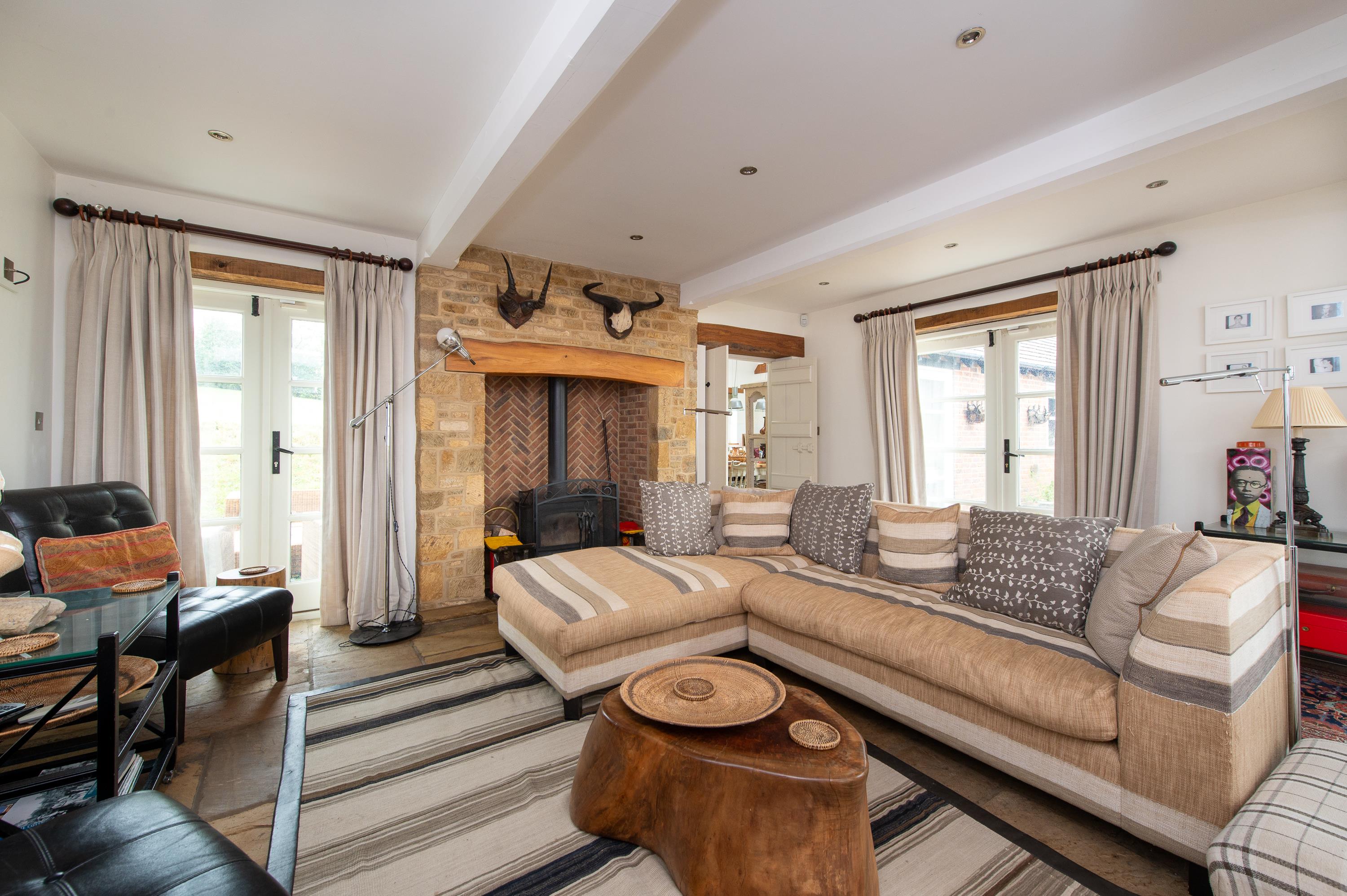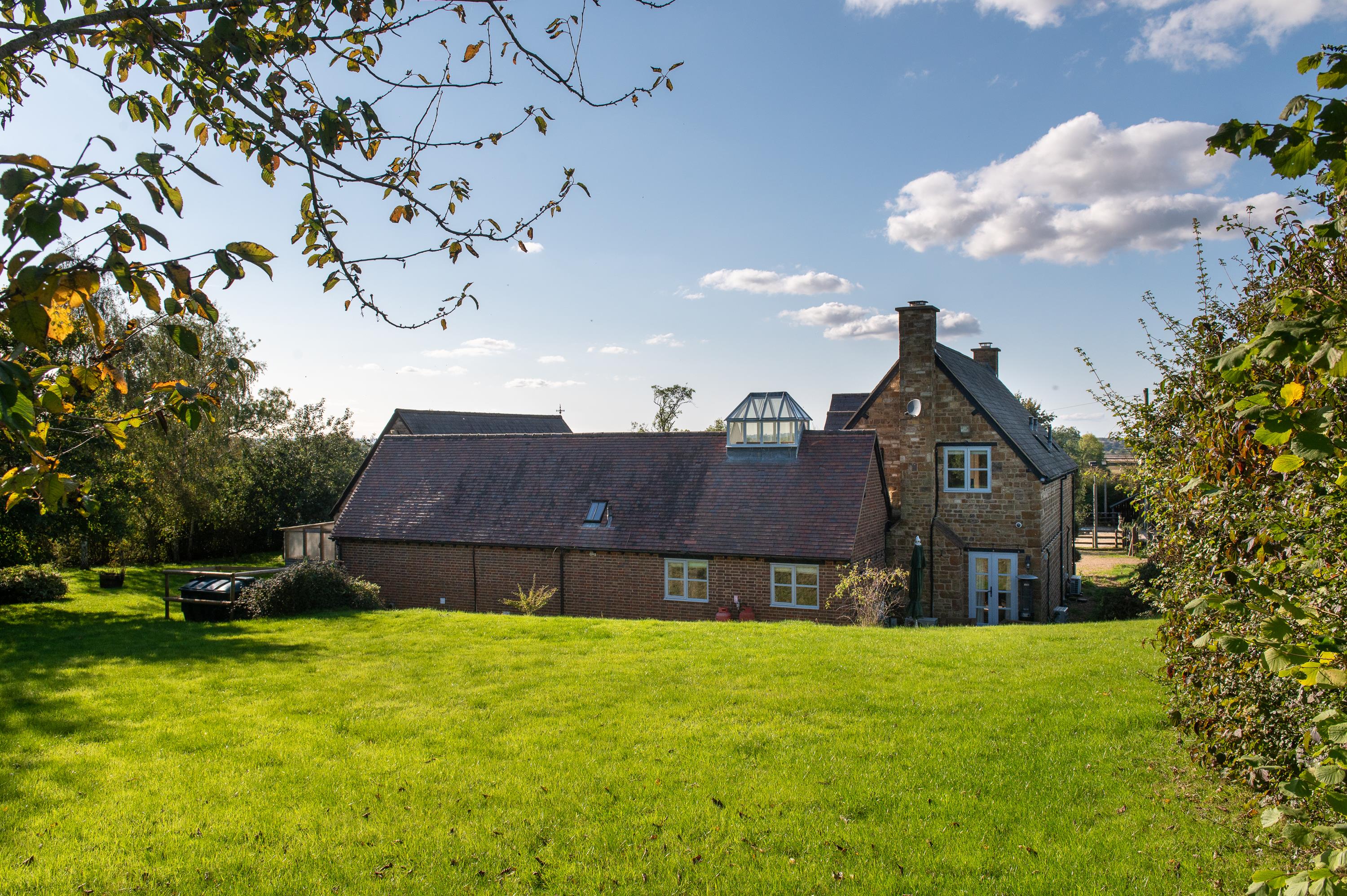The house at Oaklands Stables was built in 2005 of Hornton stone under a slate roof, with a brick single-storey wing under a tiled roof. With air conditioning, flagstone floors, vaulted kitchen with exposed roof truss and roof lantern above, an extensive range of painted kitchen units with timber tops and range cooker, sink and integrated appliances and a pantry. Expansive hall with a glazed and timber-gabled front. The open-plan living space provides a formal drawing room area with fireplace, study area and sitting room with stone and brick fireplace with a wood-burning stove and French doors to the front and rear gardens. Beyond the kitchen is a shower room/ WC, vaulted dining room and utility room.