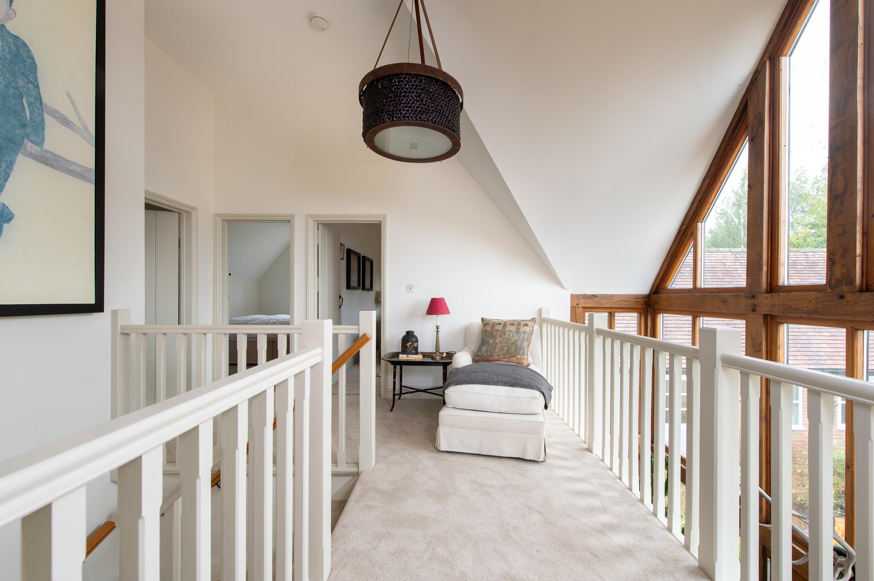 First floor galleried landing with expansive southerly views and a balcony and en suite shower room to the principal bedroom, two further bedrooms and family bathroom.