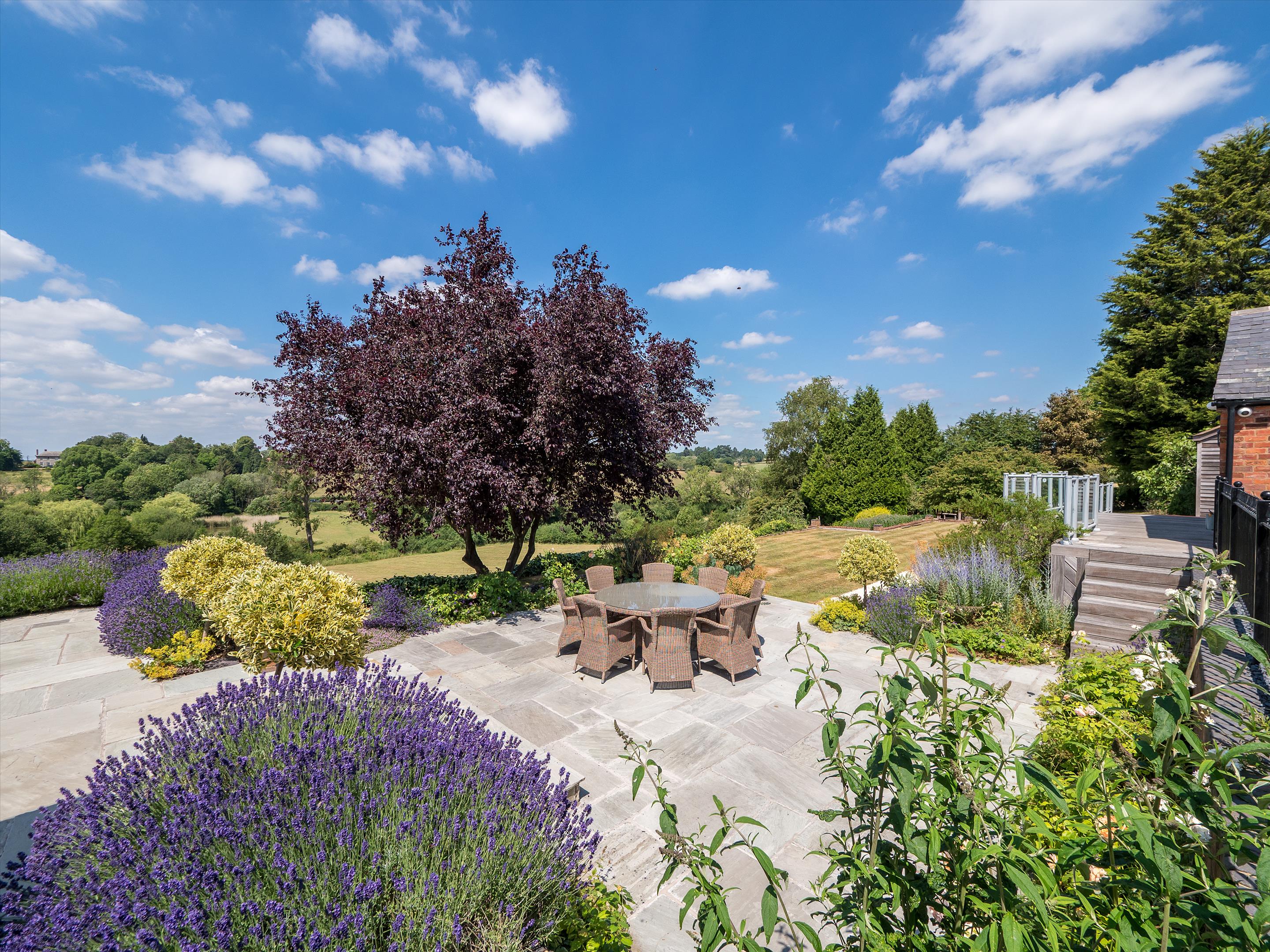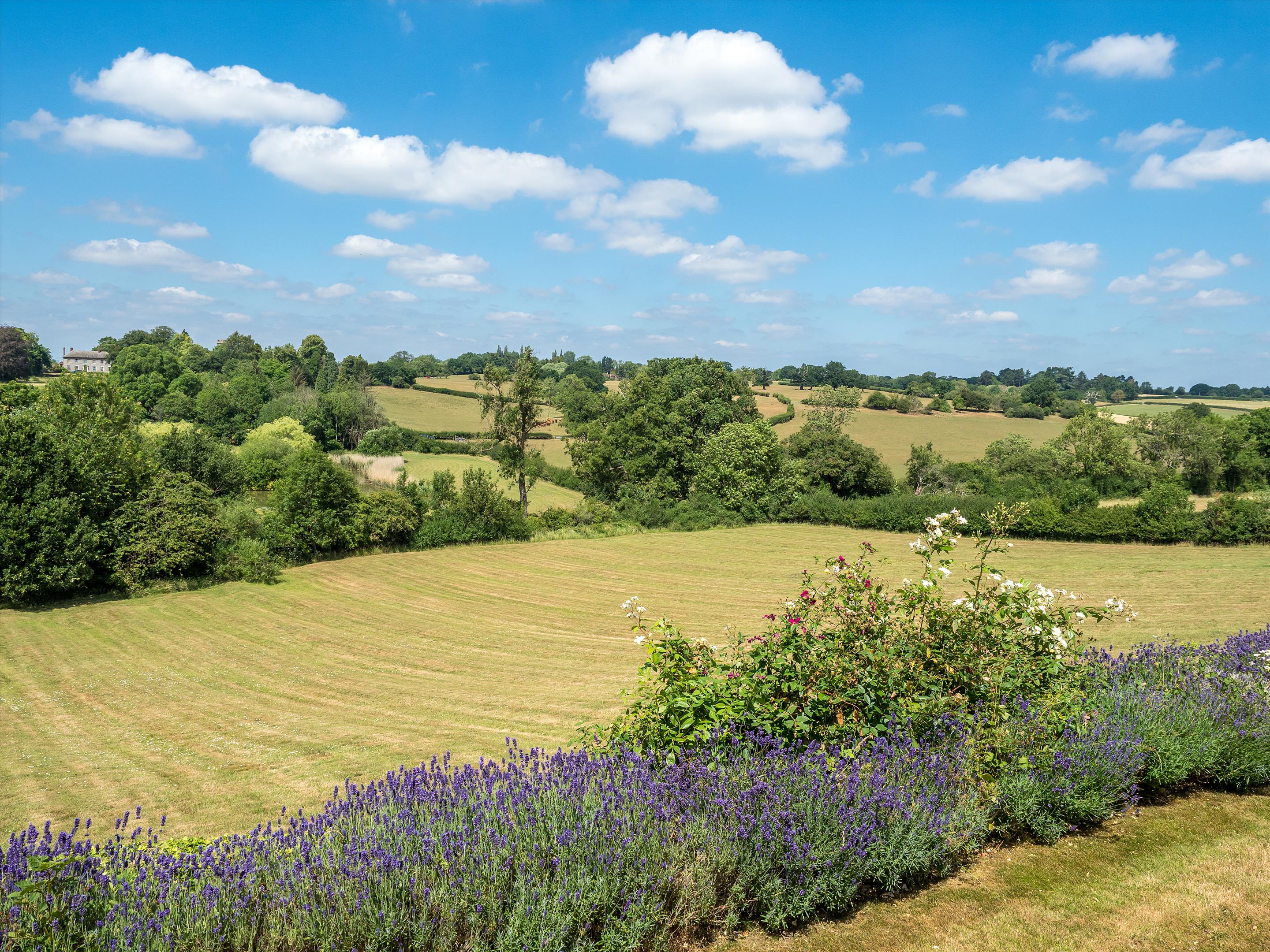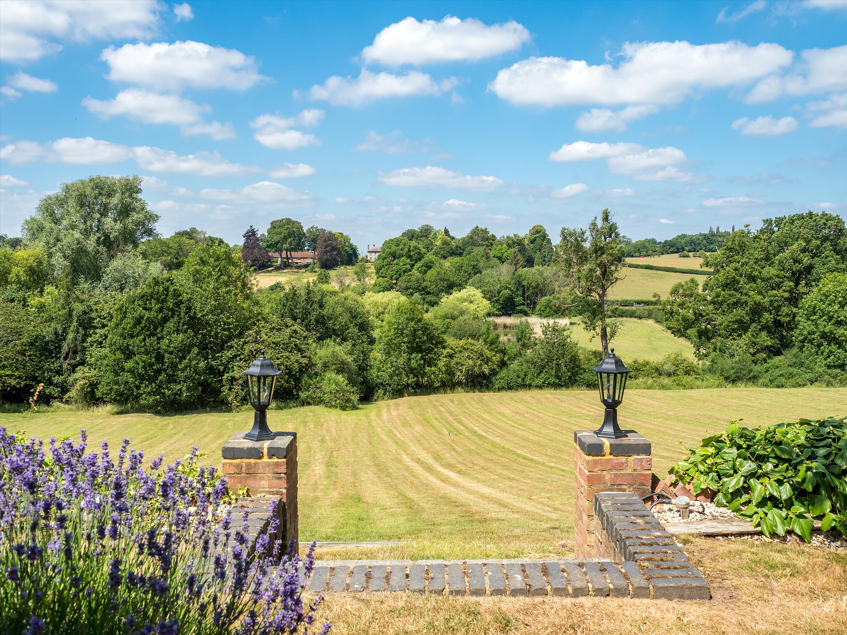 The formal gardens feature a variety of well-placed patio areas, allowing one to follow the sun throughout the day-ideal spaces for outdoor dining and entertaining, with a well-positioned fire pit to provide comfort and warmth during the autumn and winter evenings. A great range of mature herbaceous shrub beds, lavender borders, and specimen trees complement the formal gardens beautifully. Steps lead down from the South Lawn to the first of several fields, which also provide access to the beautiful lake-another peaceful spot to enjoy.