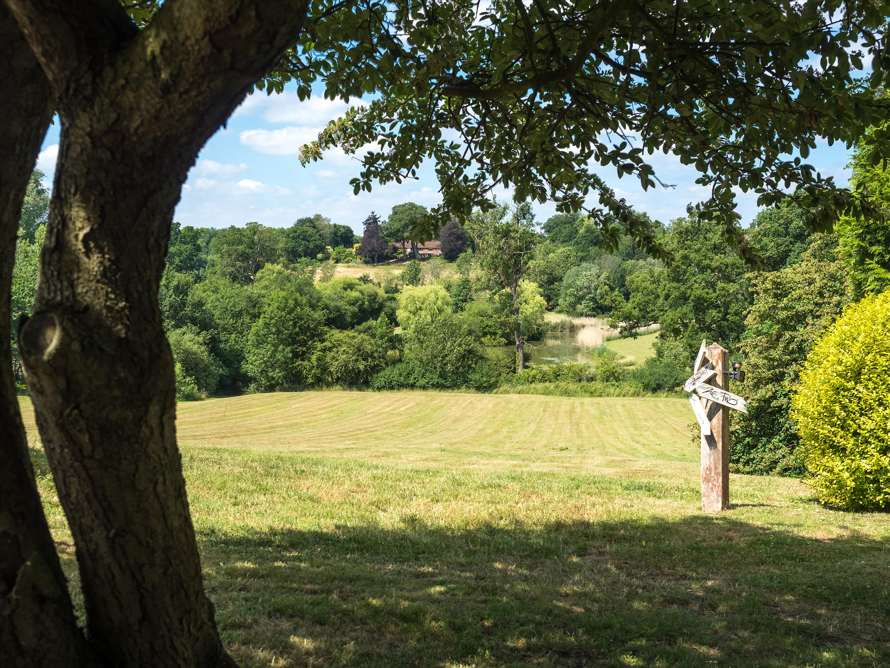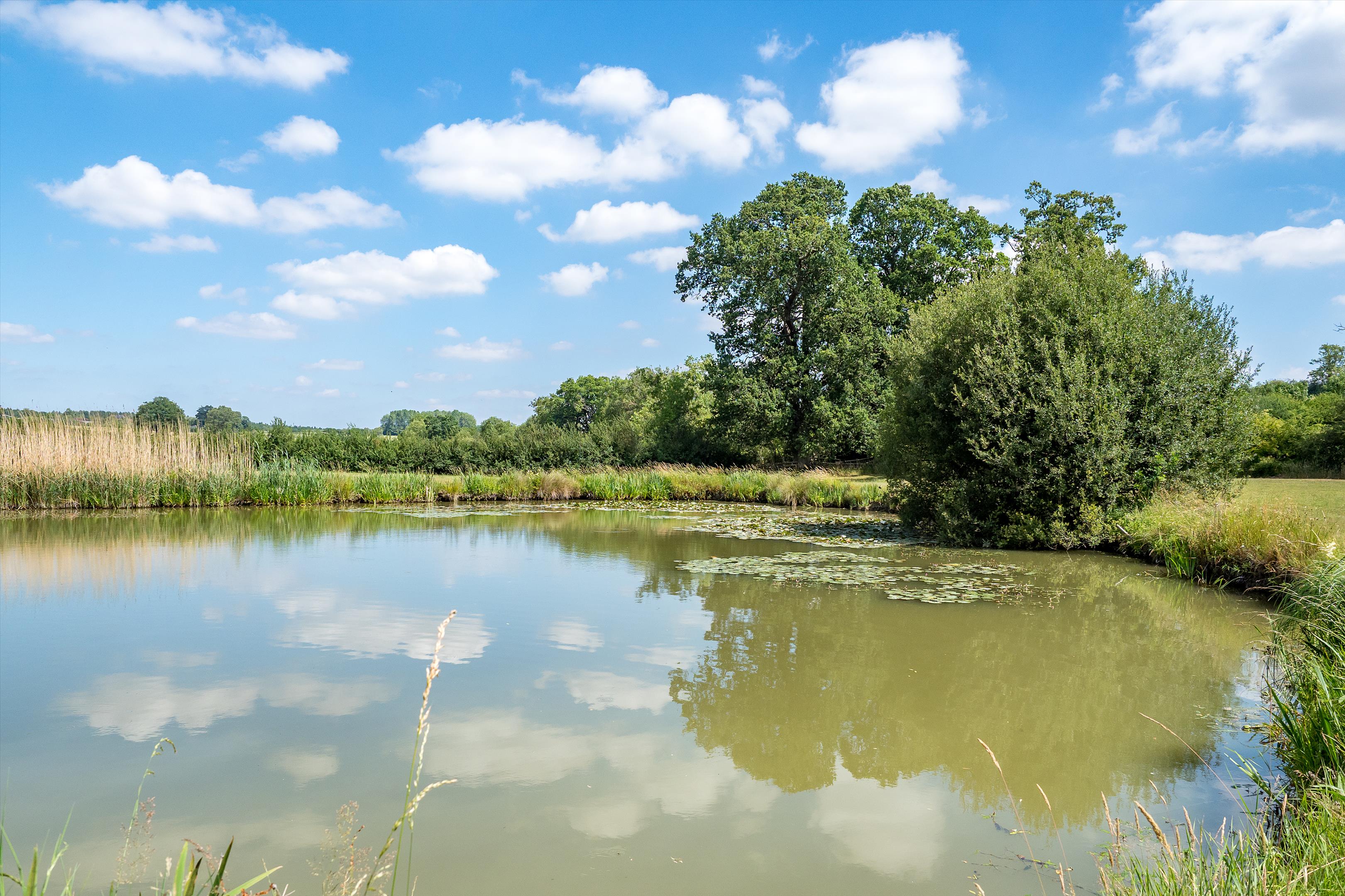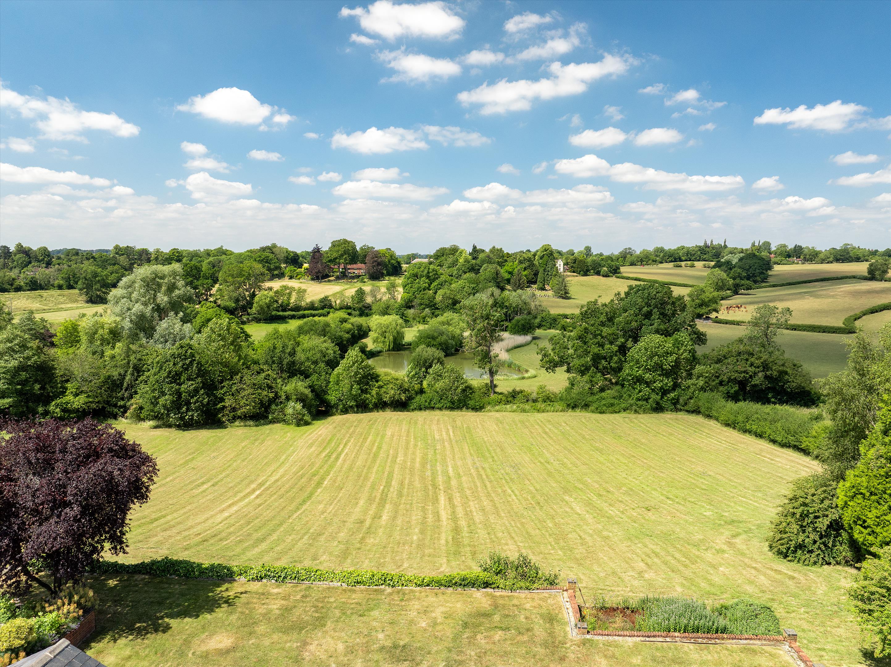 The formal gardens feature a variety of well-placed patio areas, allowing one to follow the sun throughout the day-ideal spaces for outdoor dining and entertaining, with a well-positioned fire pit to provide comfort and warmth during the autumn and winter evenings. A great range of mature herbaceous shrub beds, lavender borders, and specimen trees complement the formal gardens beautifully. Steps lead down from the South Lawn to the first of several fields, which also provide access to the beautiful lake-another peaceful spot to enjoy.