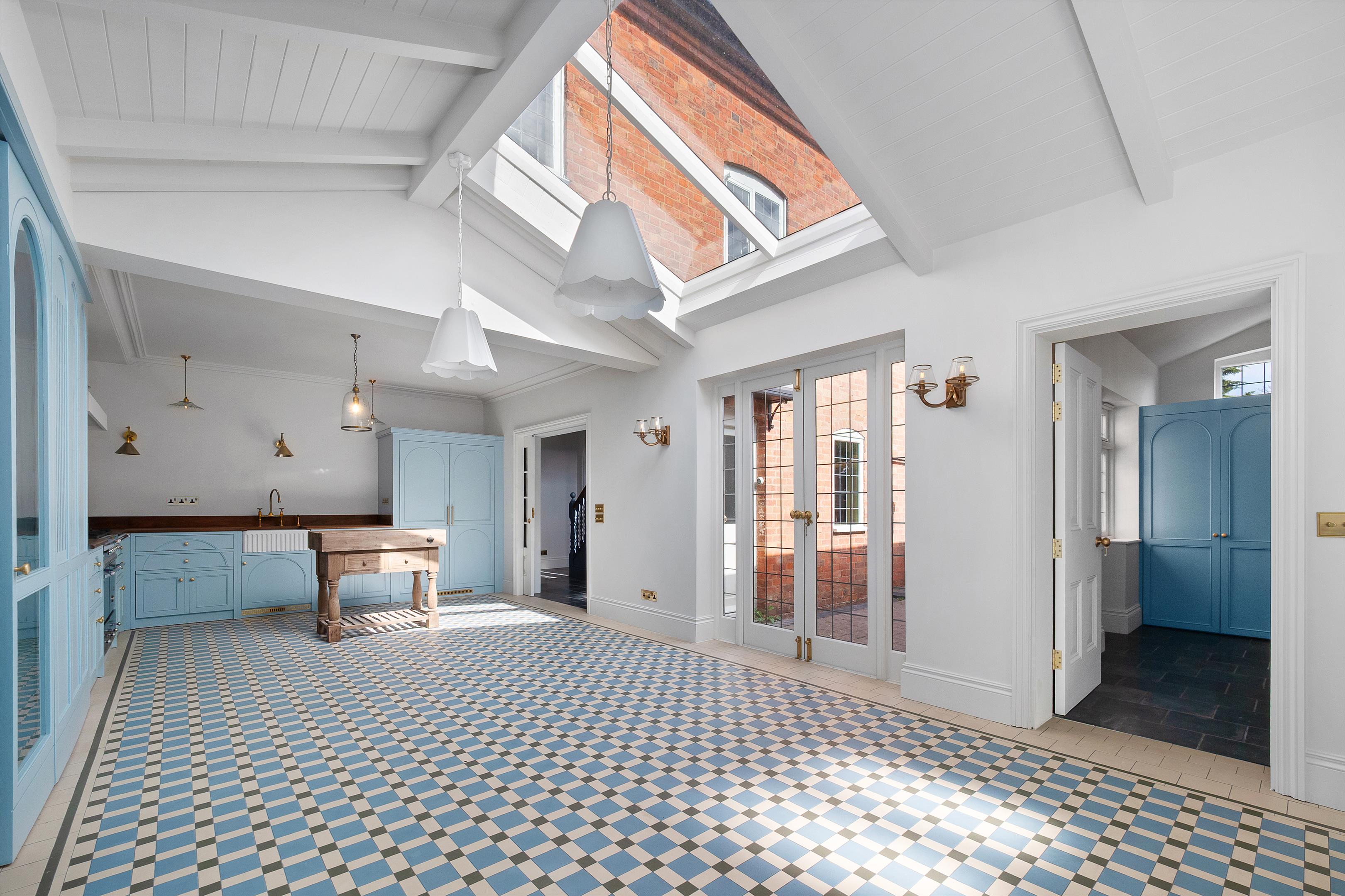 The entrance hall provides access to the principal reception rooms, including a dual-aspect drawing room featuring a fireplace and double doors opening onto the rear garden. A separate dining room and sitting room offer ample space for family living, while a beautiful orangery overlooks the formal gardens and expansive grounds beyond. The kitchen/breakfast room serves as the heart of the home, complete with a practical pantry. Additionally, a home study, boot room, and cloakroom complete the versatile ground floor accommodation.