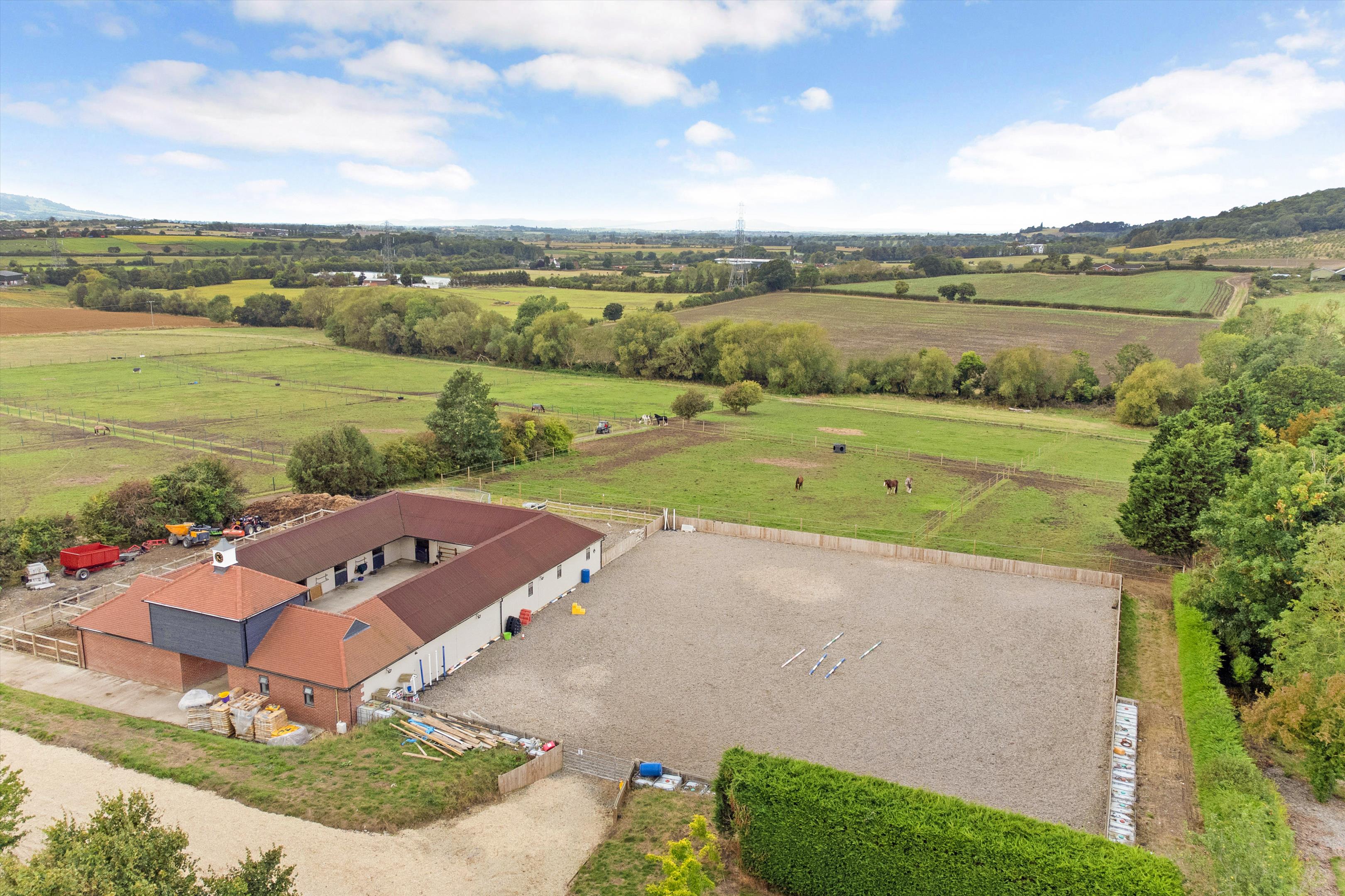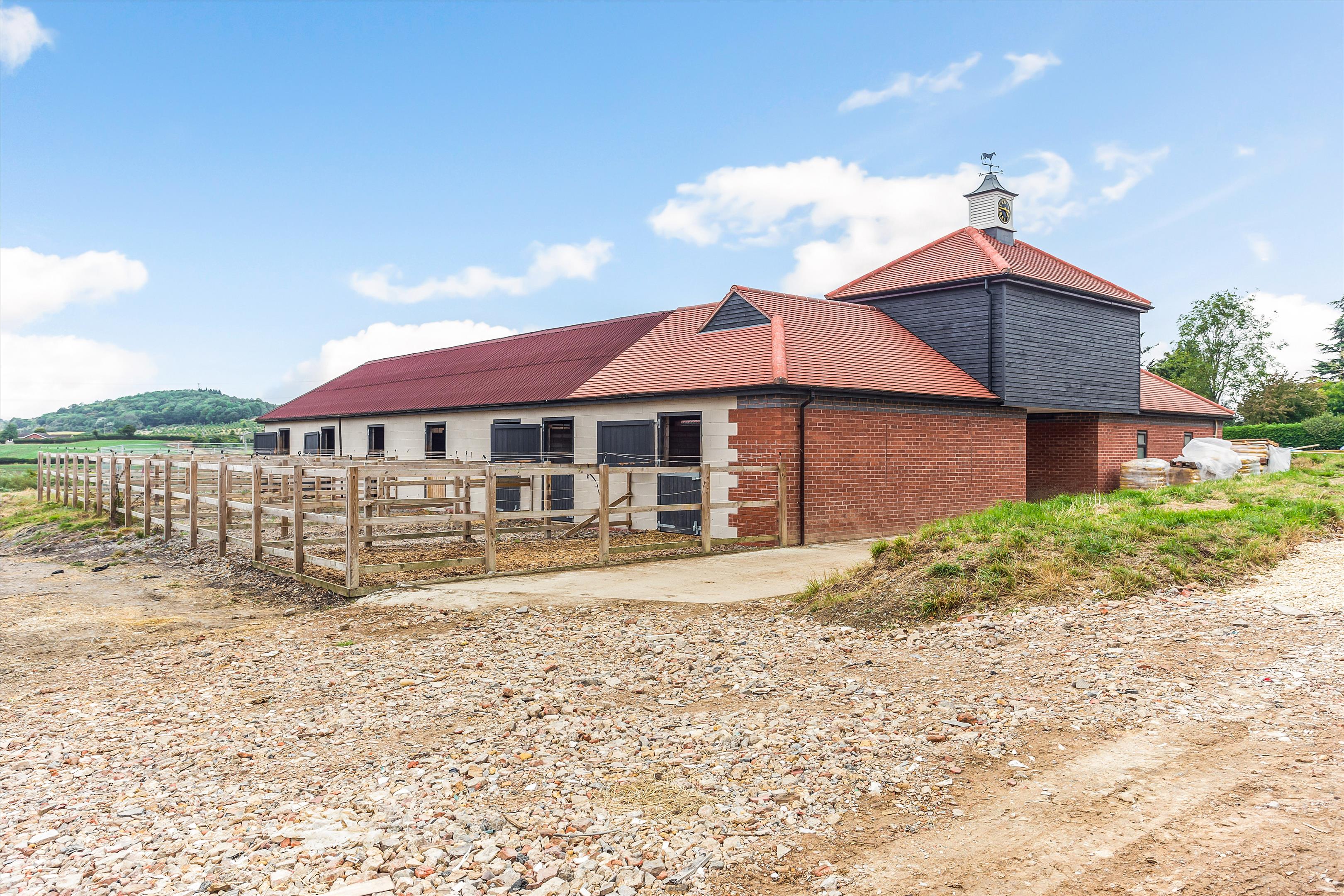 Constructed in 2021/2022, this stylish yard offers ten 12' x 12' stables, some of which benefit from connected external turn-out pens, a tack room and wash bay. Electricity and water are connected.