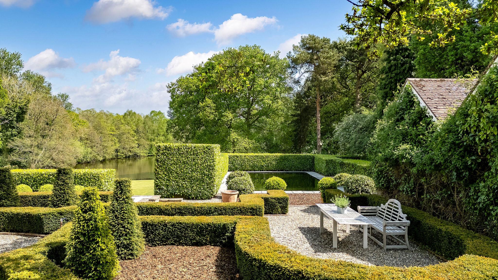 At the front of the house a beautiful topiary garden with lavender beds framed by immaculate box hedging, divided by formal gravelled paths.