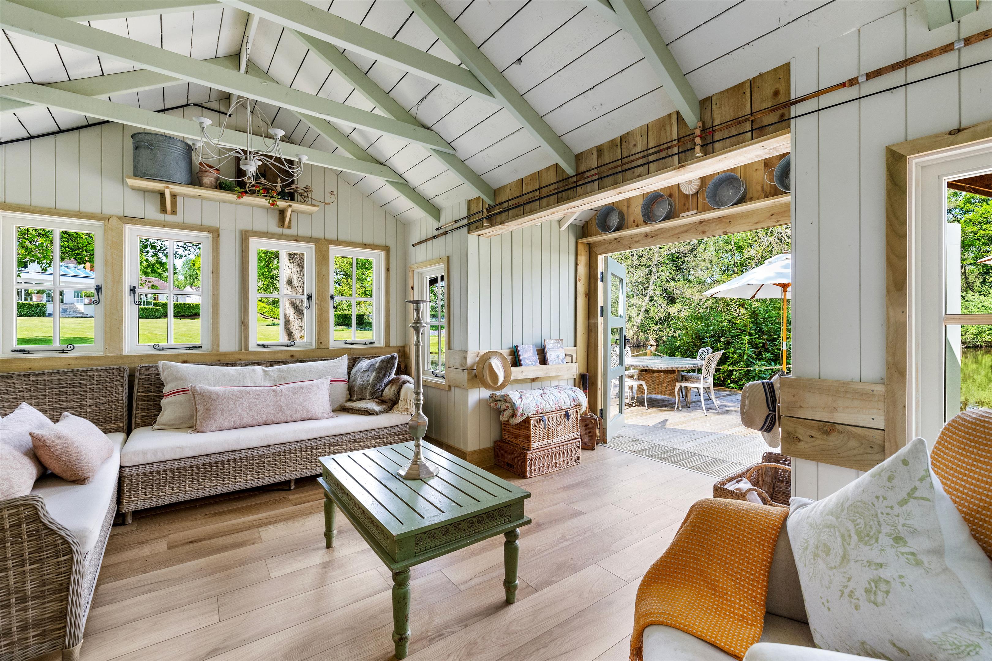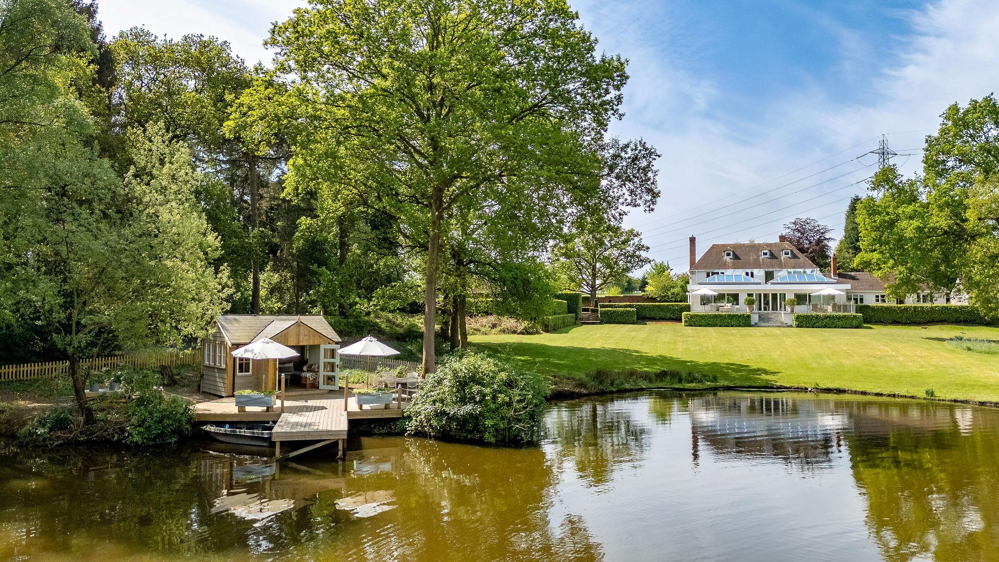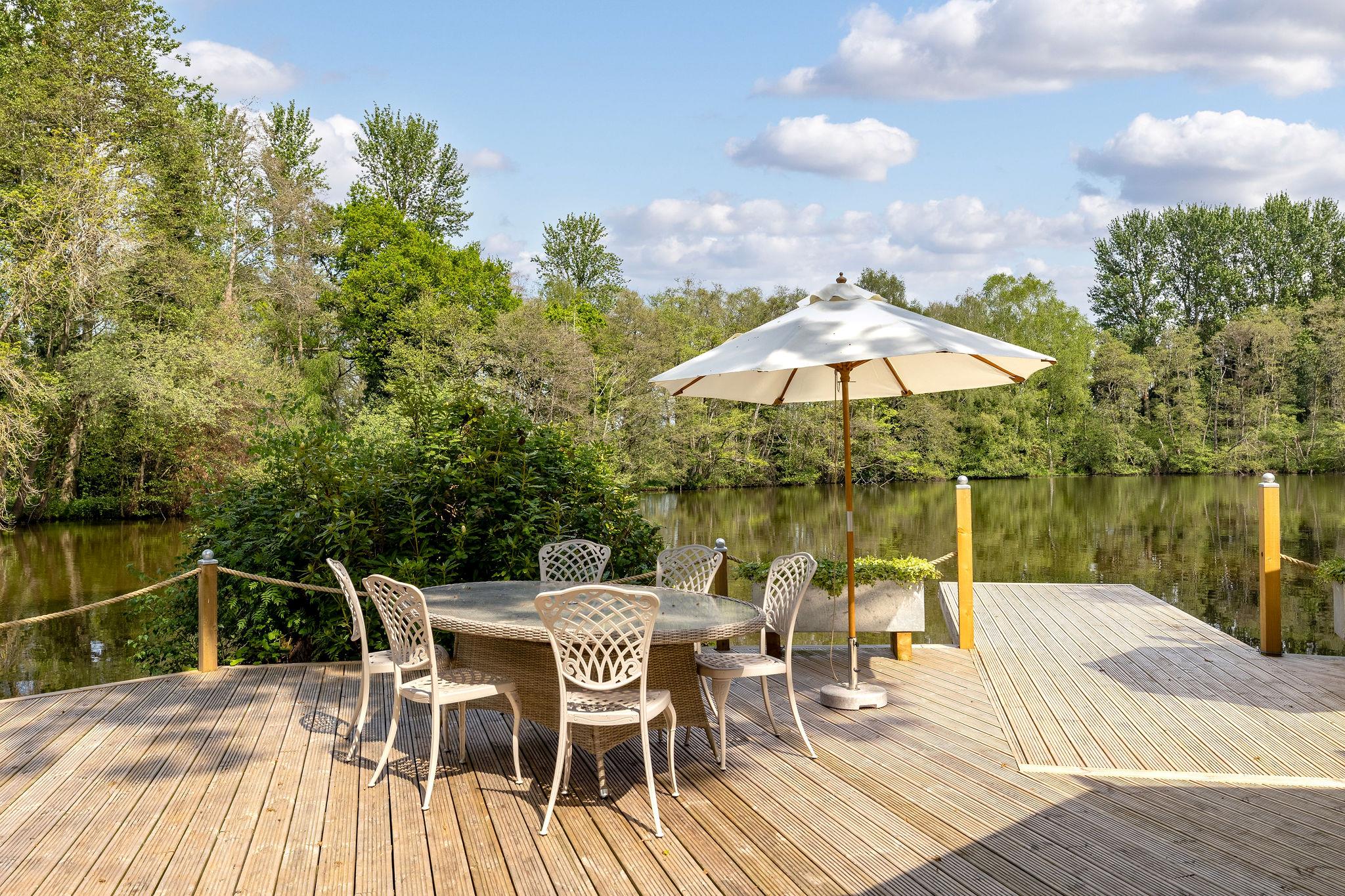 A delightful lake house has decking and a landing stage with views of the lake and woodland.